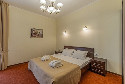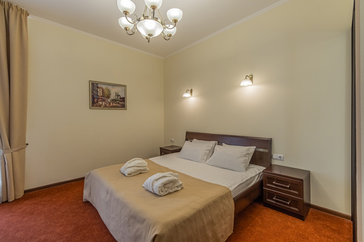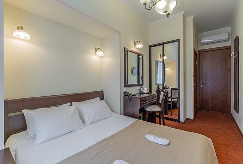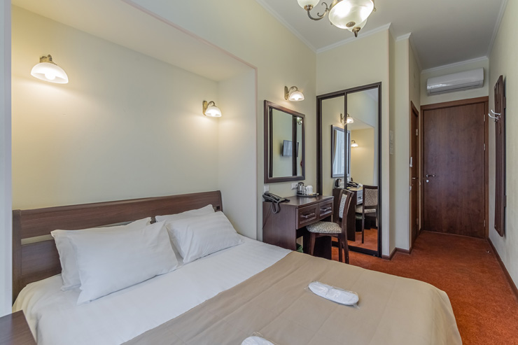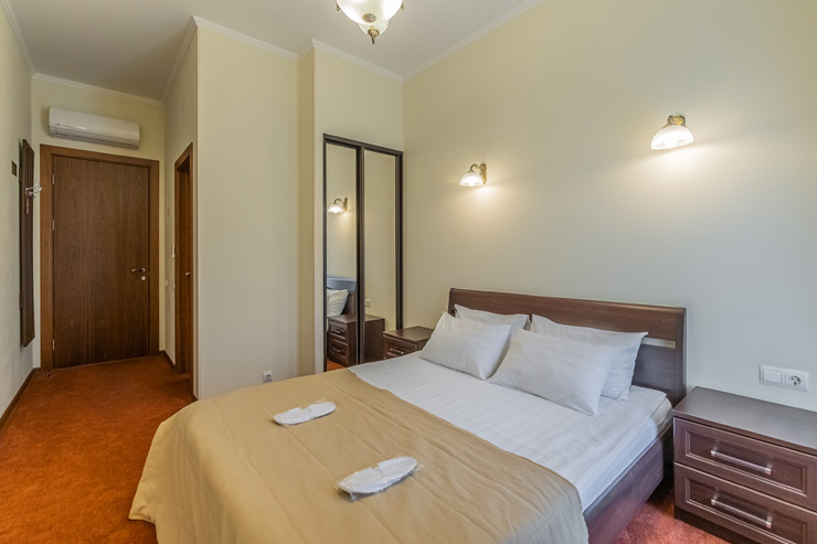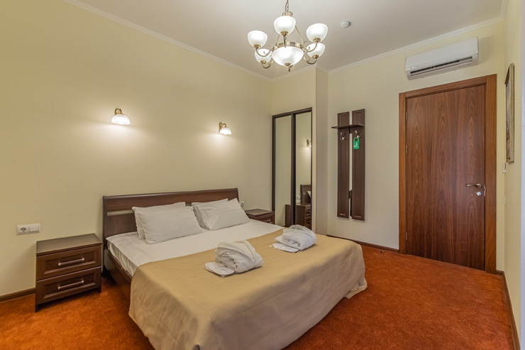 В номере: вешалка, зеркало, кровать двуспальная, прикроватные тумбочки, стол, стулья, шкаф, кондиционер, мини-холодильник, телевизор, чайная станция, чайный набор посуды, электрочайник
