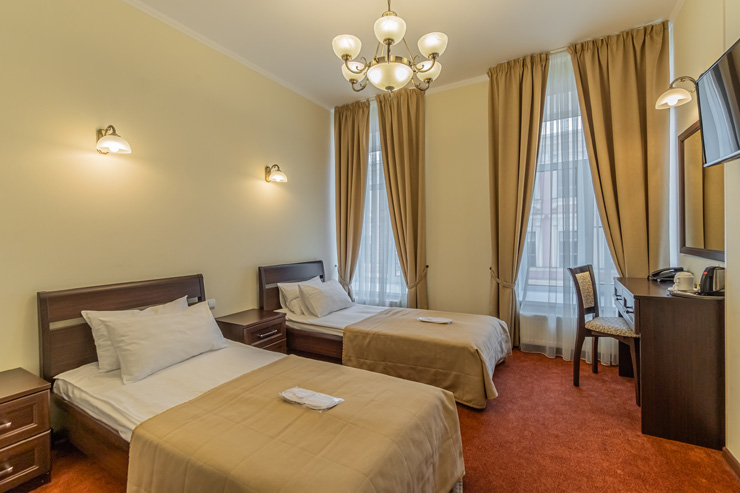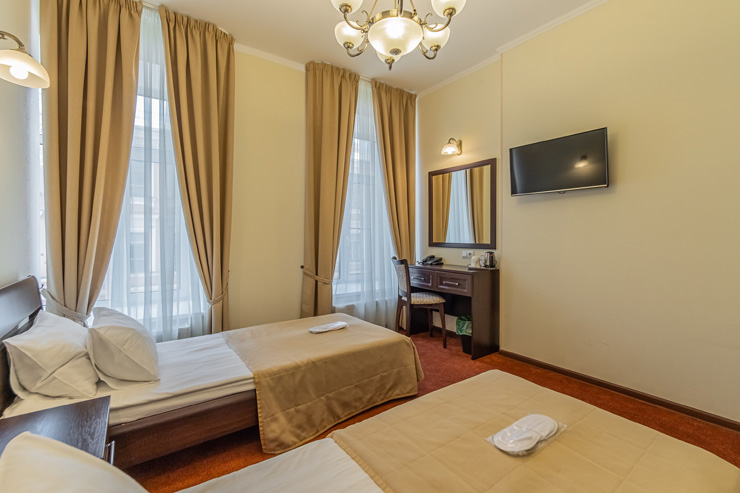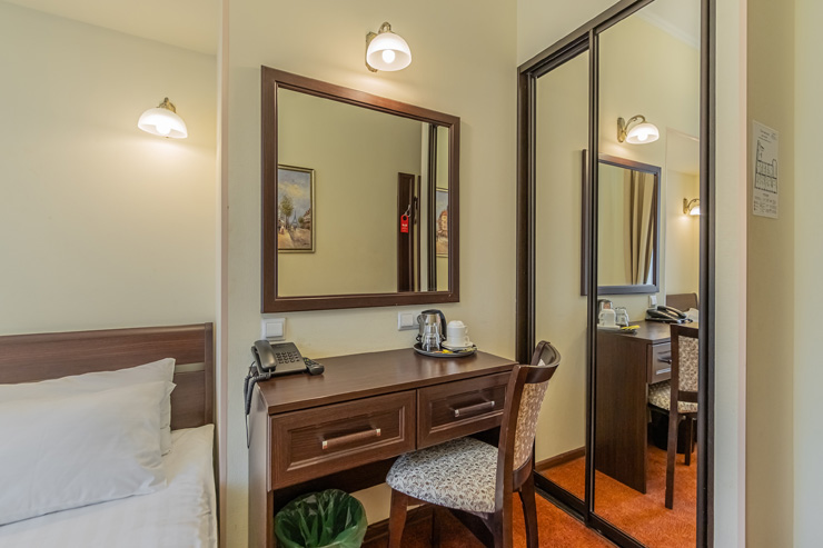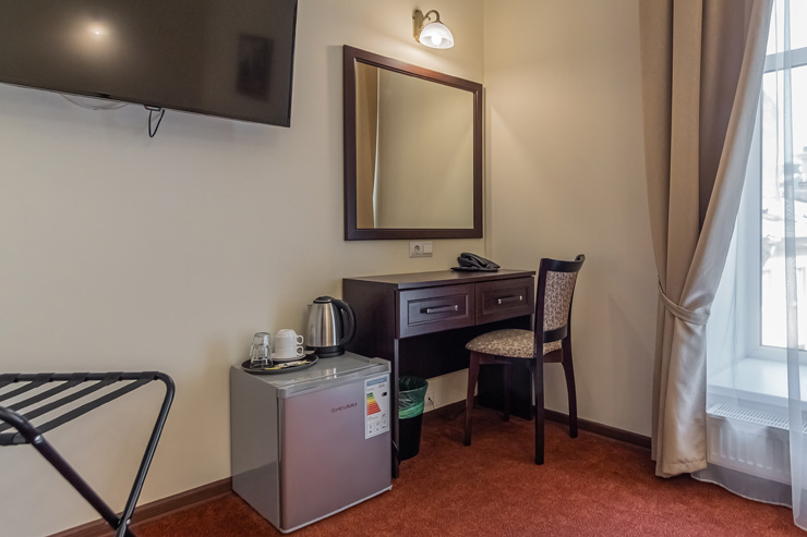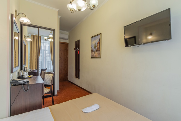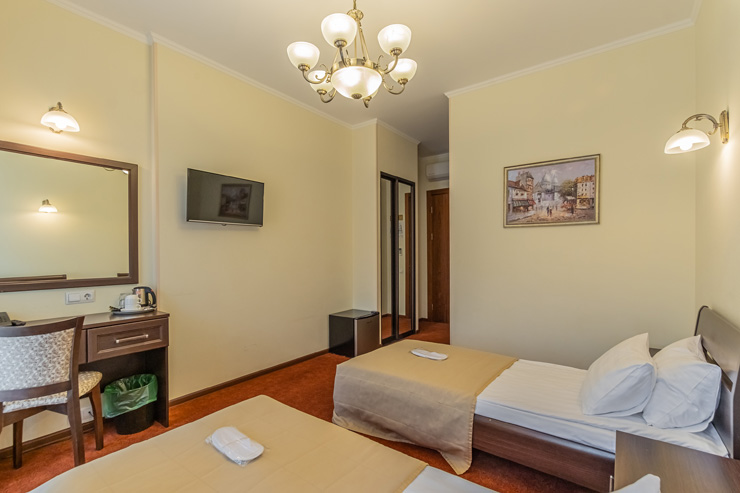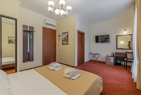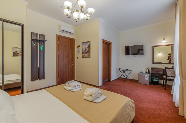 В номере: вешалка, зеркало, кровати односпальные /одна двуспальная кровать, прикроватные тумбочки, стол, стулья, шкаф, кондиционер, мини-холодильник, телевизор, чайная станция, чайный набор посуды, электрочайник