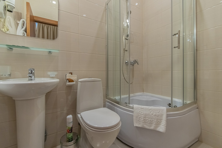 Санузел: с душем, тапочки, туалетные принадлежности, фен, халат