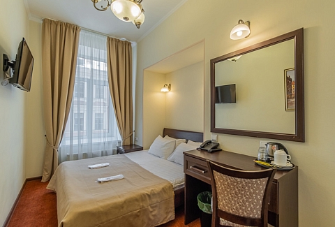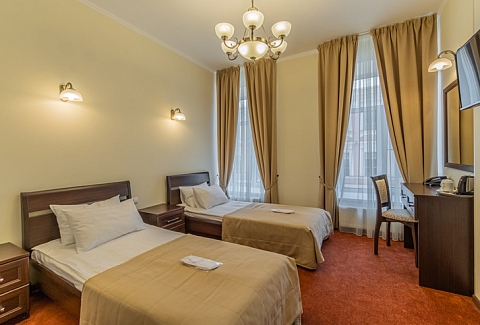 Поездом до ж/д вокзала Московский (г. Санкт-Петербург), далее на метро до станции «Владимирская», далее пройти пешком 480 м до отеля.