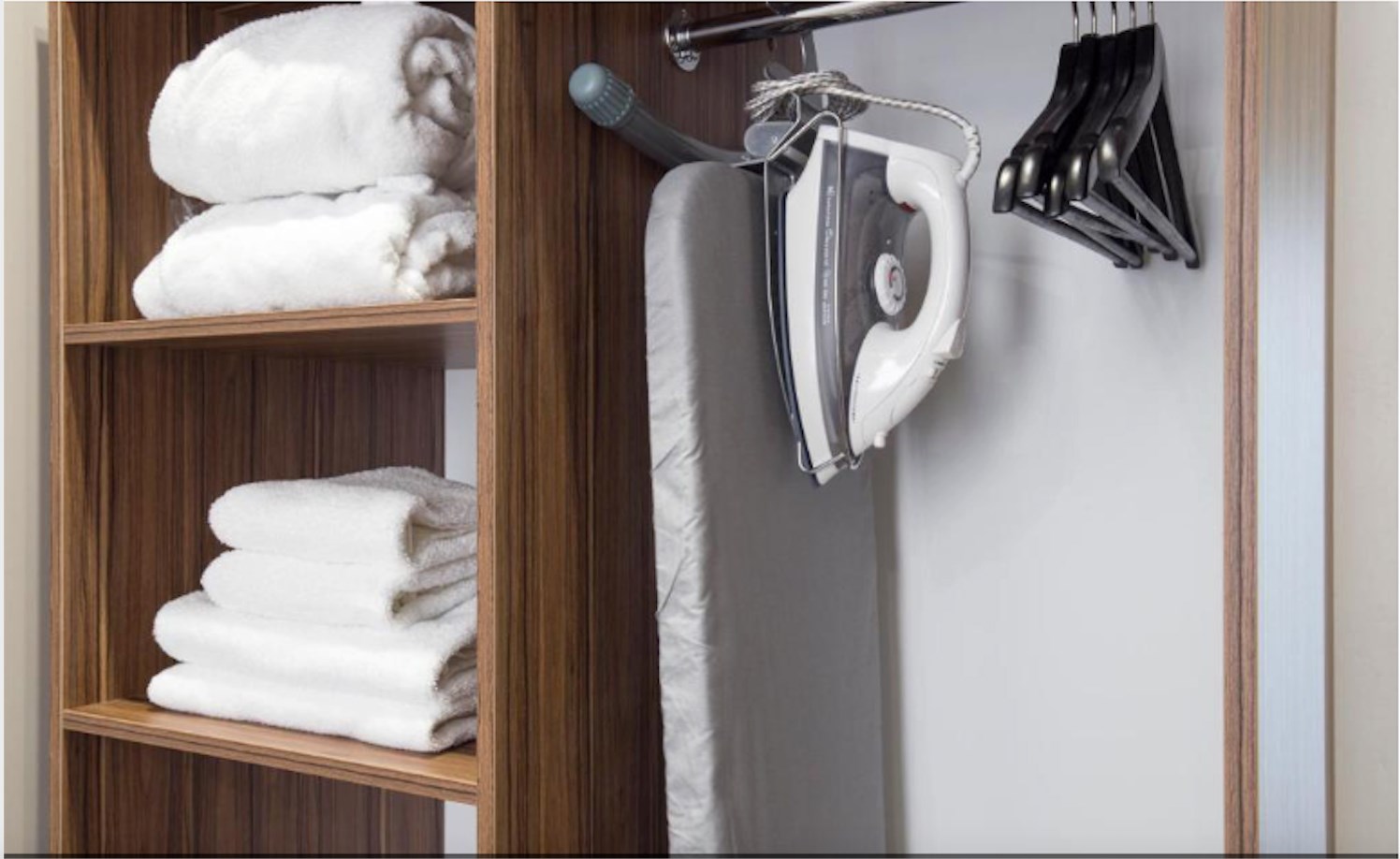В номере: вешалка, зеркало, кровать двуспальная, прикроватные тумбочки, шкаф, кондиционер, сейф, телевизор, утюг, чайная станция, чайный набор посуды