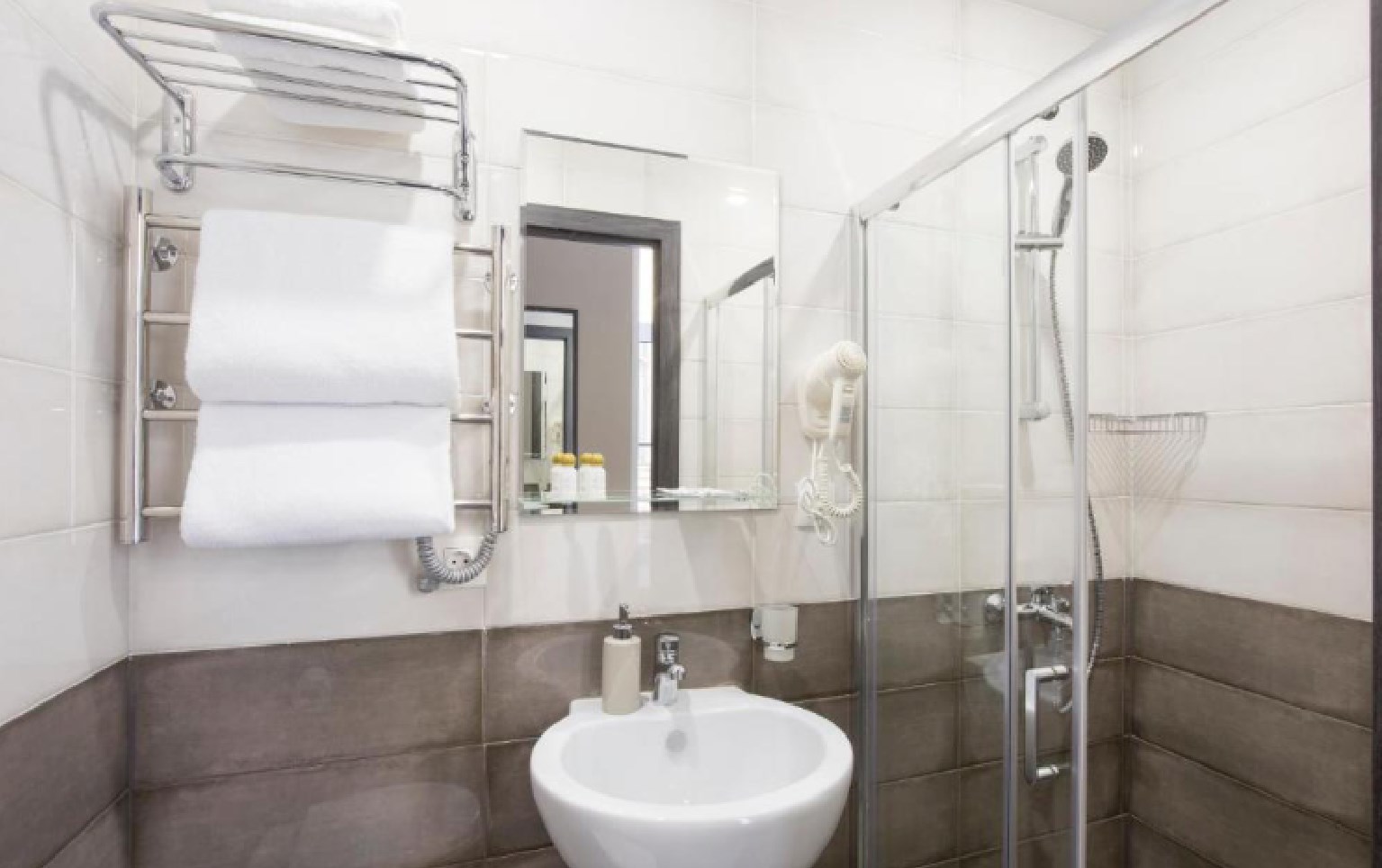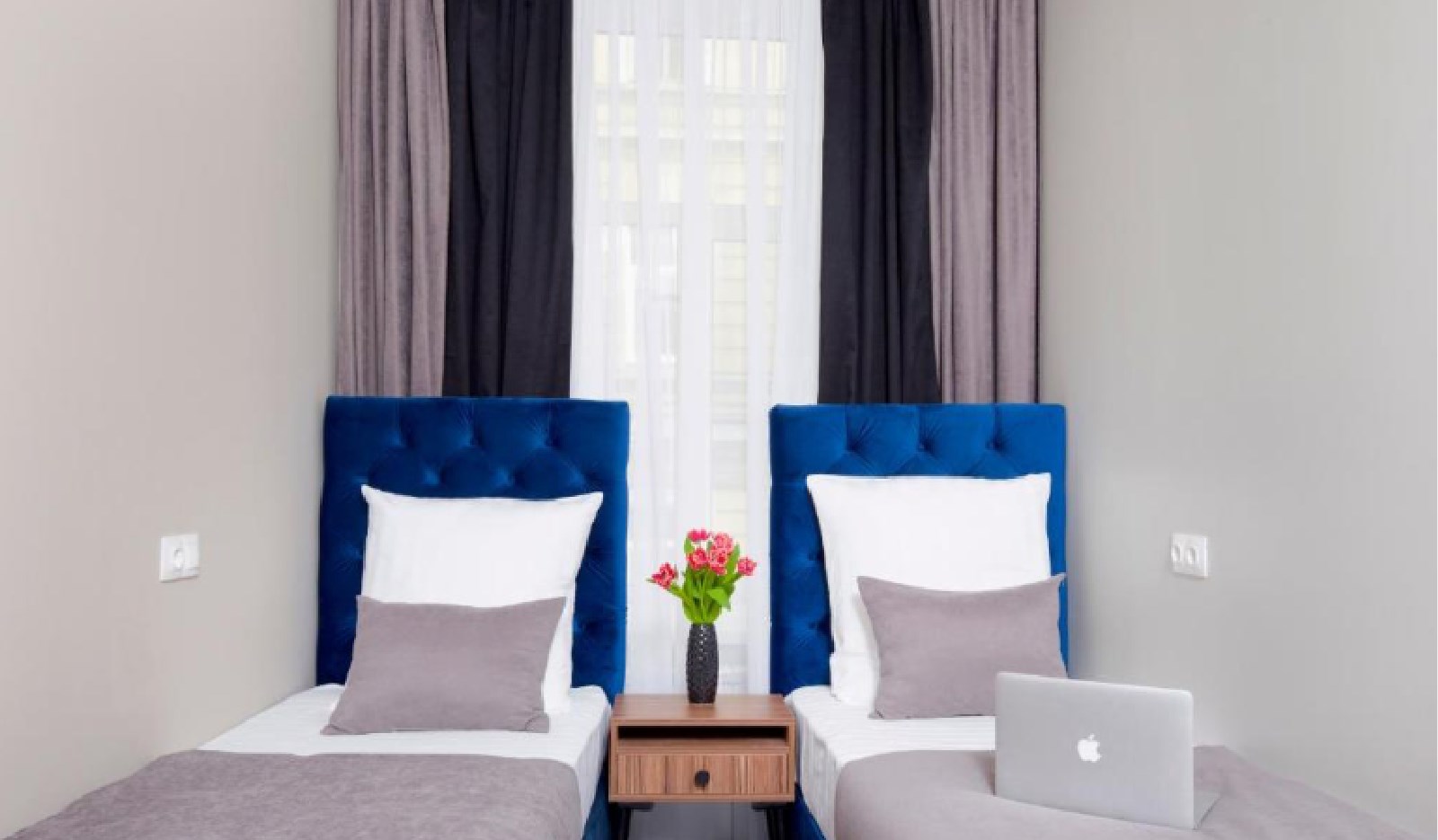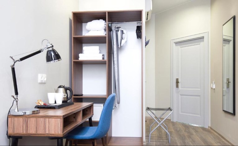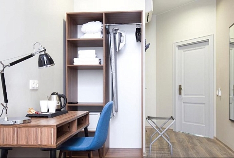 В номере: вешалка, зеркало, кровати односпальные, прикроватная тумбочка, стол, стул, шкаф, кондиционер, сейф, утюг, чайная станция, чайный набор посуды