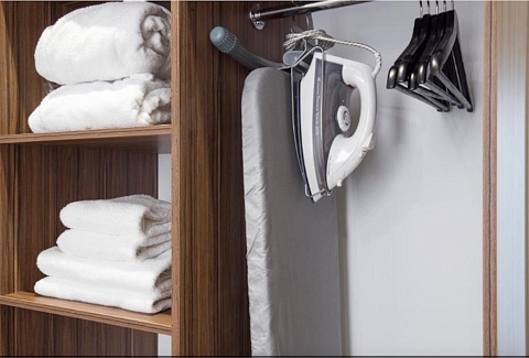 В номере: вешалка, зеркало, кровать двуспальная, прикроватные тумбочки, шкаф, кондиционер, сейф, утюг, чайная станция, чайный набор посуды
