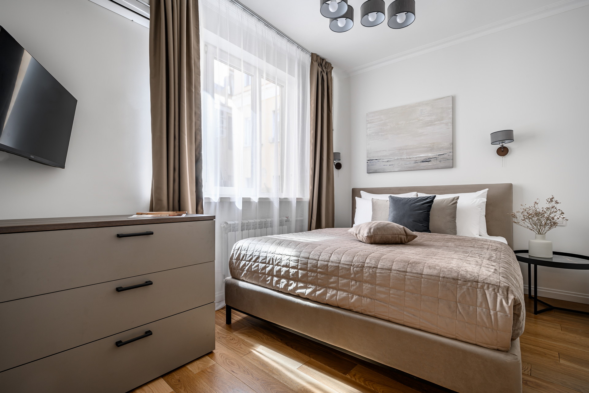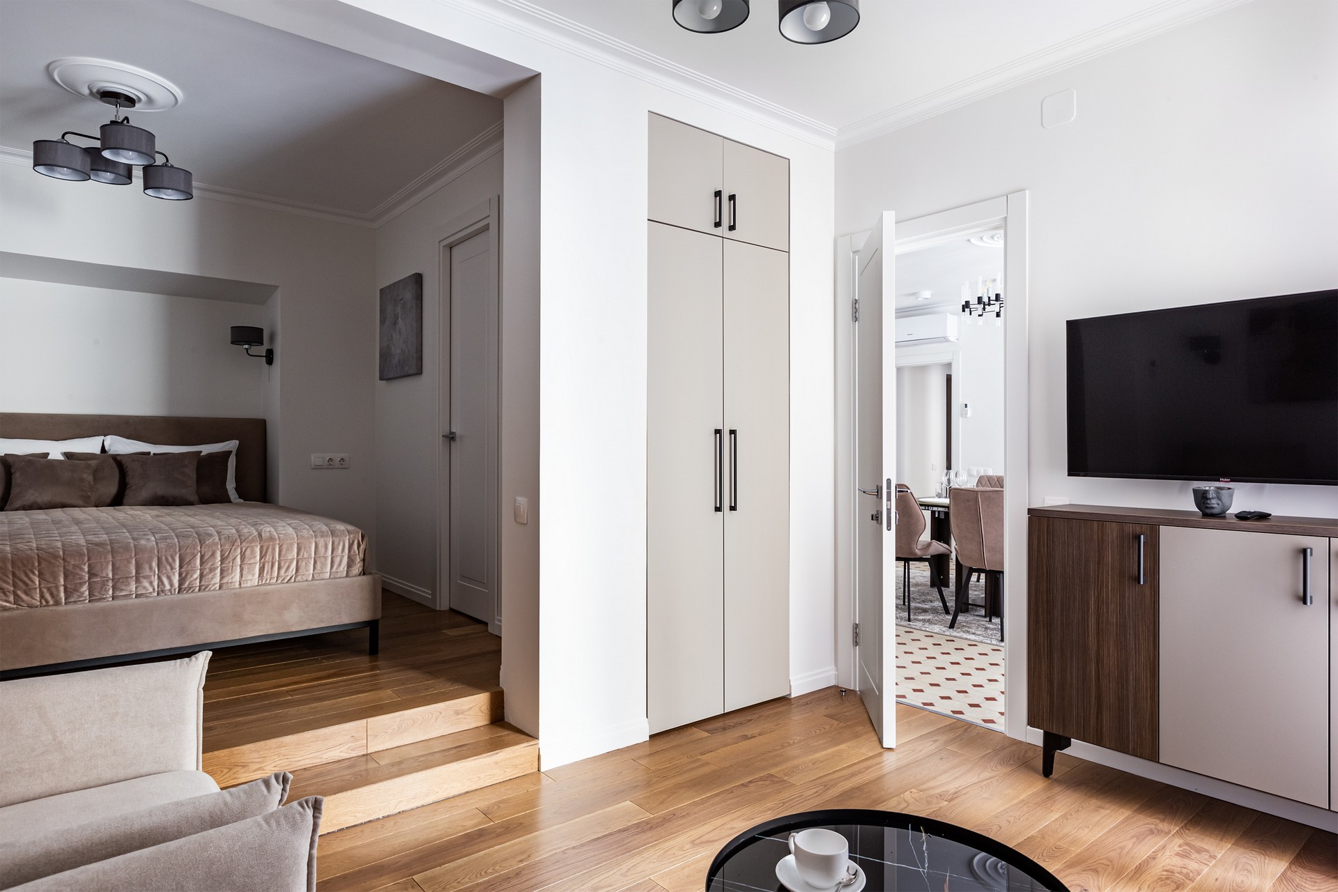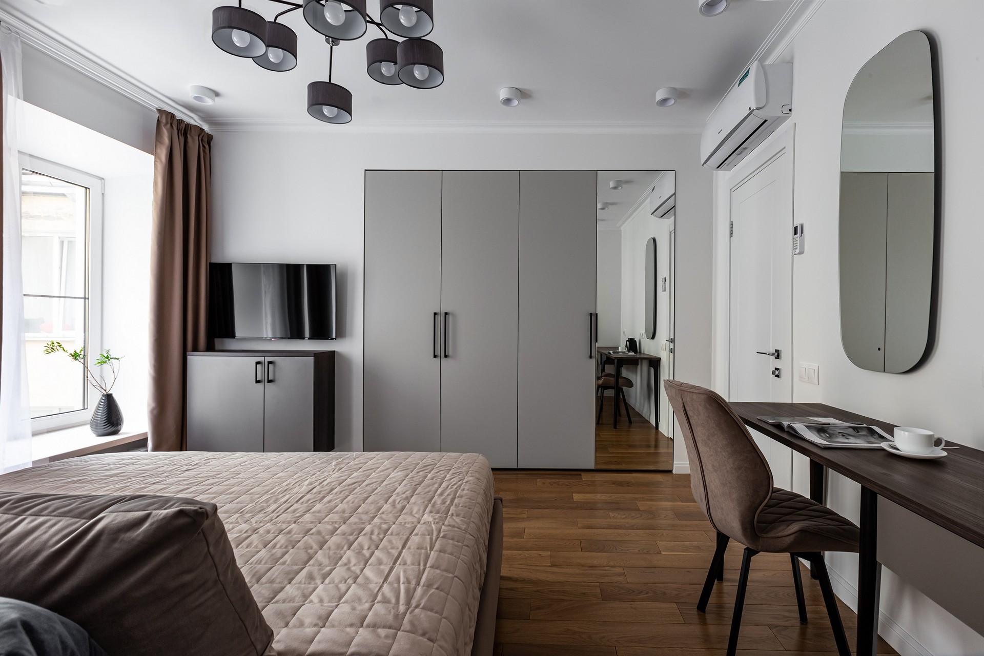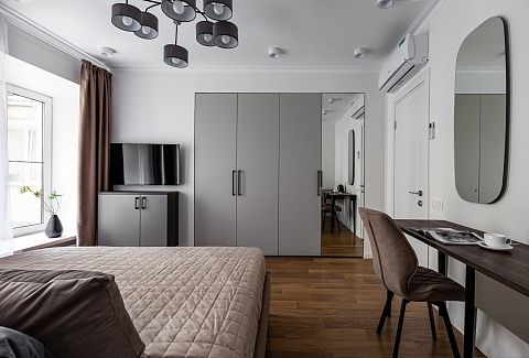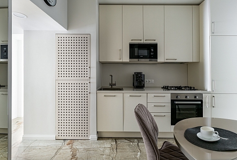 В номере: вешалка, диван раскладной, комод, кровать двуспальная, кухонная мебель, набор мягкой мебели, прикроватные столики, стол, столик журнальный, столик кофейный, стол обеденный, стулья, шкаф, гладильная доска, духовой шкаф, кондиционер, микроволновая печь, набор посуды, плита газовая, стиральная машина, сушилка для белья, телевизор ЖК, утюг, холодильник, чайник, чайный набор посуды