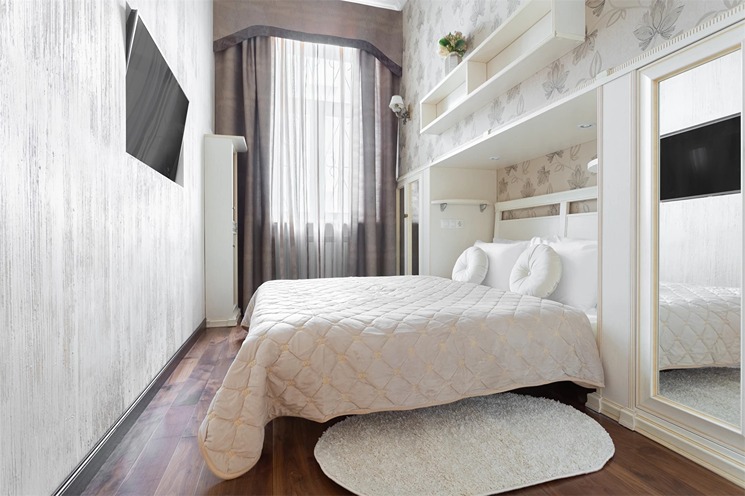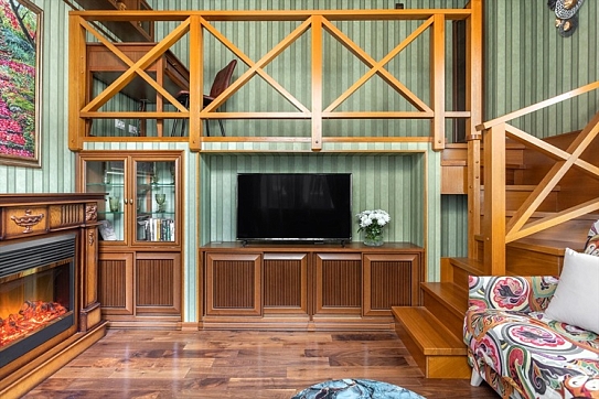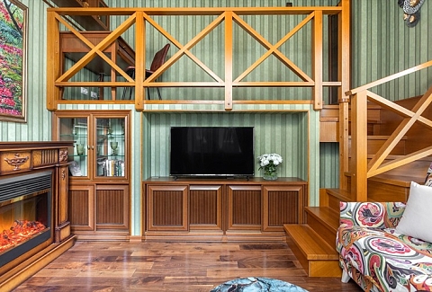 В номере: вешалка, диван раскладной, зеркало, кровать двуспальная, стол, стулья, шкаф, гладильная доска, духовой шкаф, микроволновая печь, набор посуды, плита газовая, посудомоечная машина, стиральная машина, сушилка для белья, телевизор, утюг, холодильник, электрочайник