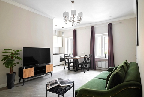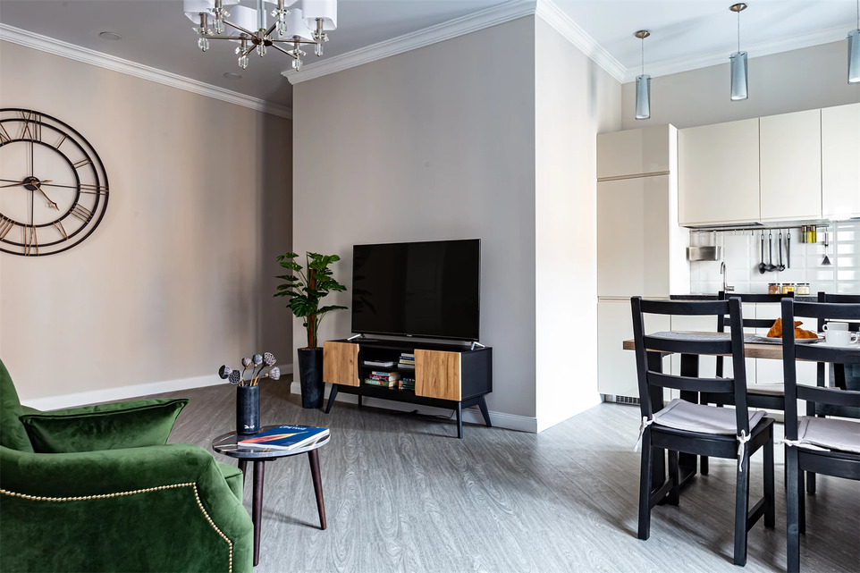 Рукой подать и до знаменитого острова Новая Голландия — центра притяжения с его садами, выставочными павильонами и уютными ресторанами. А вернувшись после дня, полного впечатлений, можно оценить, как каждая деталь в квартире создана для того, чтобы пребывание было по-домашнему комфортным и беззаботным.Просторные шестьдесят квадратных метров этого жилого пространства объединяют две уютные спальни и светлую зону кухни-гостиной. Диван-кровать в общей комнате создает дополнительное место для отдыха, делая апартаменты идеальными для компании друзей или семьи. В спальнях гостей ждет гибкая система размещения: каждая двуспальная кровать по желанию легко трансформируется в две односпальные, чтобы каждый обрел свой идеальный уголок для сна. Чтобы подготовить все к приезду, стоит заранее поделиться предпочтениями по конфигурации спальных мест.