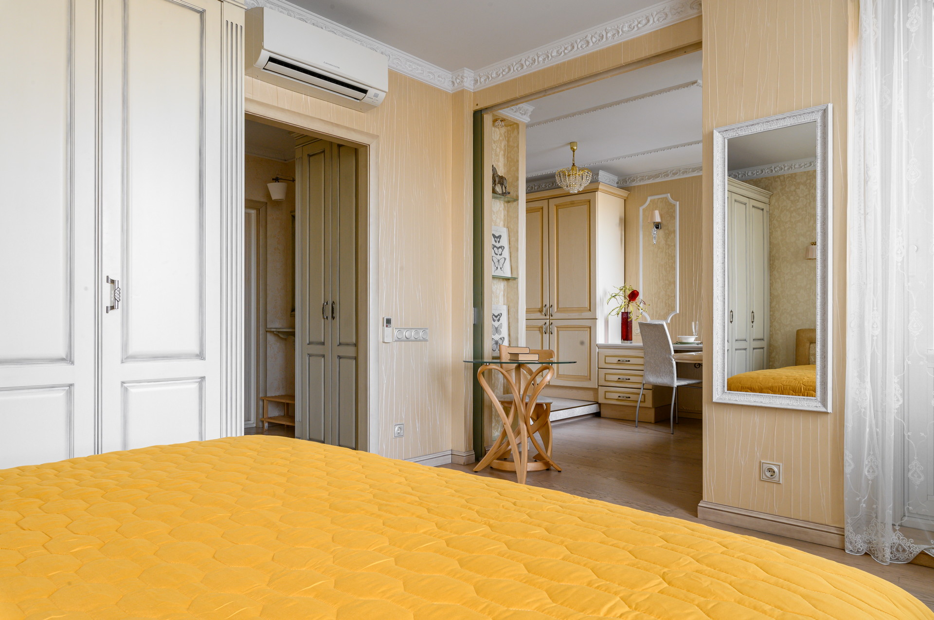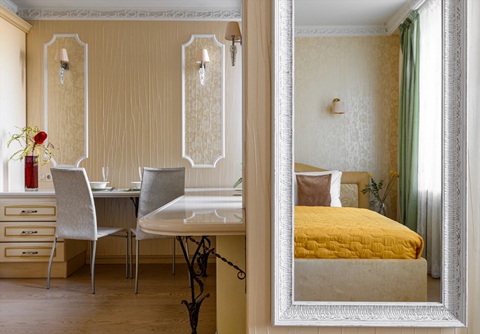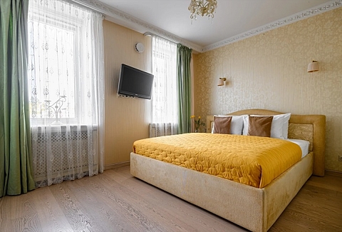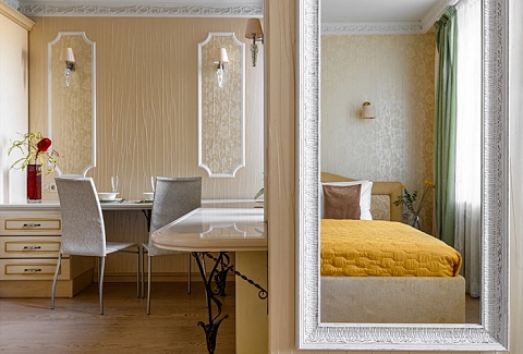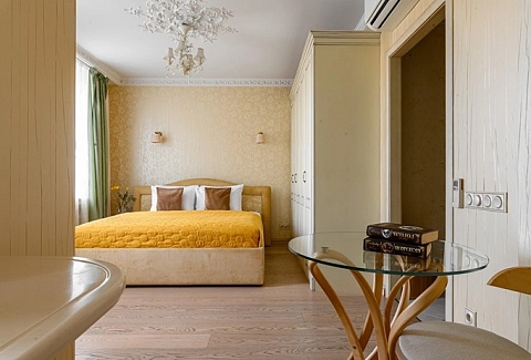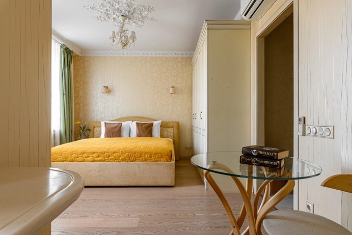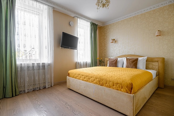 В номере: вешалка, зеркало, кровать двуспальная, прикроватные тумбочки, стол, стулья, шкаф, гладильная доска, духовой шкаф, кондиционер, микроволновая печь, набор посуды, плита индукционная, стиральная машина, телевизор, утюг, холодильник, электрочайник