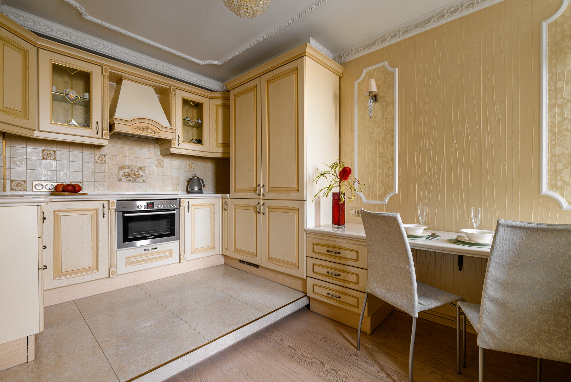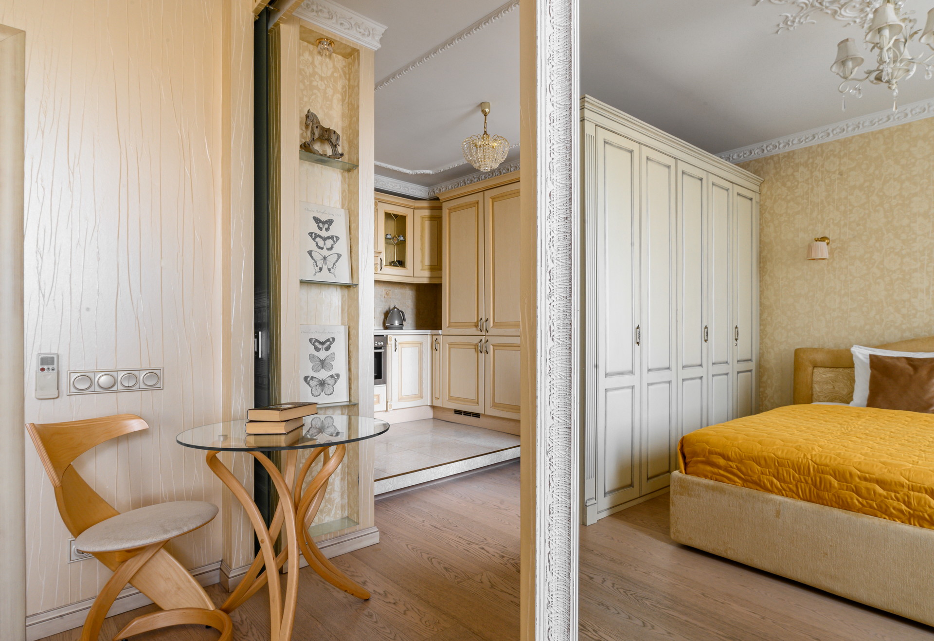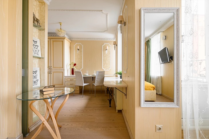 Студия оснащена всем необходимым и идеально подойдет для размещения вдвоем. Дополнительное освещение, продуманный элегантный дизайн, очаровательный балкончик придутся по вкусу всем, кто ценит уют и теплую атмосферу в доме.В спальной зоне гостей ждет мягкая двуспальная кровать «King size», расположившись на которой можно провести вечер за просмотром телевизора Smart TV. В коридоре и спальне для хранения вещей есть вместительные шкафы.Кухня оборудована всем необходимым для готовки: чайник, духовка, индукционная плита на 4 конфорки, вытяжка, холодильник, кухонная утварь и набор посуды.В ванной комнате с теплым полом и ванной вас всегда будут ждать свежие, чистые полотенца и базовые туалетные принадлежности.