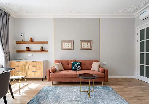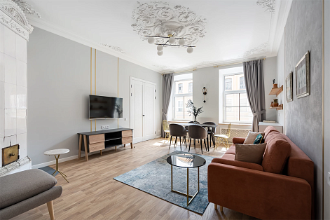 Отсюда пешком можно дойти до Марсового поля, Спаса-на-Крови, Летнего сада и Михайловского замка, постепенно открывая для себя величие города. Гости апартаментов оказываются в пространстве, где яркий дизайнерский характер сочетается с продуманным комфортом для компании до шести человек. Большая гостиная-столовая сразу располагает к отдыху и общению: просторный диван приглашает к вечернему просмотру фильмов на Smart TV, а у окна стоит большой стол, за которым так приятно собираться всем вместе. На кухне, оснащенной всей необходимой техникой, от духовки до посудомоечной машины, легко готовить как быстрый завтрак, так и праздничный ужин. Особое внимание уделено мелочам: в ванной комнате гостей ждет стиральная машина и душ с двумя режимами, включая тропический, а многочисленные шкафы и комоды позволяют с удобством разместить вещи.