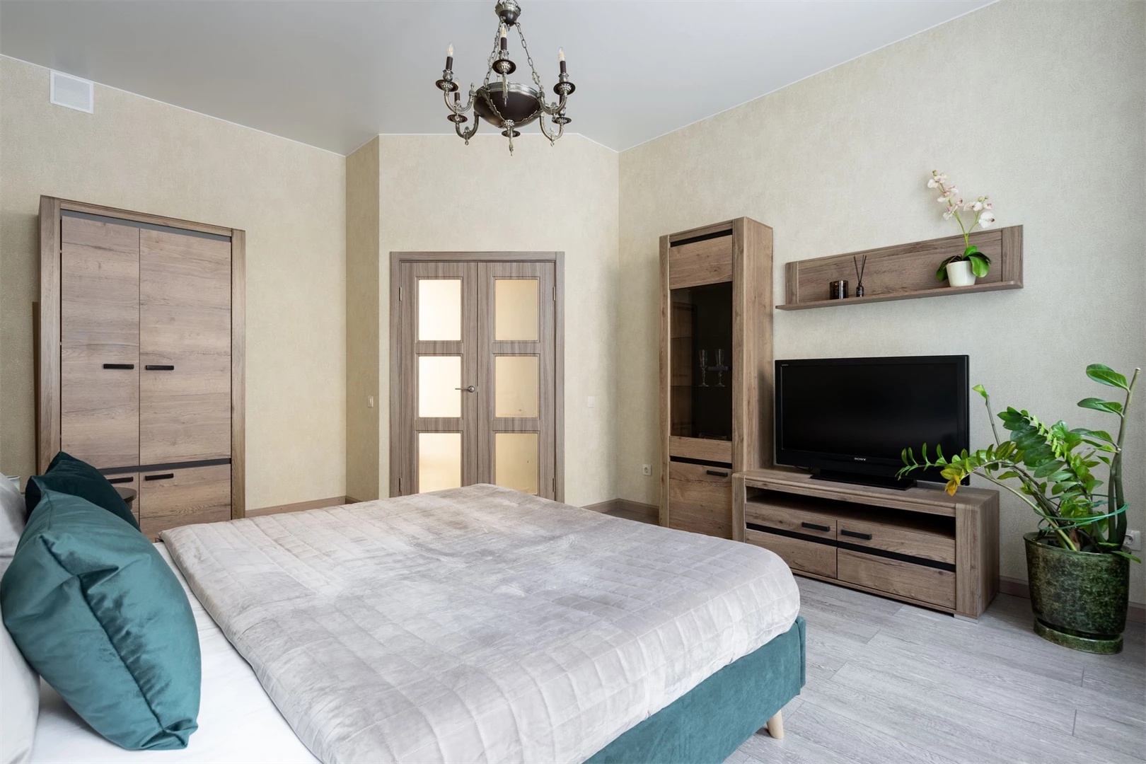 В номере: вешалка, диван раскладной, зеркало, кровать двуспальная, прикроватные тумбочки, стол, стулья, шкаф, гладильная доска, духовой шкаф, микроволновая печь, набор посуды, плита, посудомоечная машина, стиральная машина, сушилка для белья, телевизор, утюг, холодильник, чайник
