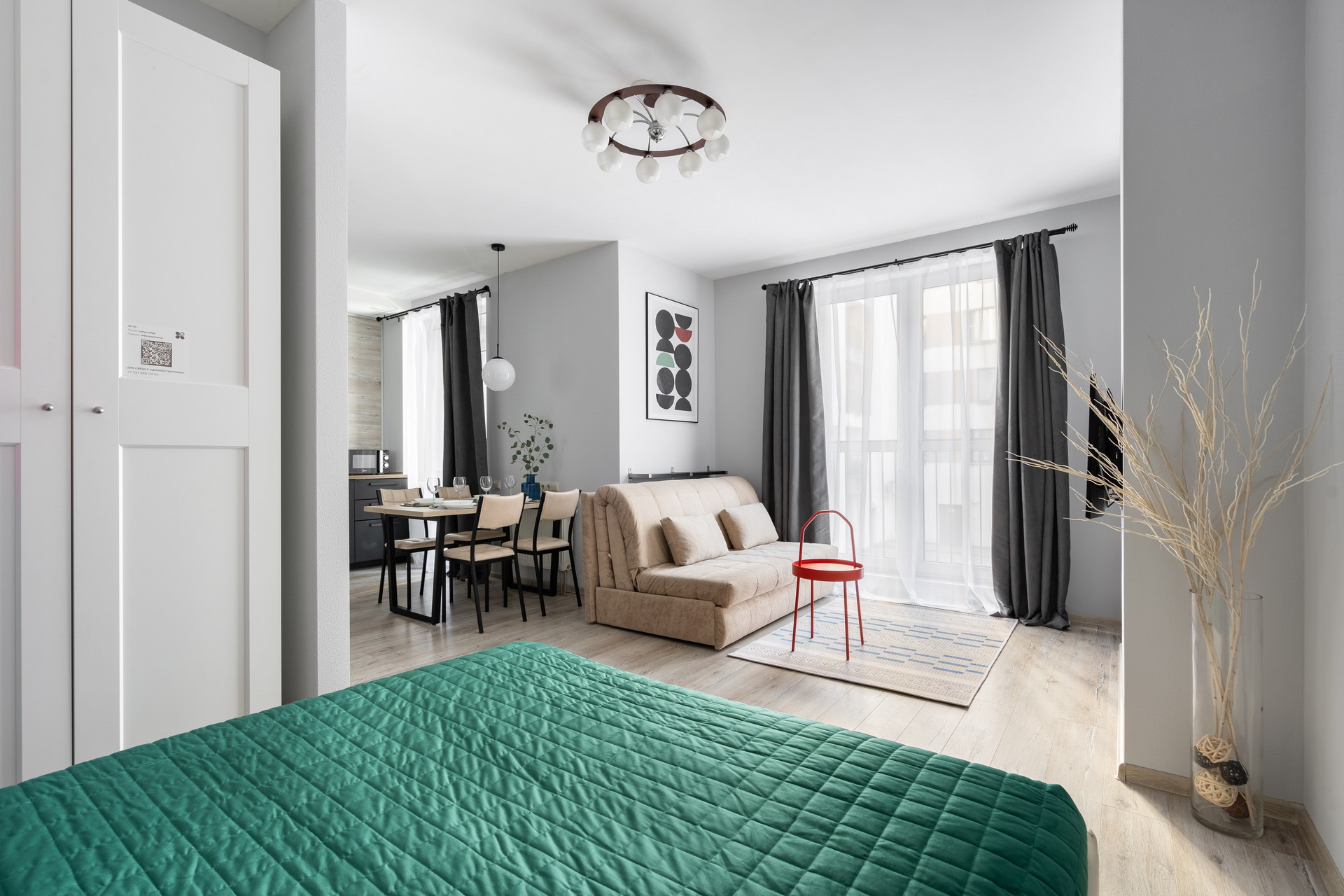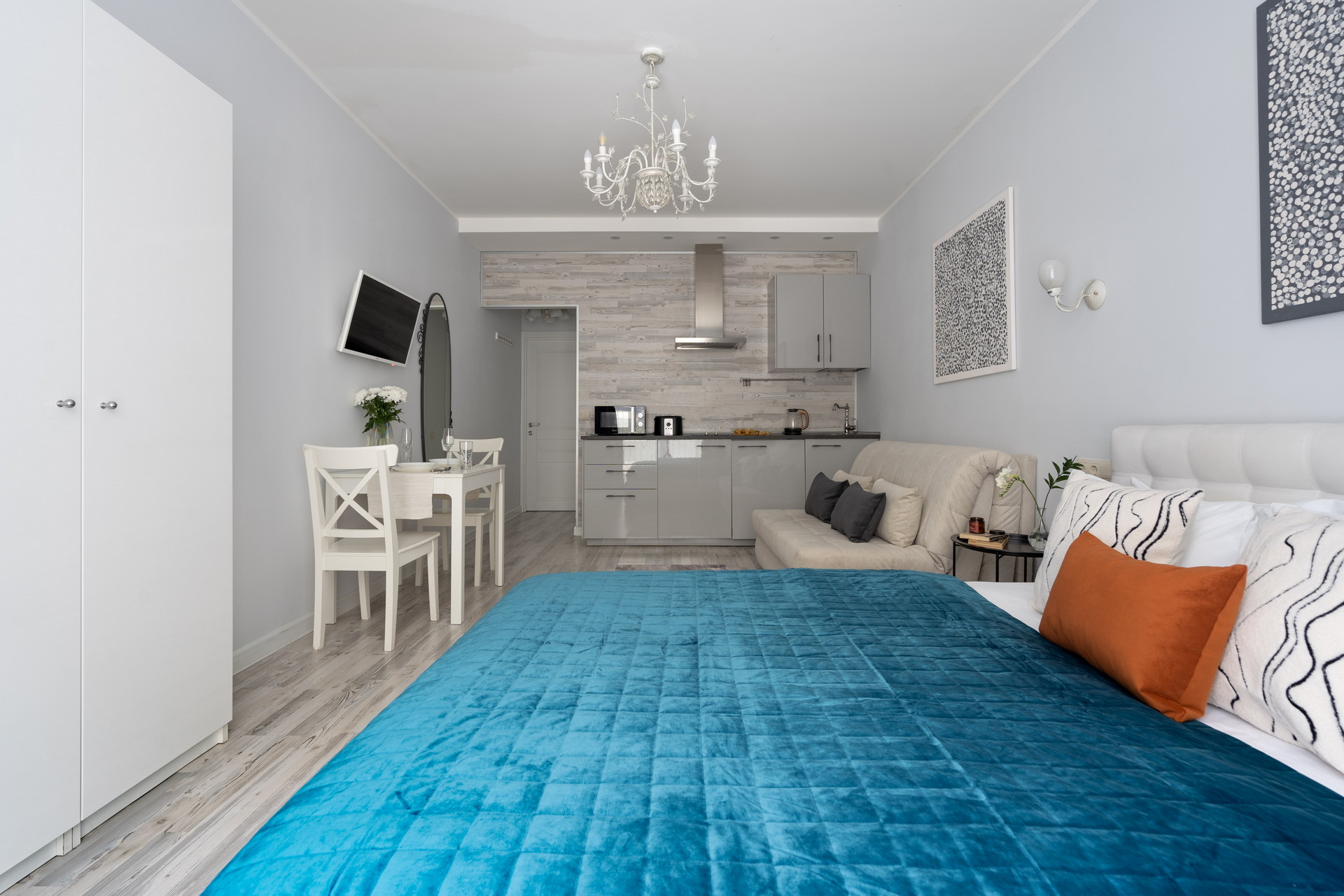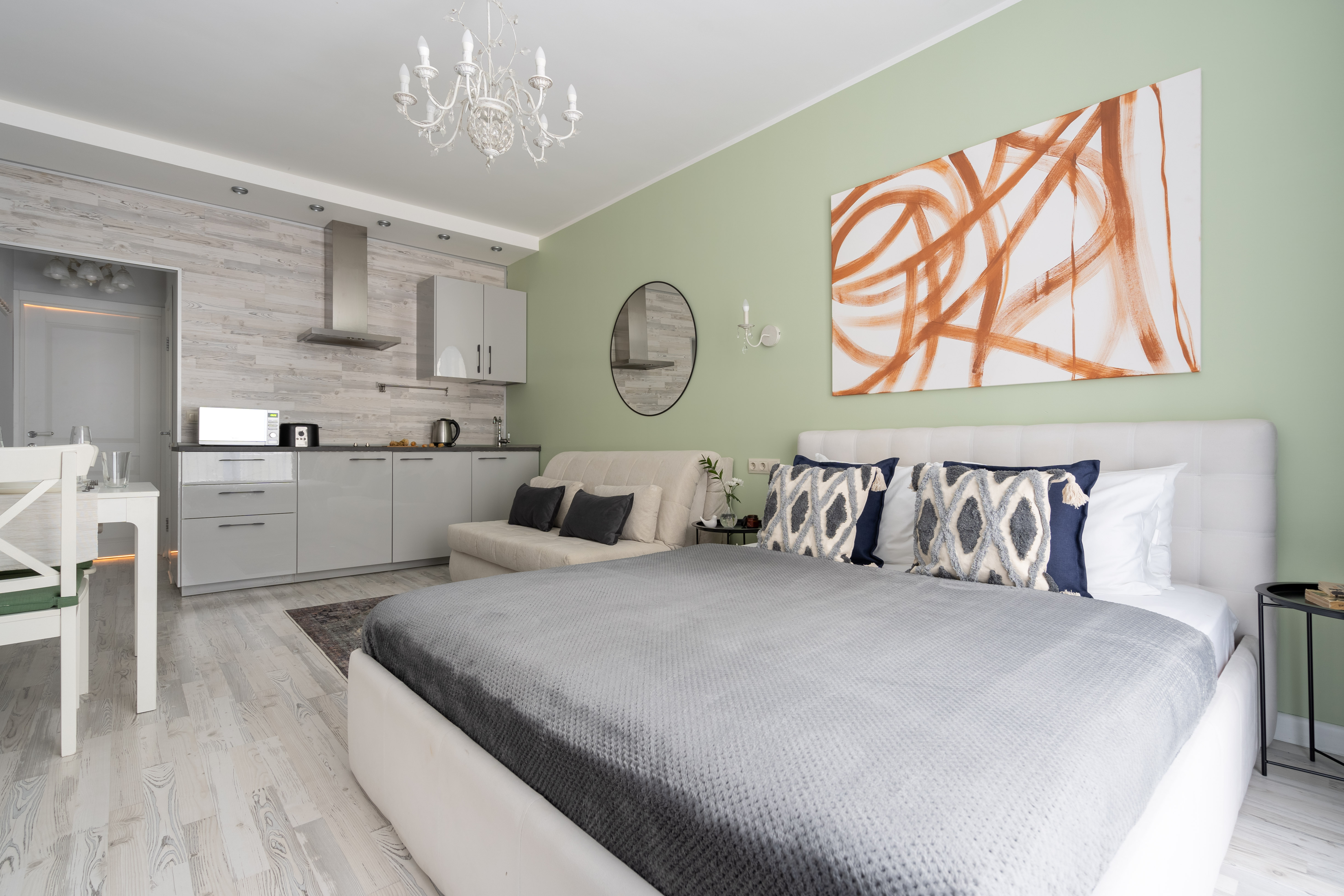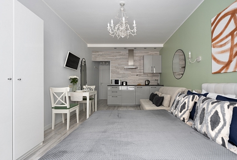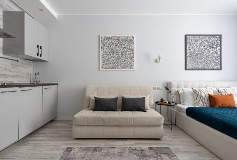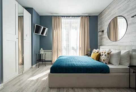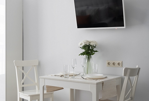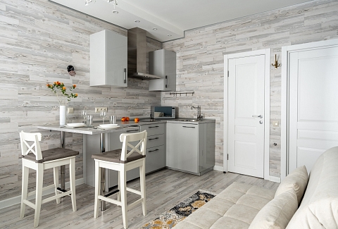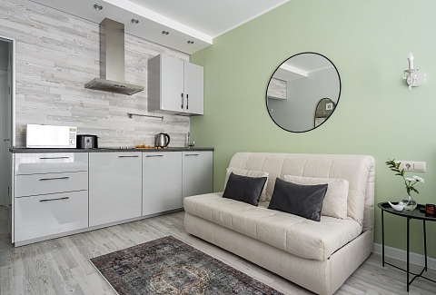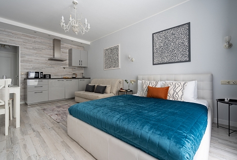 В номере: вешалка, диван раскладной, зеркало, кровать двуспальная, кухонная мебель, прикроватные столики, стеллаж, стол обеденный, стулья, шкаф, гладильная доска, микроволновая печь, набор посуды, плита, стиральная машина, сушилка для белья, телевизор ЖК, утюг, холодильник, чайный набор посуды, электрочайник