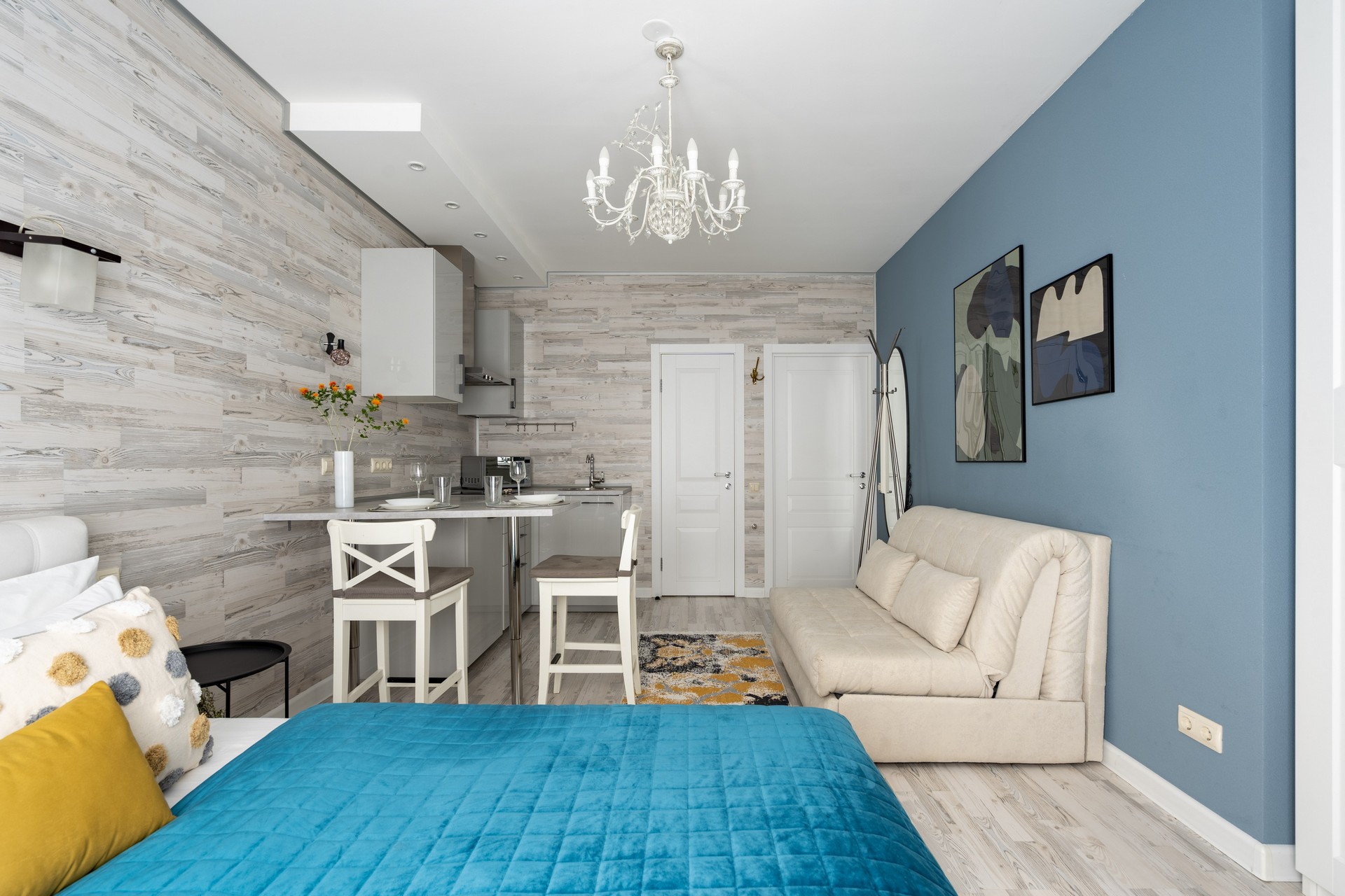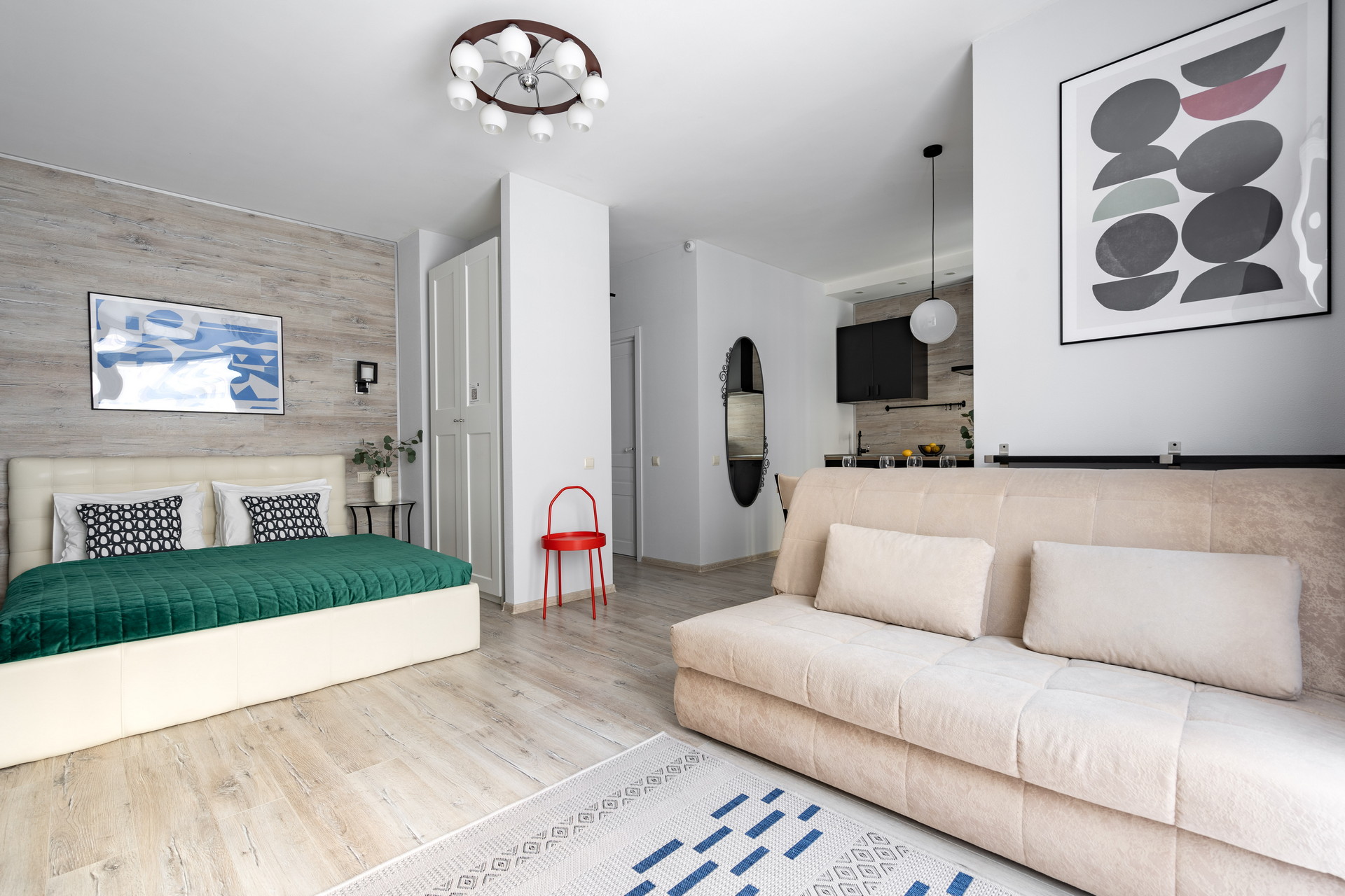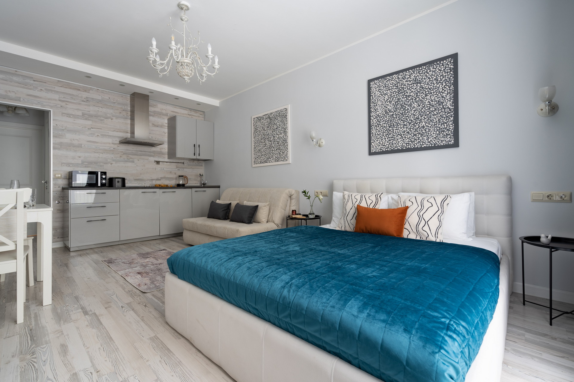В номере: вешалка, диван раскладной, зеркало, кровать двуспальная, кухонная мебель, прикроватные столики, стеллаж, стол обеденный, стулья, шкаф, гладильная доска, микроволновая печь, набор посуды, плита, стиральная машина, сушилка для белья, телевизор ЖК, утюг, холодильник, чайный набор посуды, электрочайник