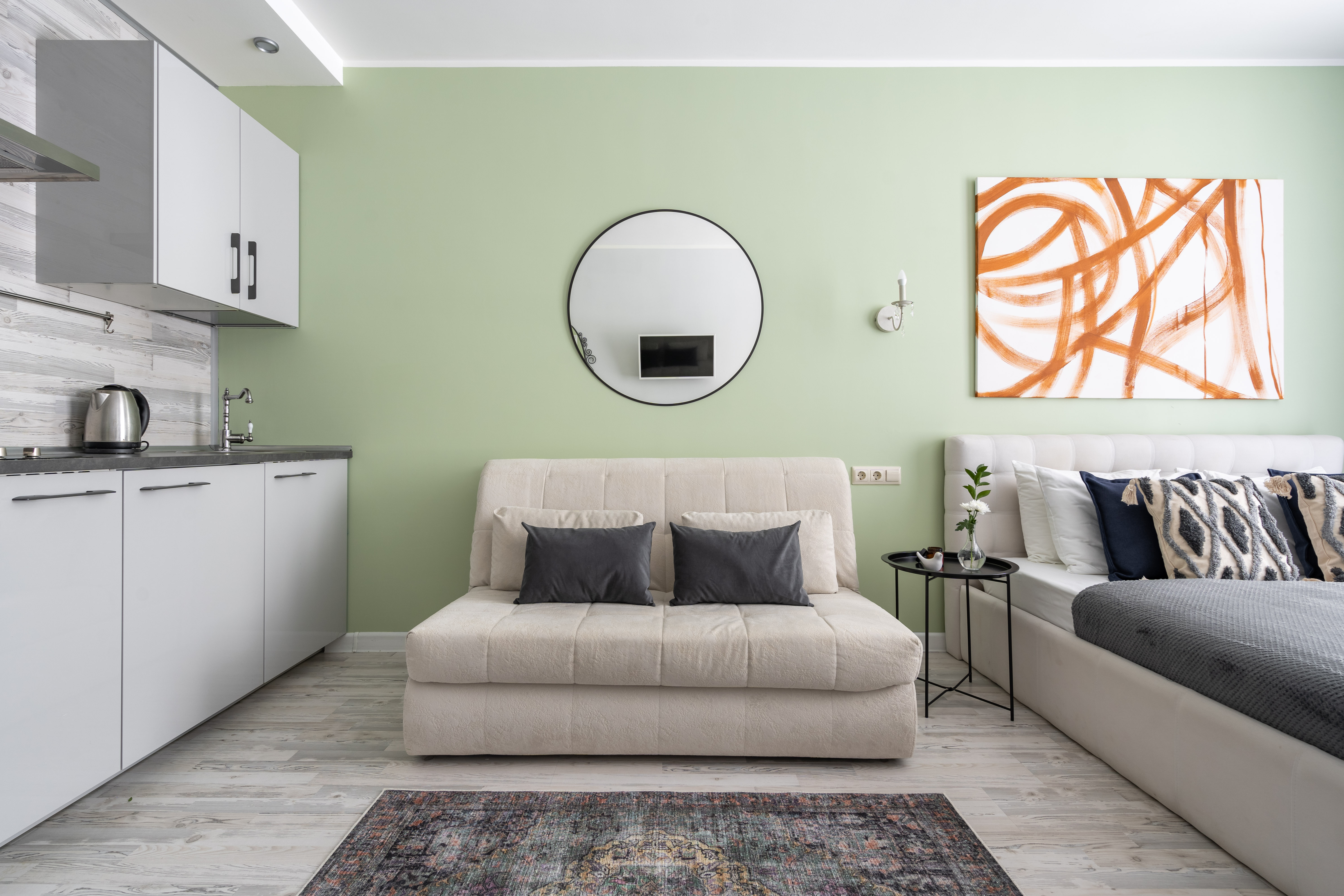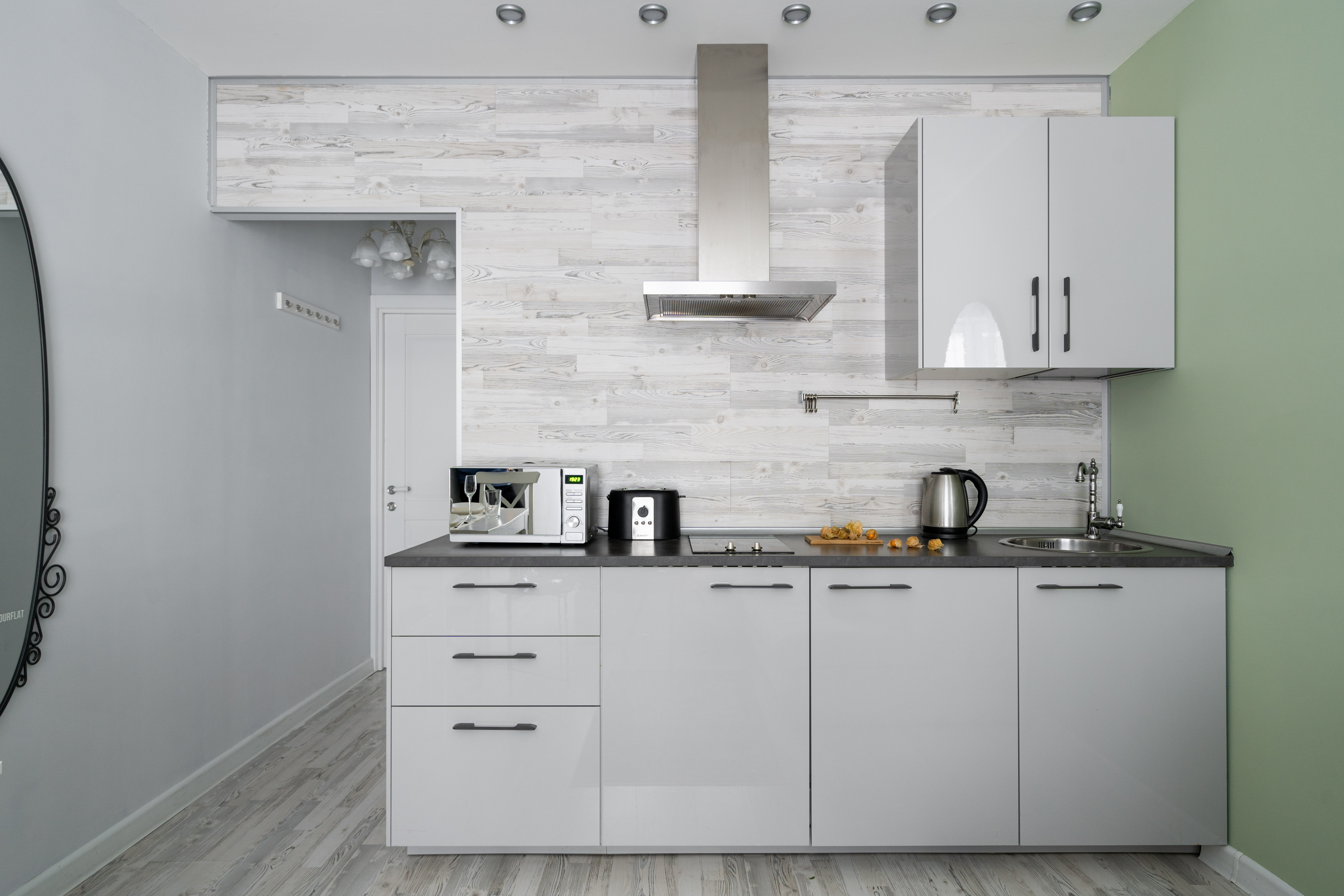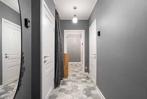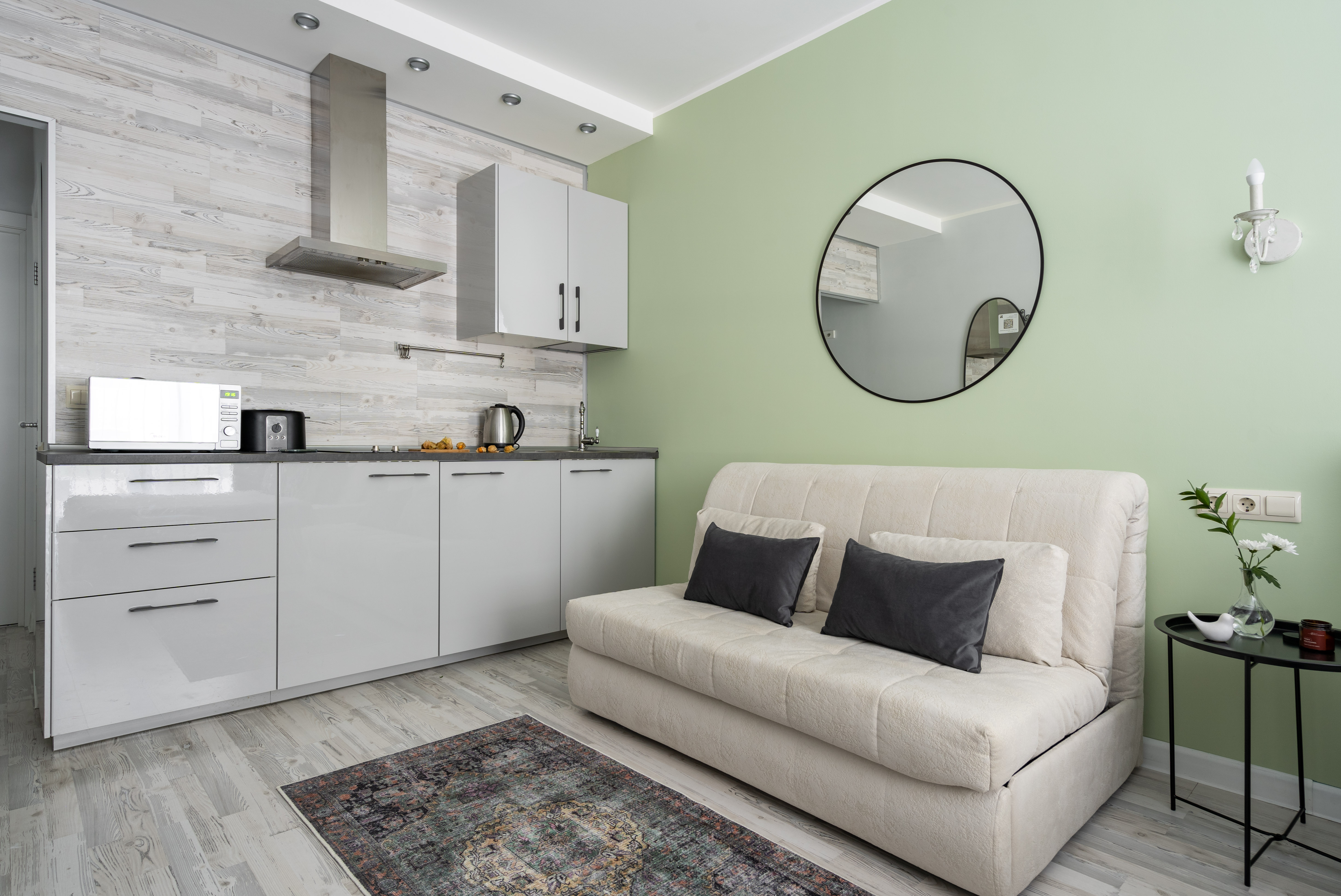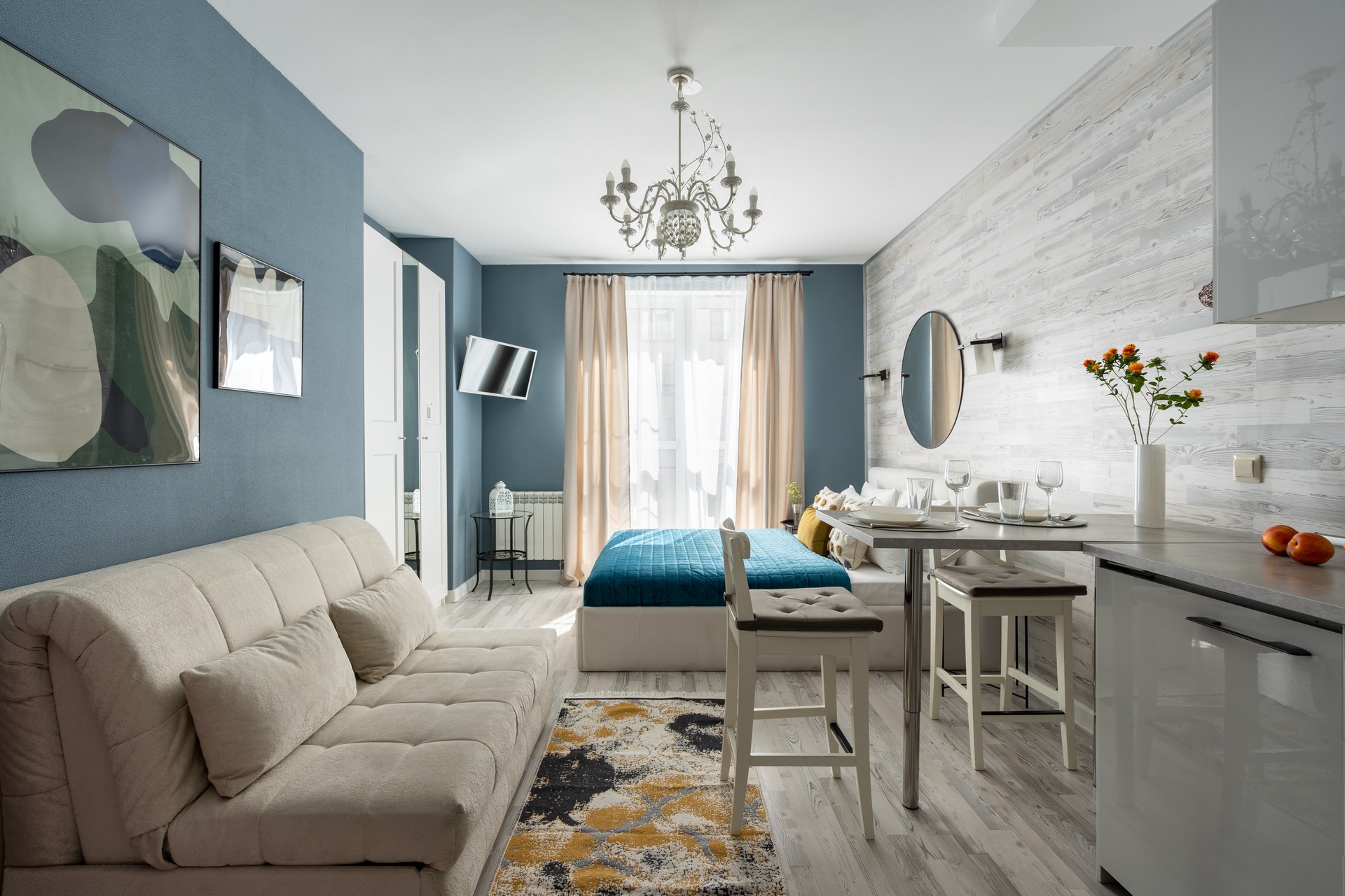 В номере: вешалка, диван раскладной, зеркало, кровать двуспальная, кухонная мебель, прикроватные столики, стеллаж, стол обеденный, стулья, шкаф, гладильная доска, микроволновая печь, набор посуды, плита, стиральная машина, сушилка для белья, телевизор ЖК, утюг, холодильник, чайный набор посуды, электрочайник