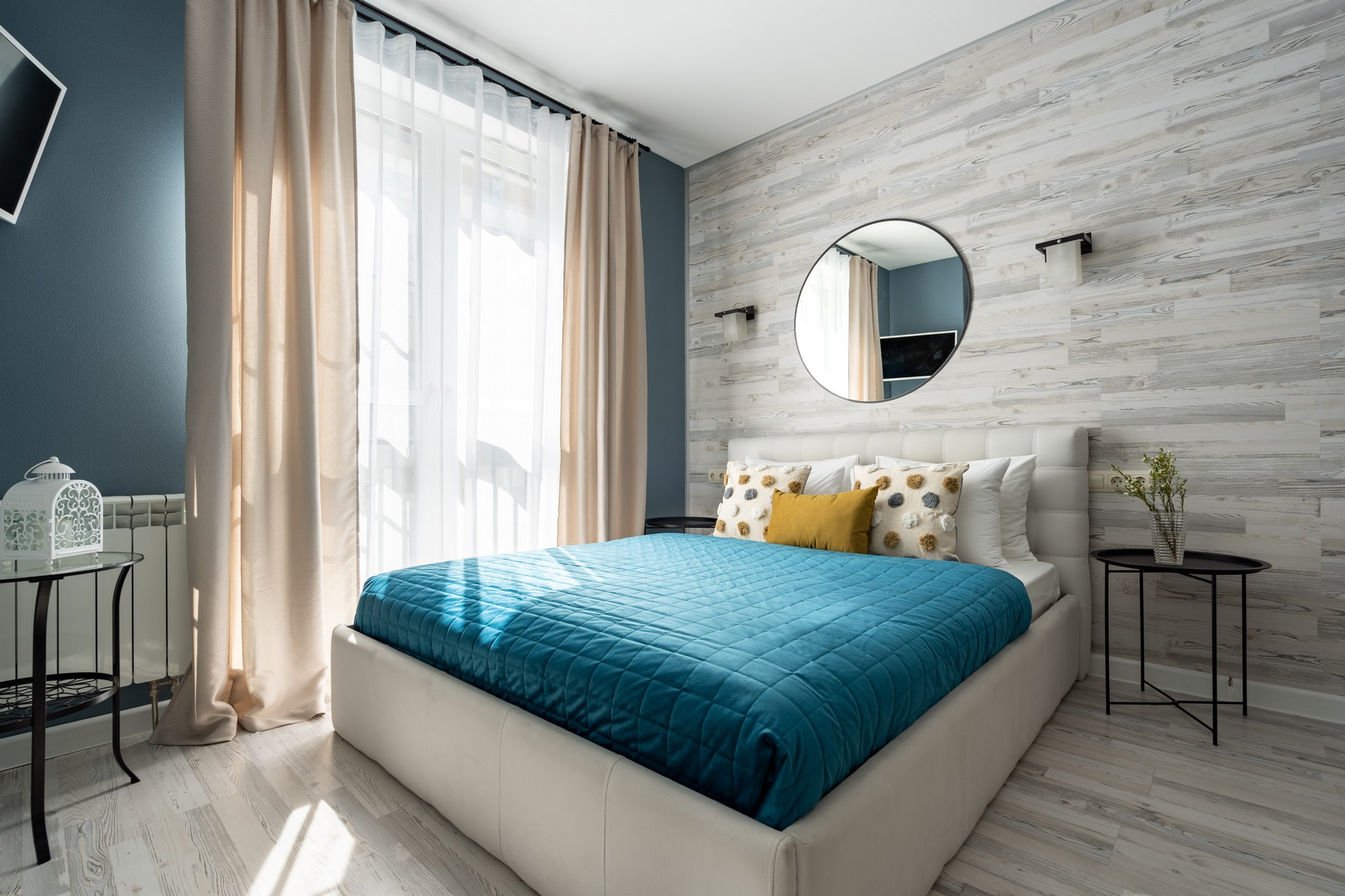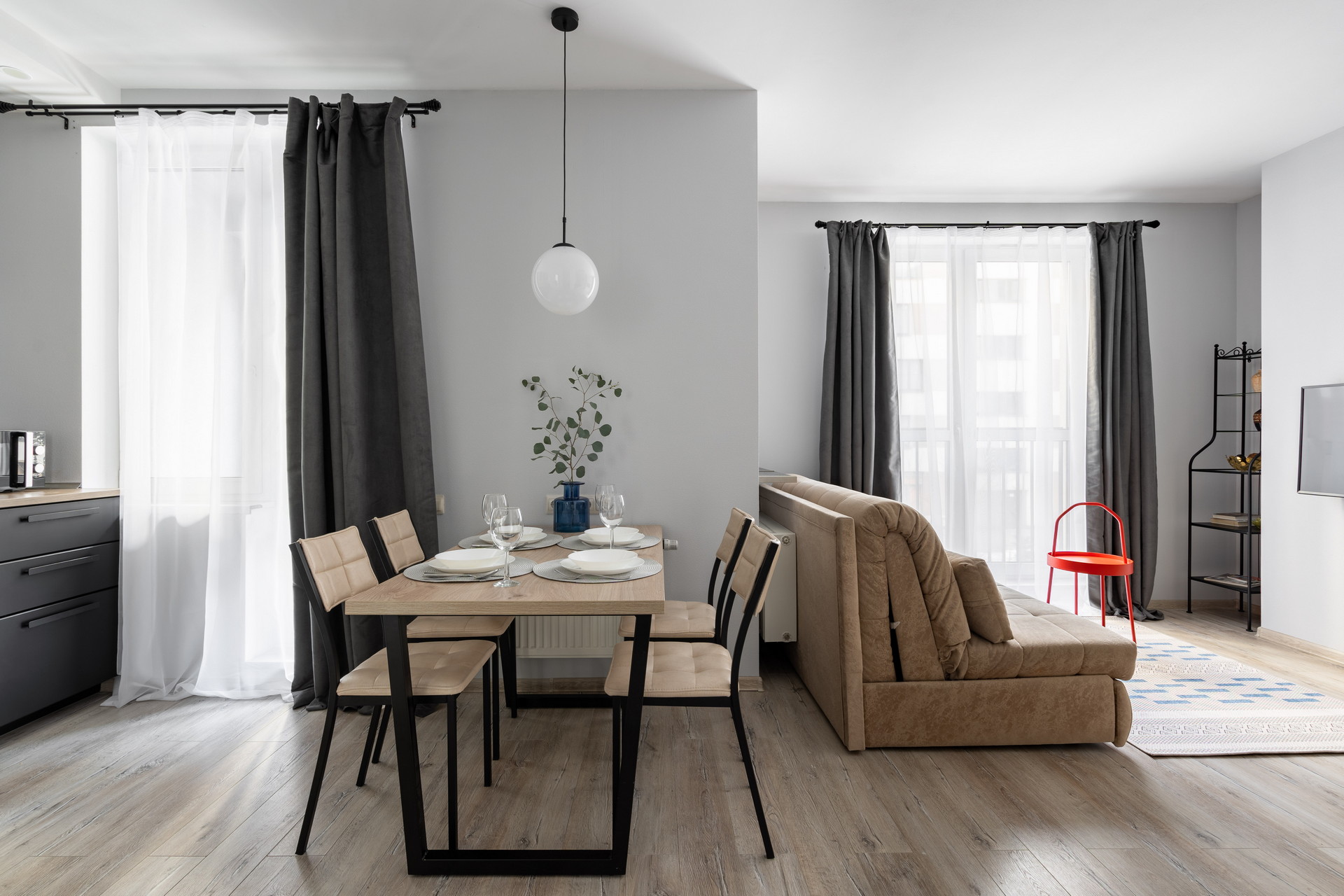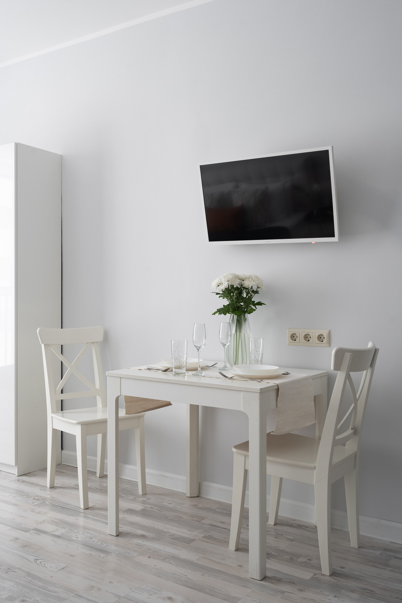 В номере: вешалка, диван раскладной, зеркало, кровать двуспальная, прикроватные столики, стол обеденный, стулья, шкаф, гладильная доска, микроволновая печь, набор посуды, плита электрическая, стиральная машина, сушилка для белья, телевизор ЖК, утюг, холодильник, чайный набор посуды, электрочайник