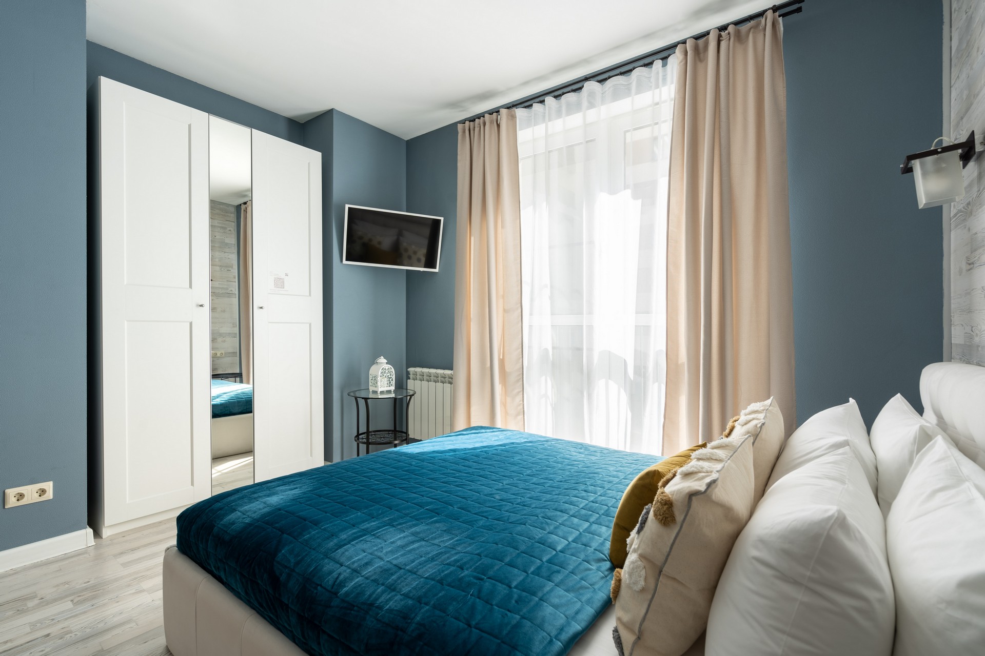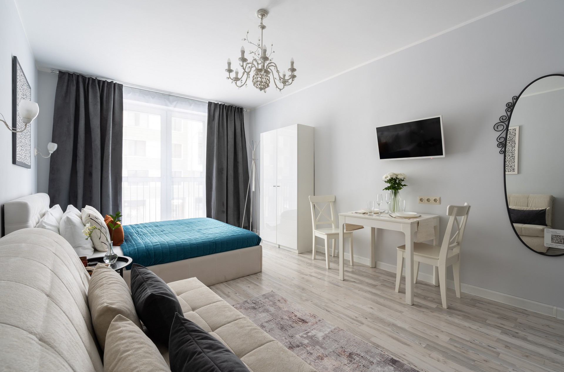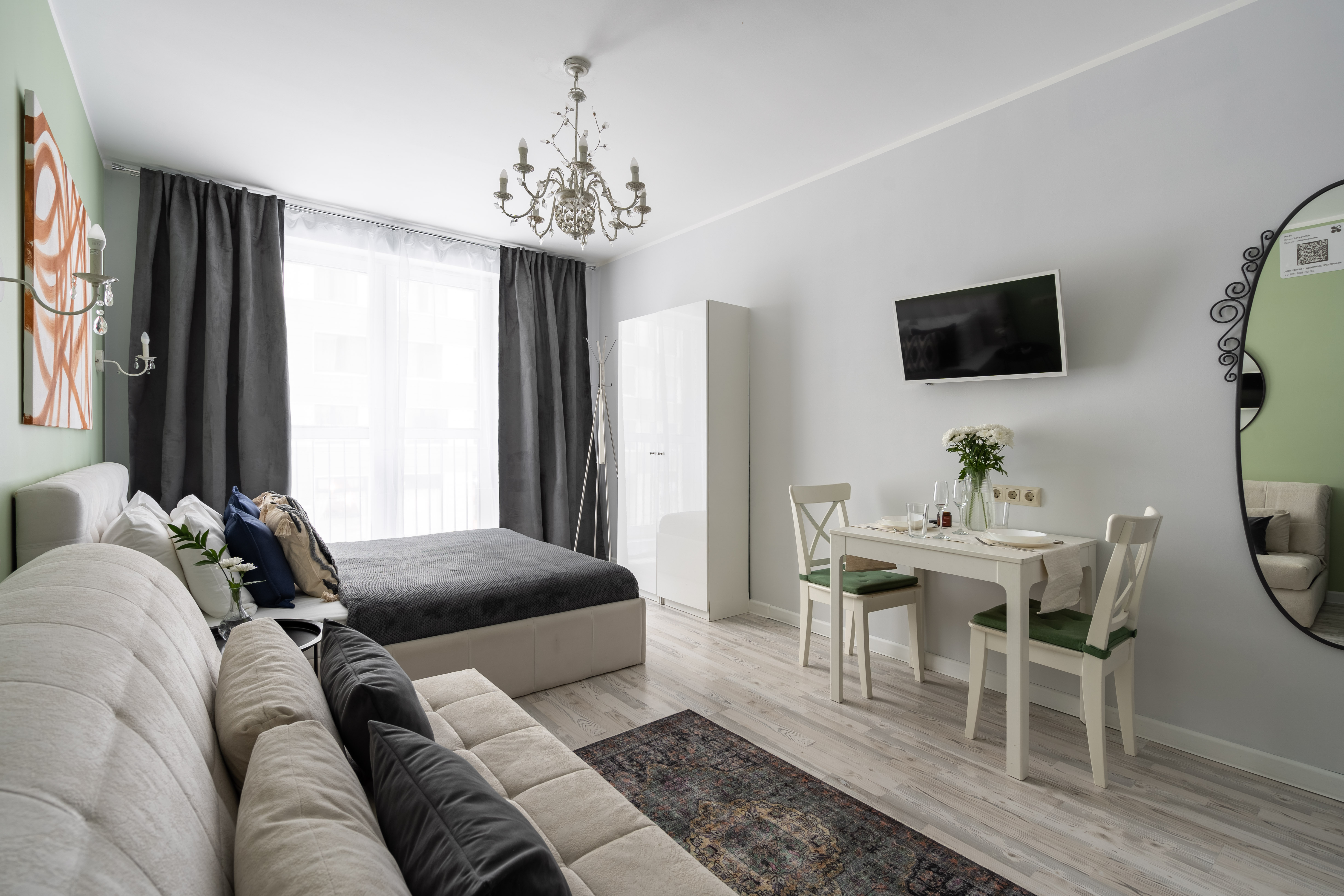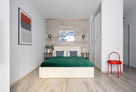 В номере: вешалка, диван раскладной, зеркало, кровать двуспальная, прикроватные столики, стол, стулья, шкаф, гладильная доска, микроволновая печь, набор посуды, плита электрическая, стиральная машина, сушилка для белья, телевизор ЖК, утюг, холодильник, чайный набор посуды, электрочайник