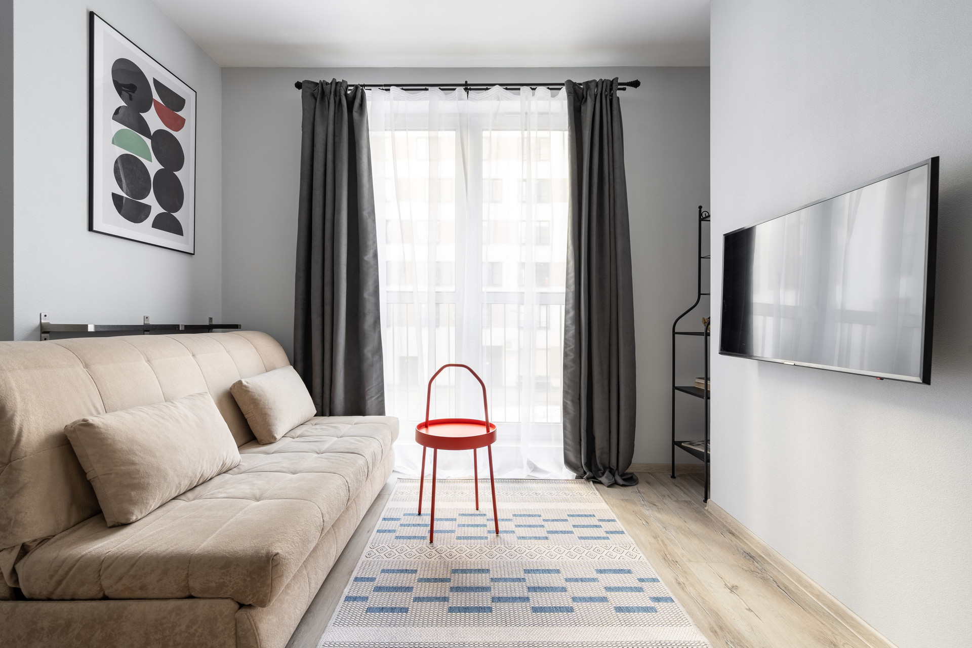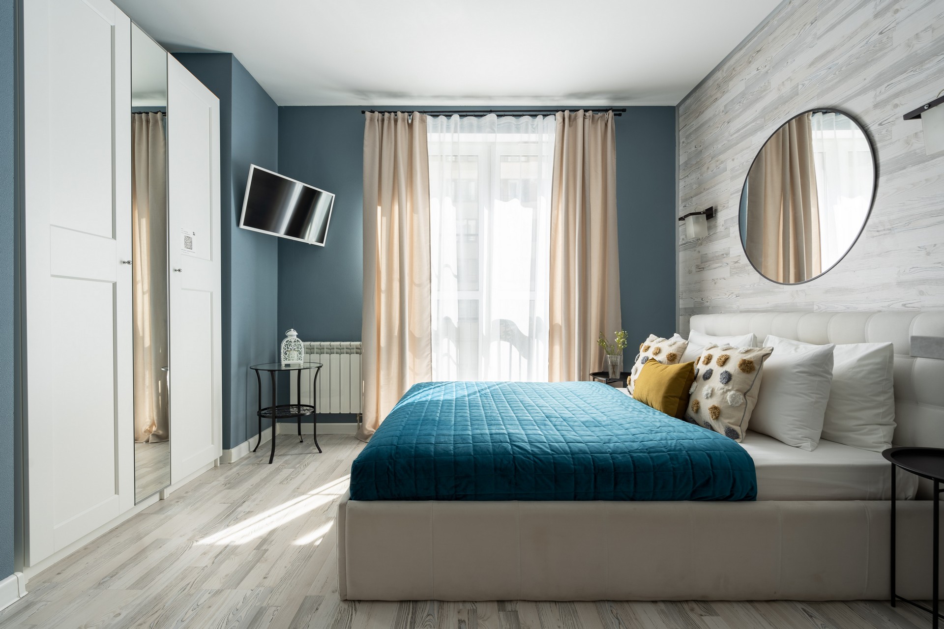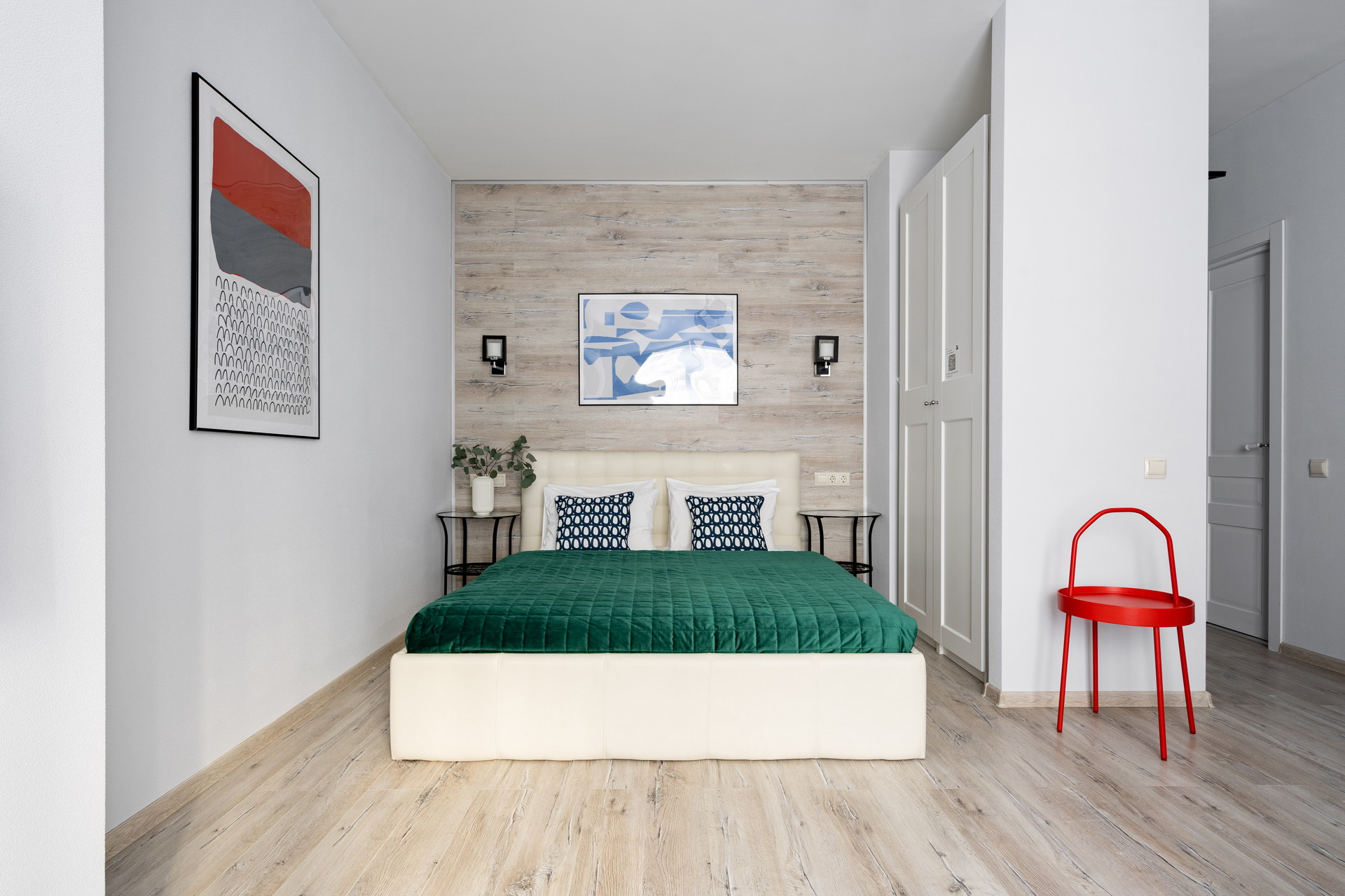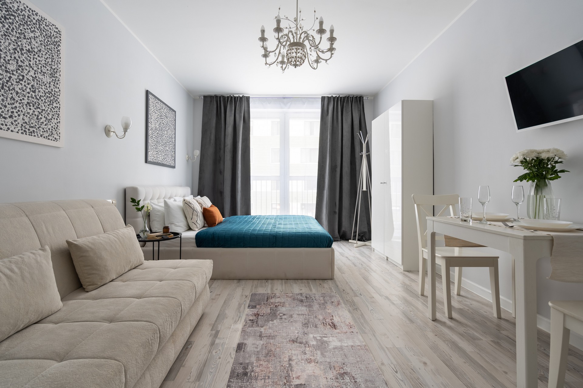 В номере: вешалка, диван раскладной, зеркало, кровать двуспальная, прикроватные столики, стол, стулья, шкаф, гладильная доска, микроволновая печь, набор посуды, плита электрическая, стиральная машина, сушилка для белья, телевизор ЖК, утюг, холодильник, чайный набор посуды, электрочайник