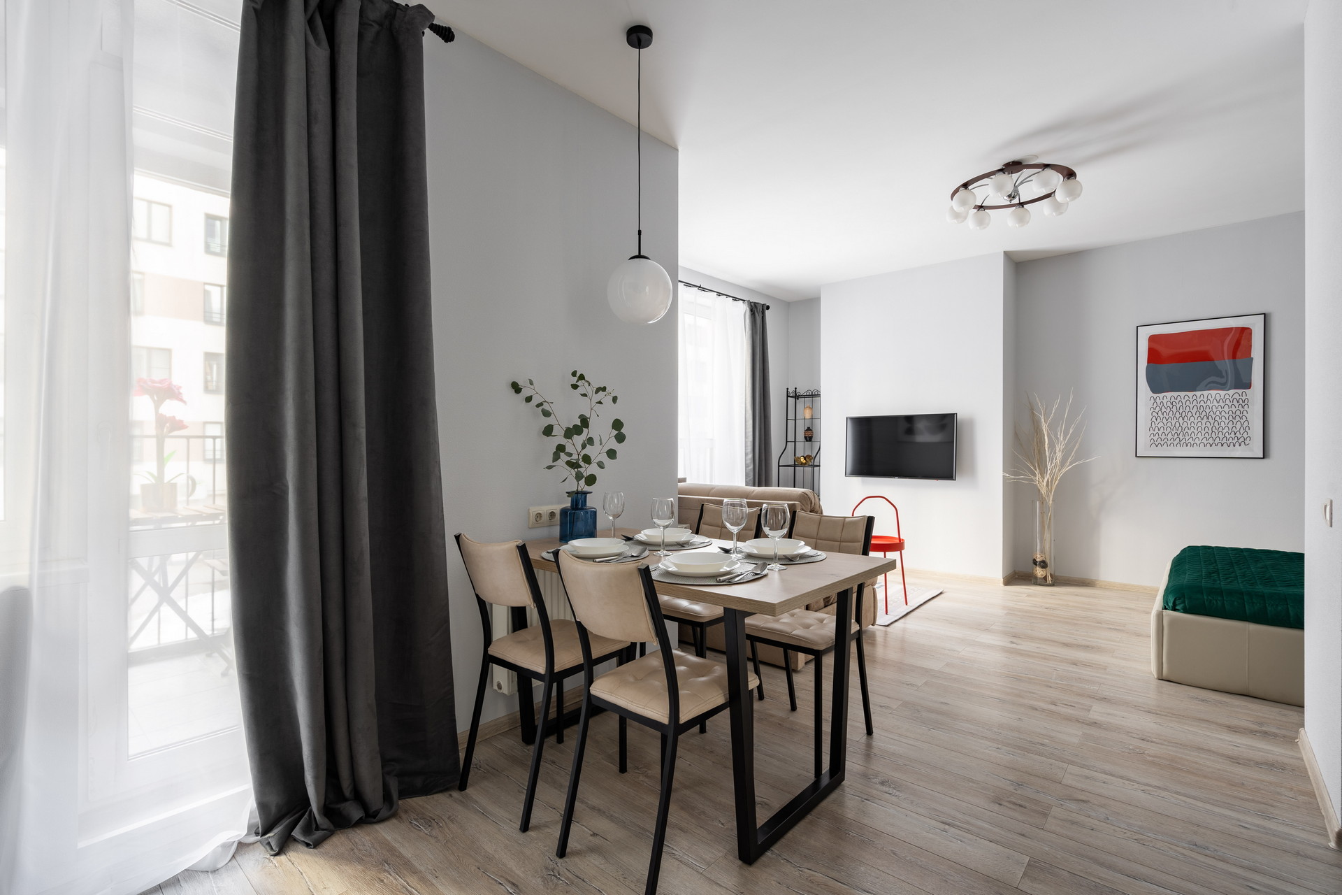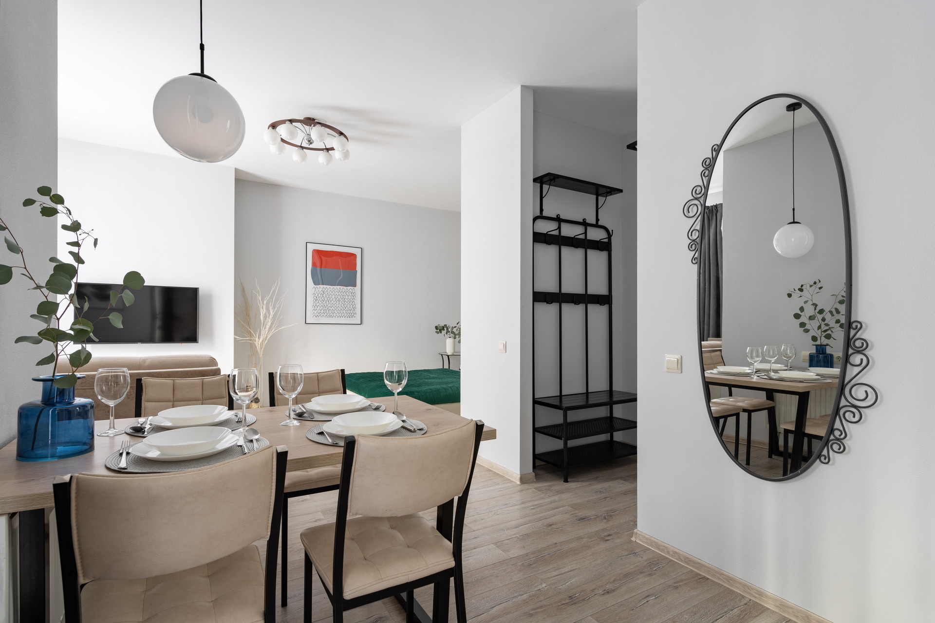 В номере: вешалка, диван раскладной, зеркало, кровать двуспальная, прикроватные столики, стол обеденный, стулья, шкаф, гладильная доска, микроволновая печь, набор посуды, плита электрическая, стиральная машина, сушилка для белья, телевизор ЖК, холодильник, чайный набор посуды, электрочайник