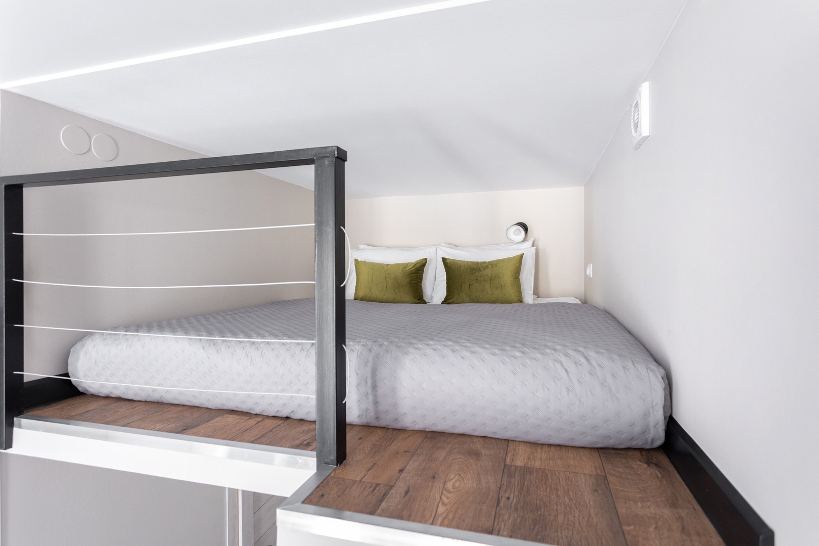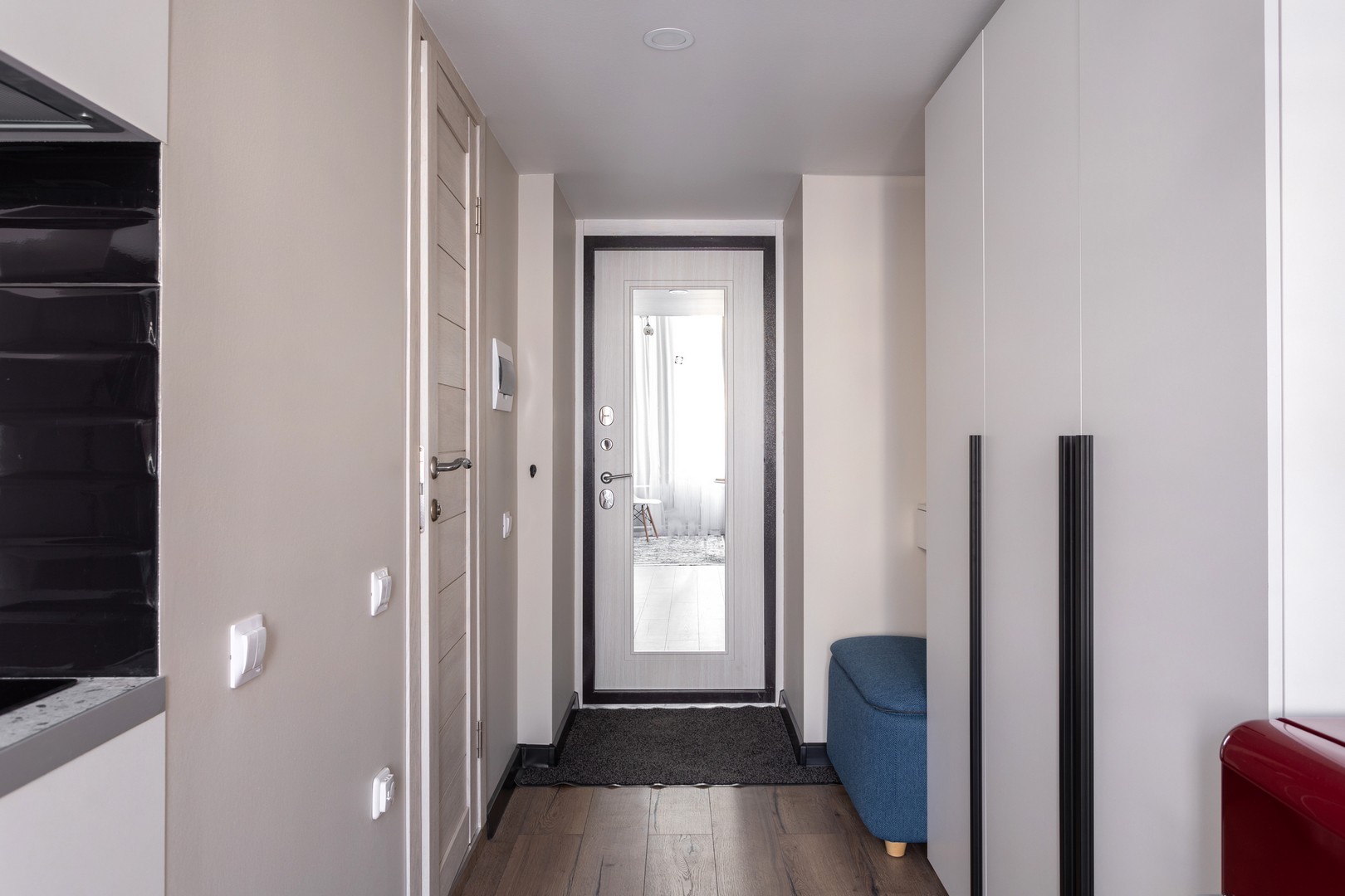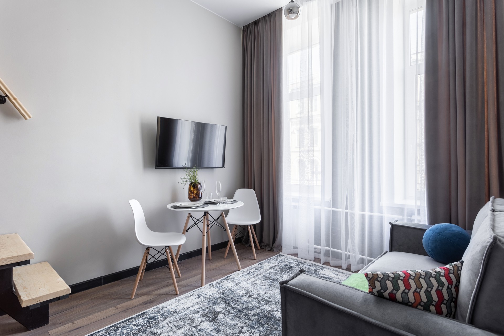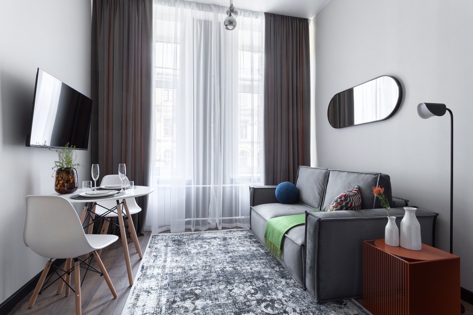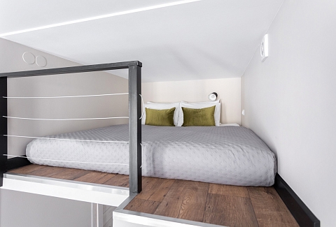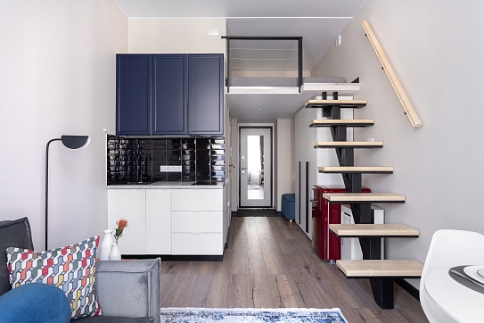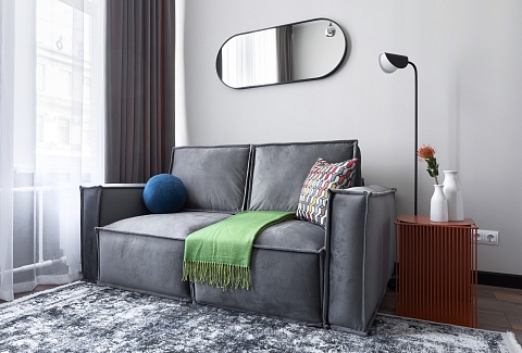 В номере: вешалка, диван раскладной, зеркало, матрас, прикроватная тумбочка, пуфик, стол обеденный, стулья, шкаф, гладильная доска, микроволновая печь, набор посуды, плита индукционная, стиральная машина, сушилка для белья, телевизор ЖК, утюг, чайный набор посуды, электрочайник