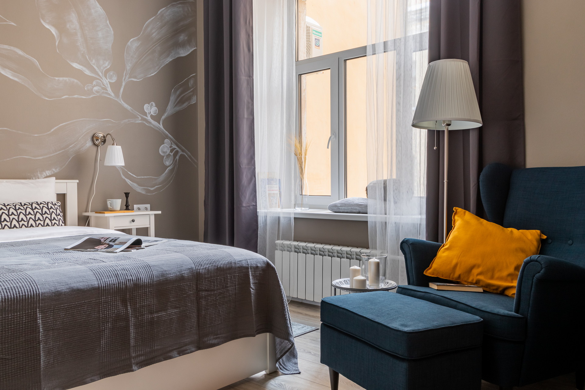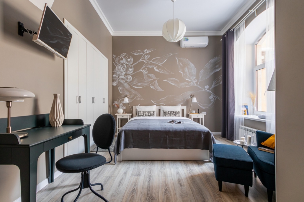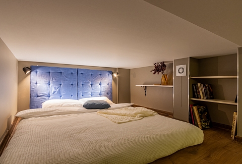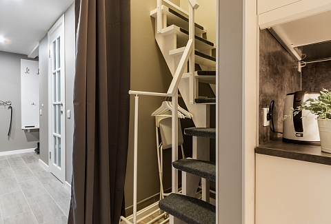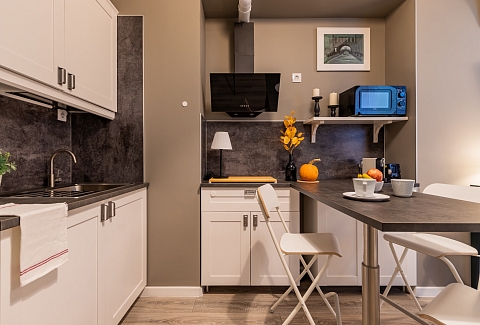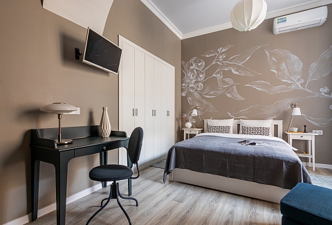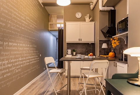 В номере: вешалка, кресло, кровать двуспальная, кухонная мебель, матрас, прикроватные столики, пуфик, стол, стол для компьютера, стулья, шкаф, гладильная доска, кофемашина, микроволновая печь, набор посуды, плита индукционная, стиральная машина, сушилка для белья, телевизор ЖК, утюг, холодильник, чайный набор посуды, электрочайник