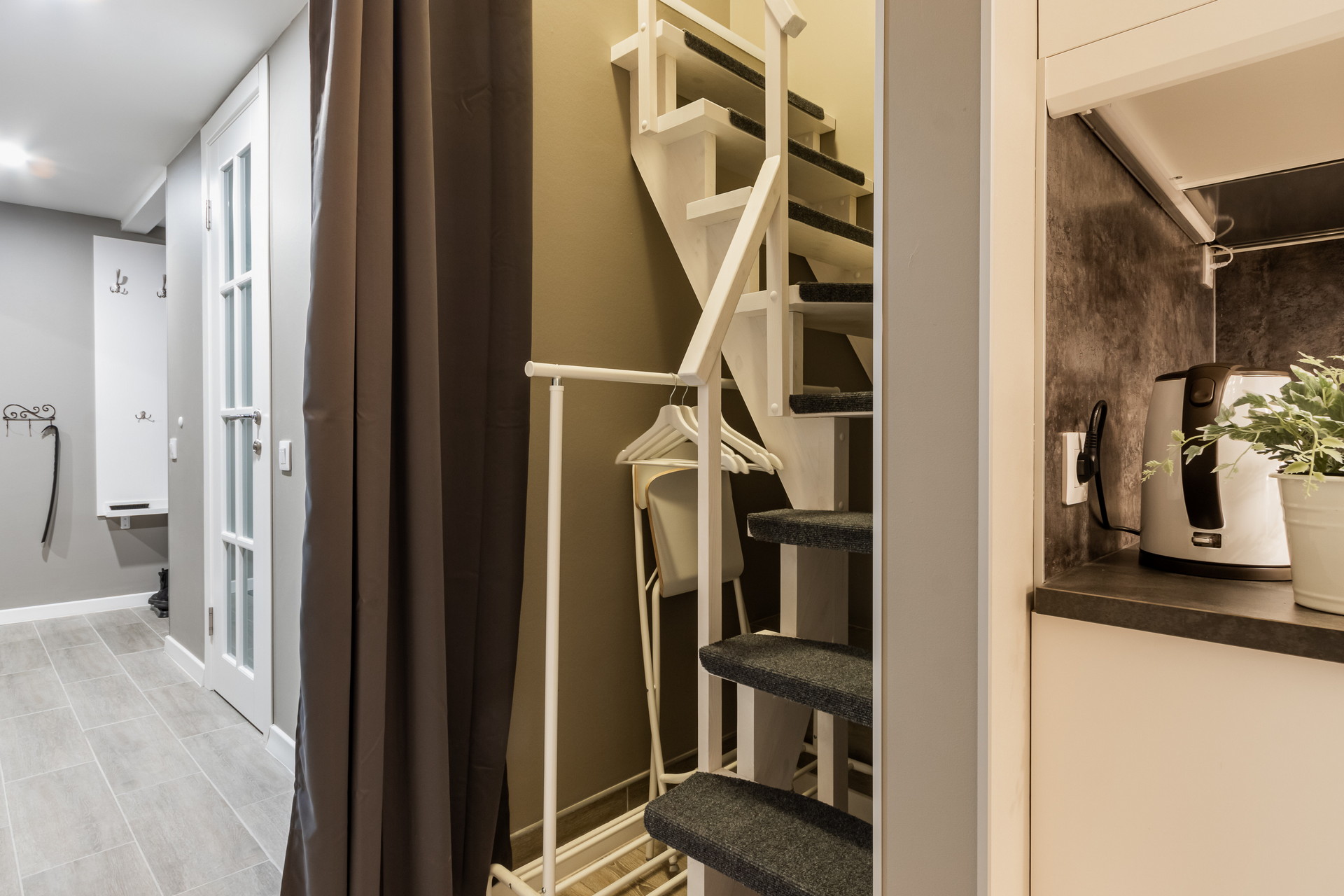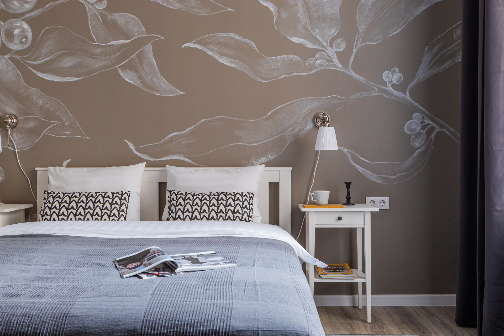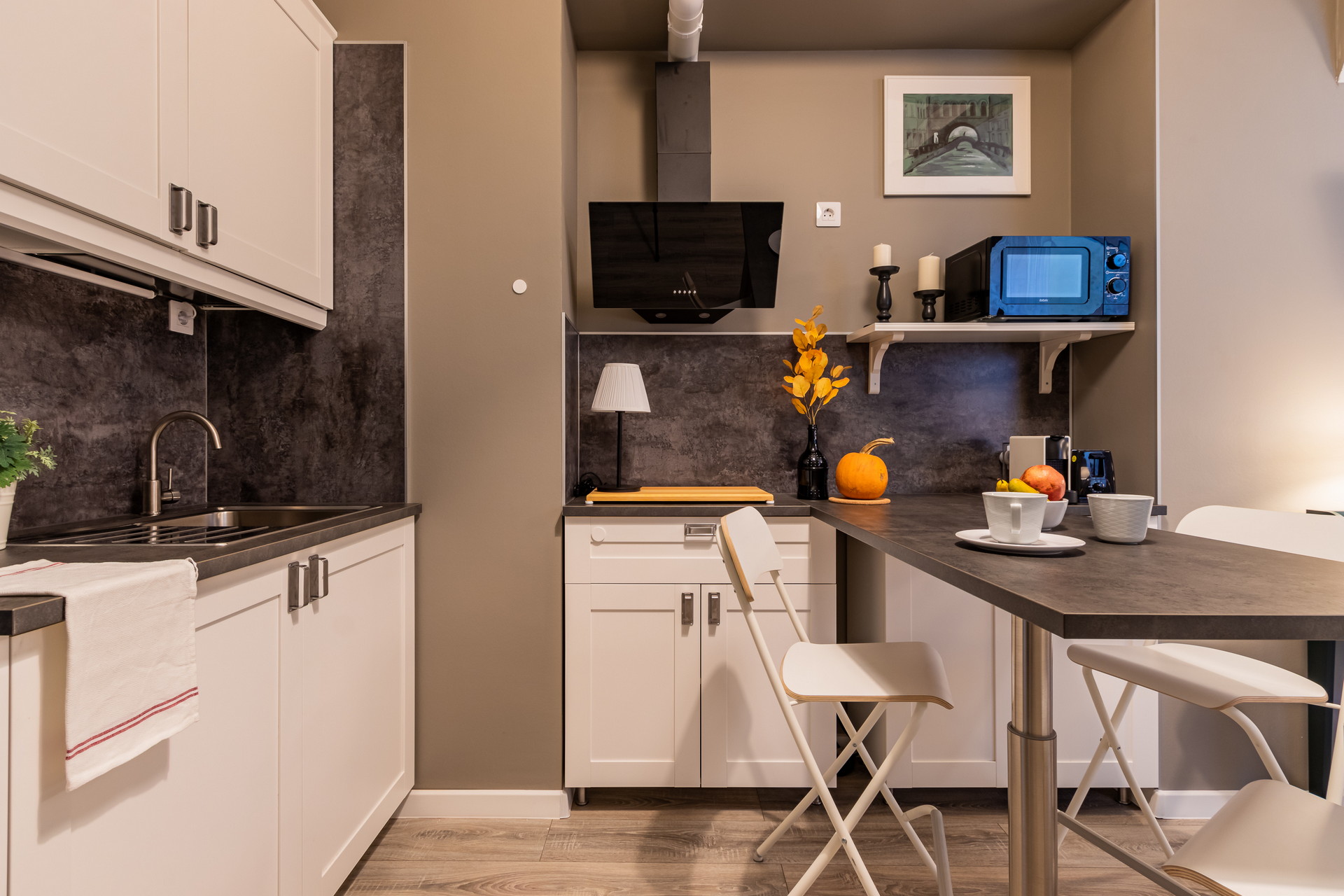 В номере: вешалка, кресло, кровать двуспальная, кухонная мебель, матрас, прикроватные столики, пуфик, стол, стол для компьютера, стулья, шкаф, гладильная доска, кофемашина, микроволновая печь, набор посуды, плита индукционная, стиральная машина, сушилка для белья, телевизор ЖК, утюг, холодильник, чайный набор посуды, электрочайник