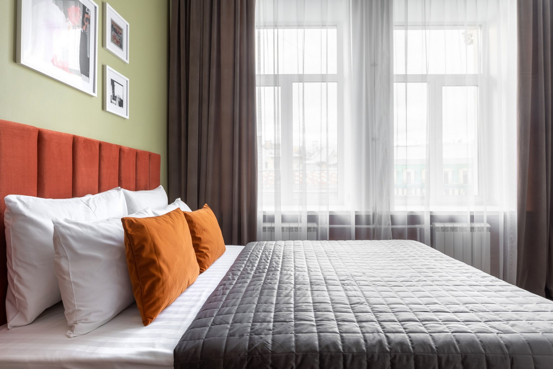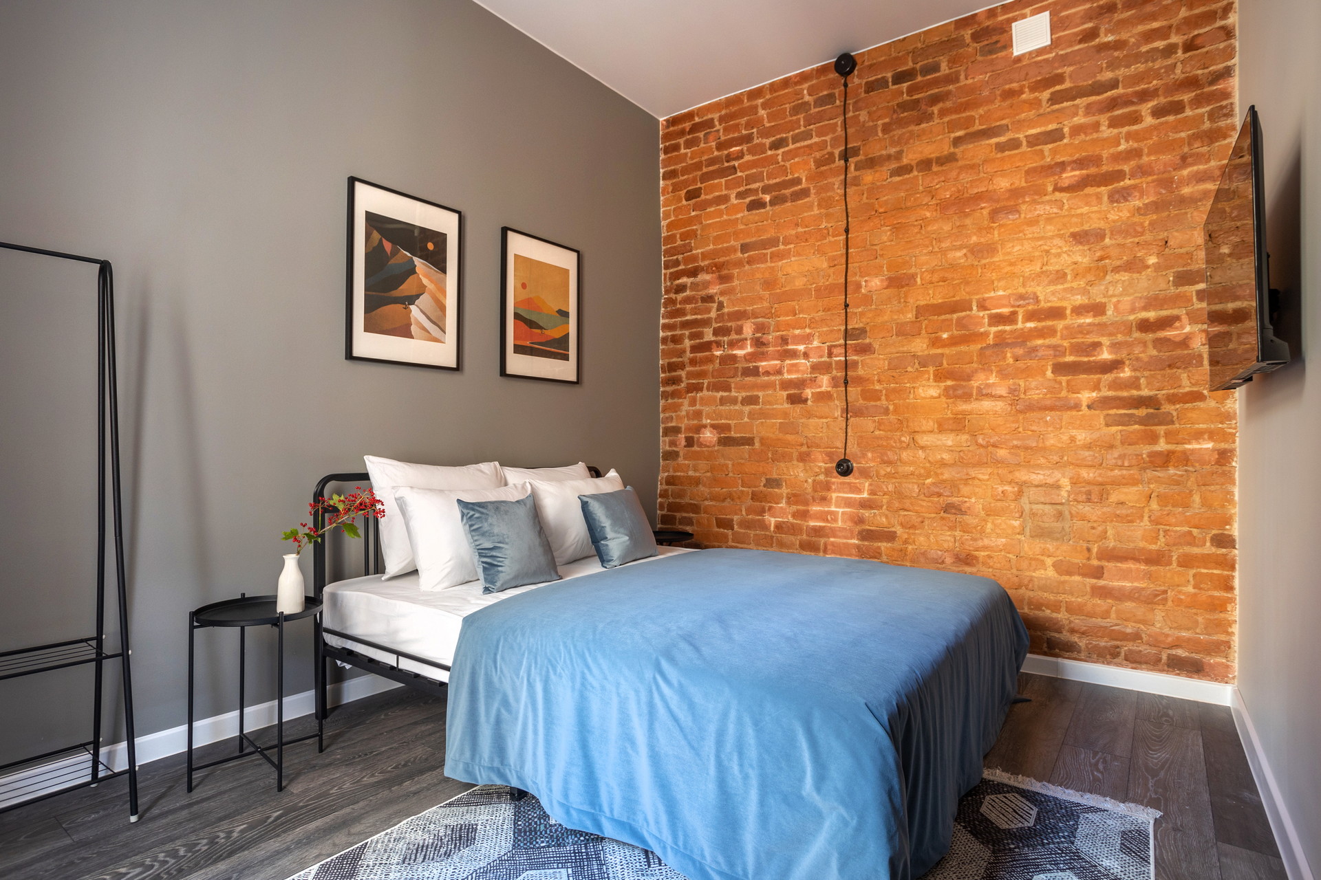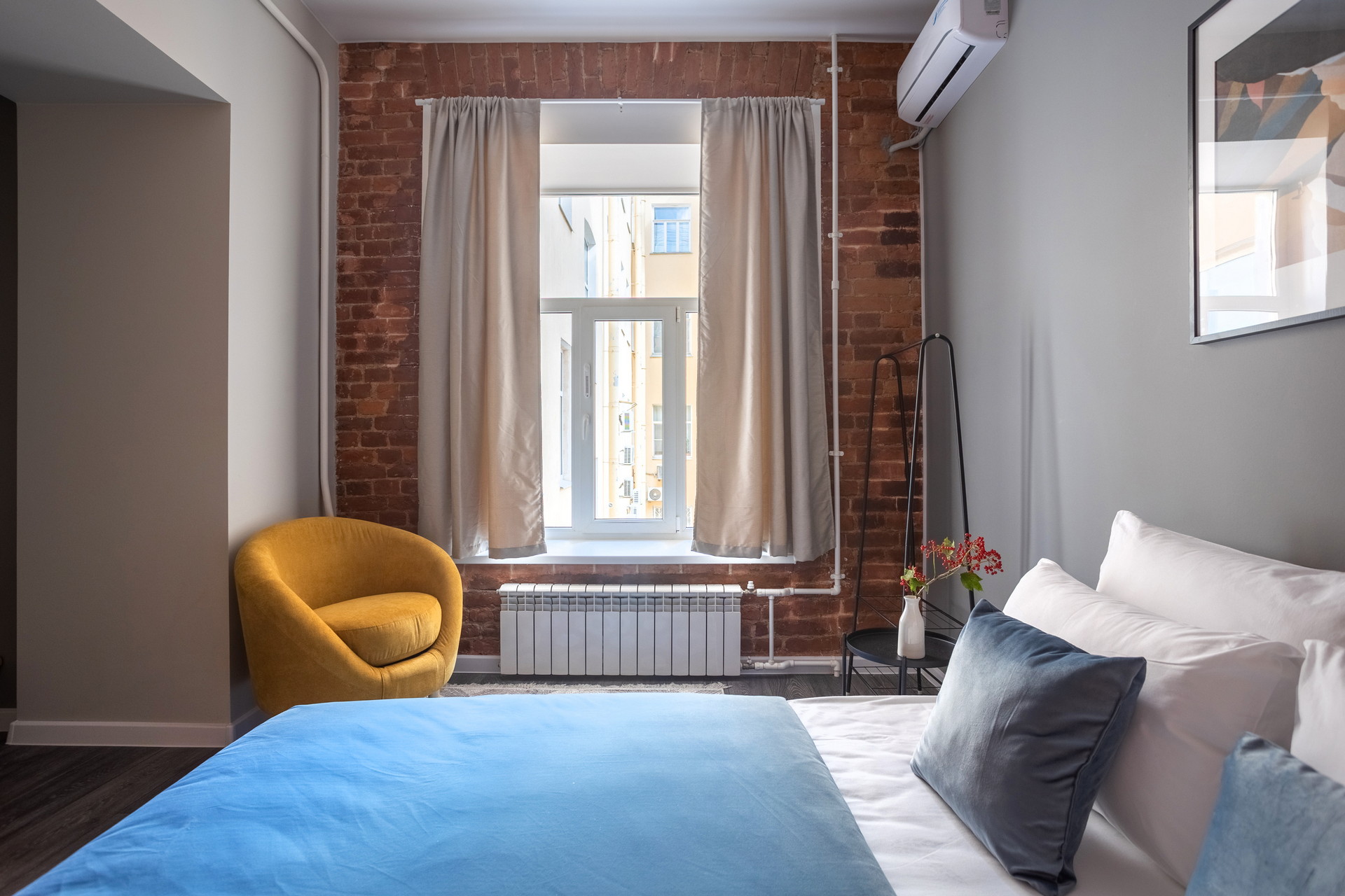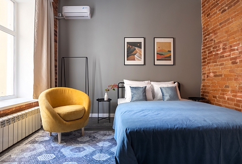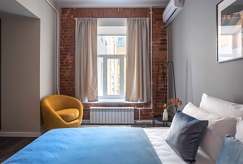 В номере: вешалка, зеркало, кровать двуспальная, матрас, прикроватные столики, стол обеденный, стулья, шкаф, гладильная доска, микроволновая печь, набор посуды, плита индукционная, сплит-система, стиральная машина, сушилка для белья, телевизор ЖК, утюг, холодильник, чайный набор посуды, электрочайник