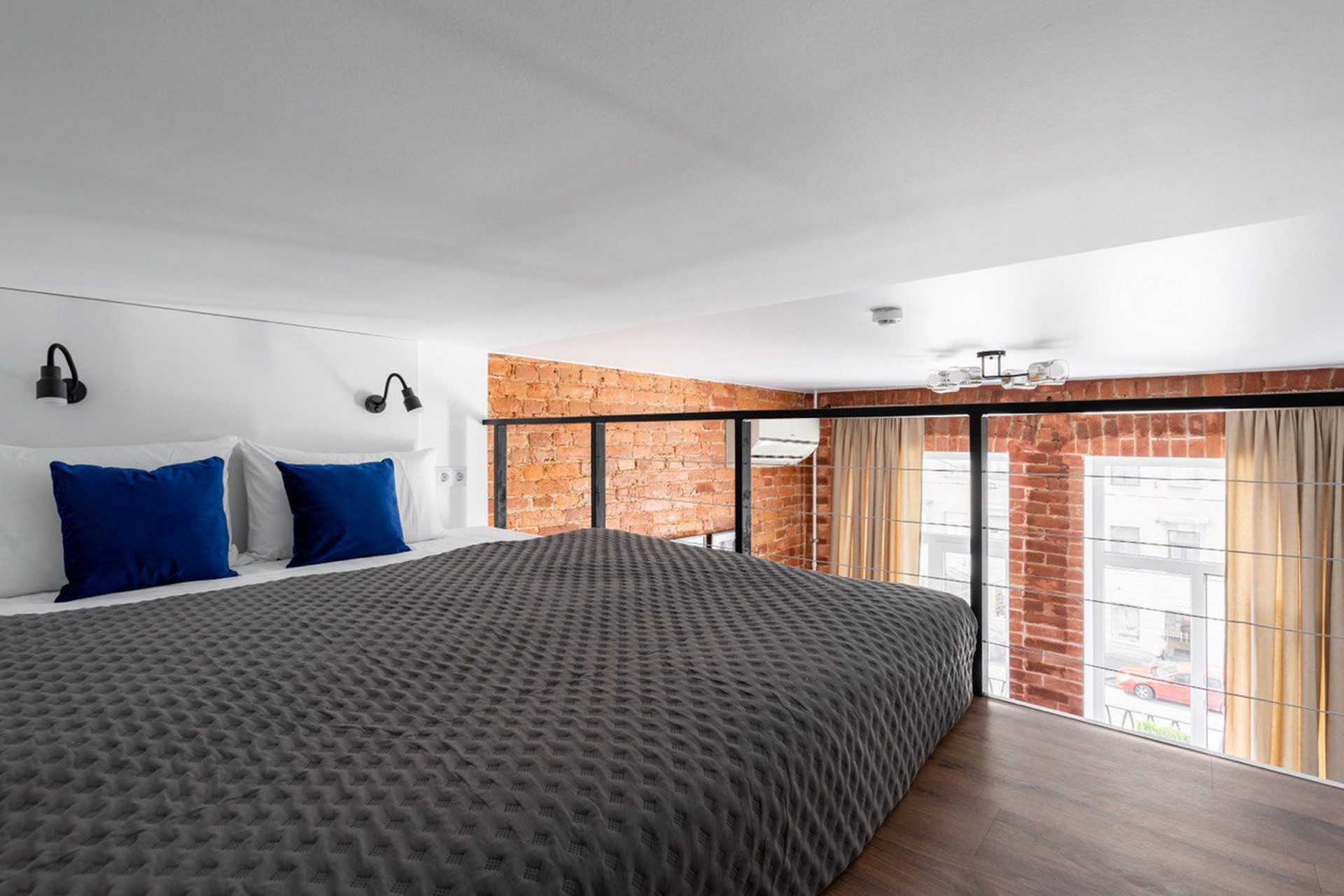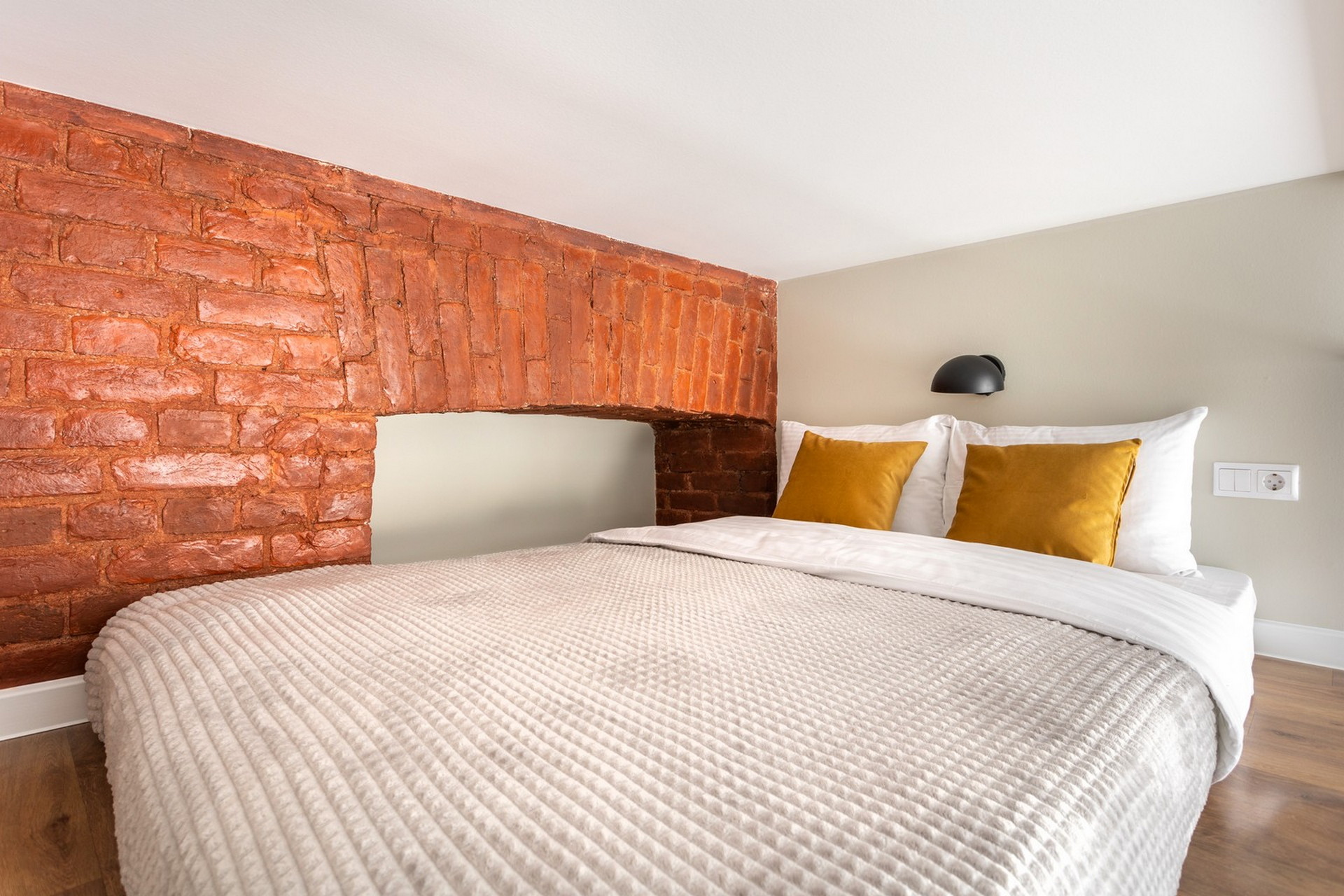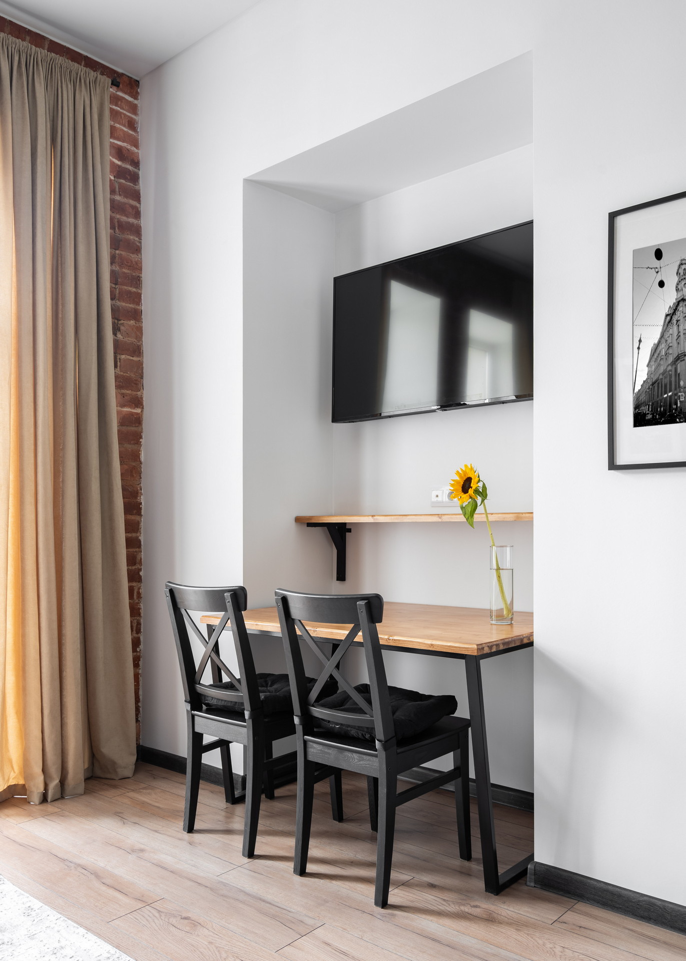 В номере: вешалка, зеркало, кровать двуспальная, матрас, прикроватные столики, стол обеденный, стулья, шкаф, гладильная доска, микроволновая печь, набор посуды, плита индукционная, сплит-система, стиральная машина, сушилка для белья, телевизор ЖК, утюг, холодильник, чайный набор посуды, электрочайник