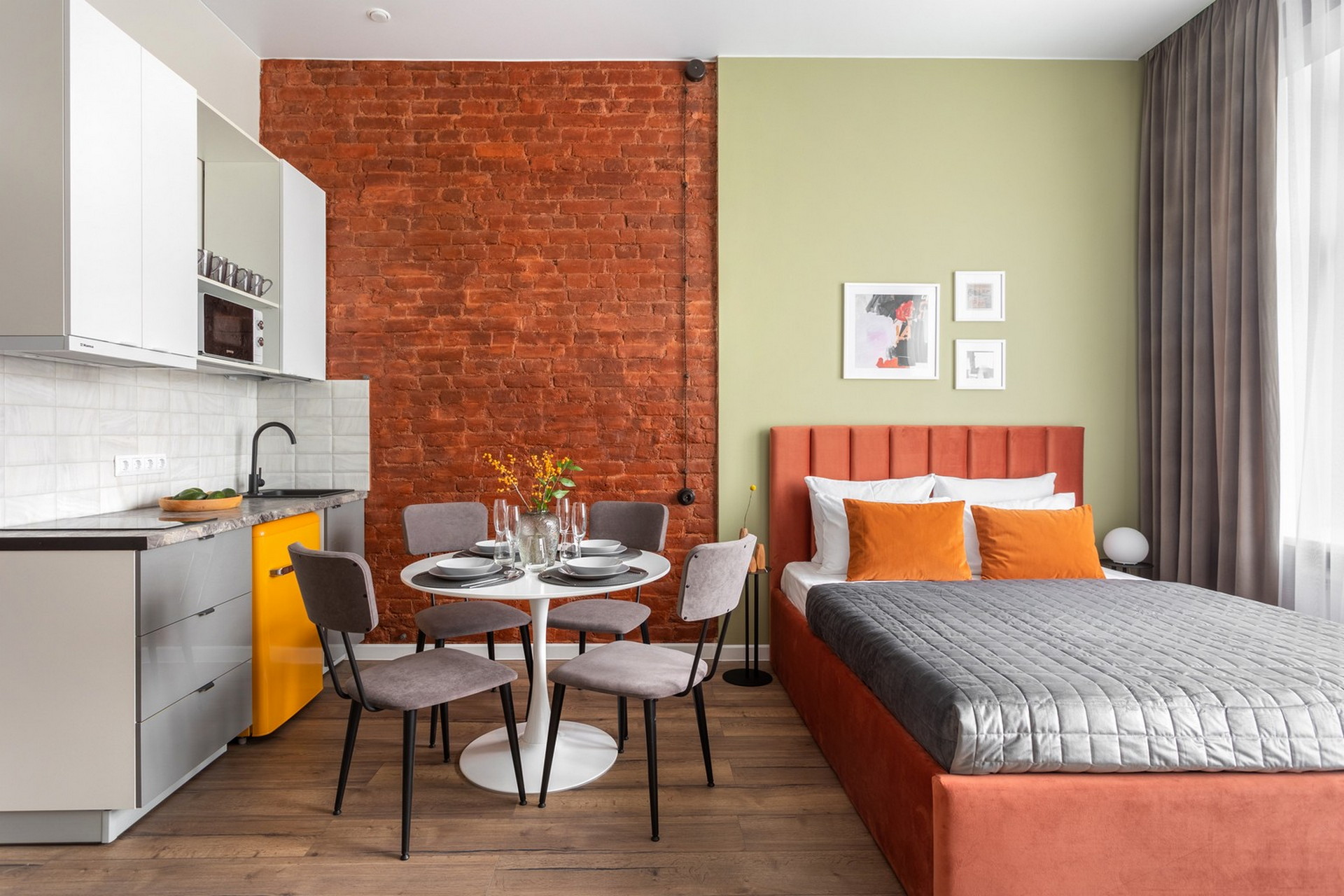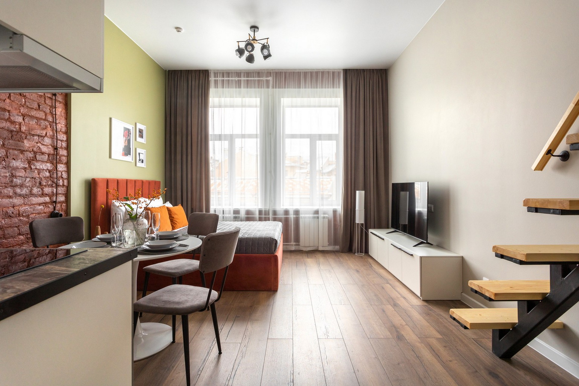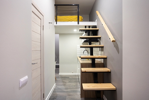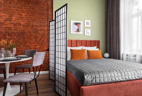 В номере: вешалка, диван раскладной, зеркало, кухонная мебель, матрас, стол, стулья, гладильная доска, микроволновая печь, набор посуды, плита индукционная, сплит-система, стиральная машина, сушилка для белья, телевизор ЖК, утюг, холодильник, чайный набор посуды, электрочайник