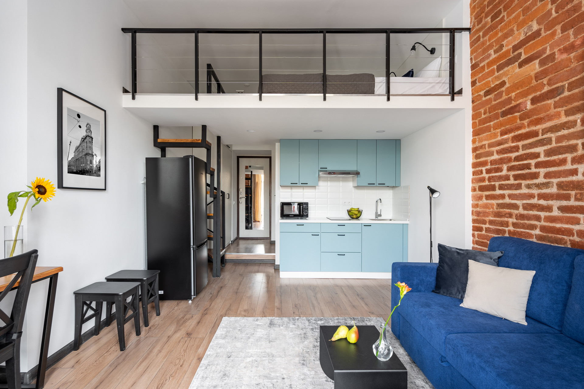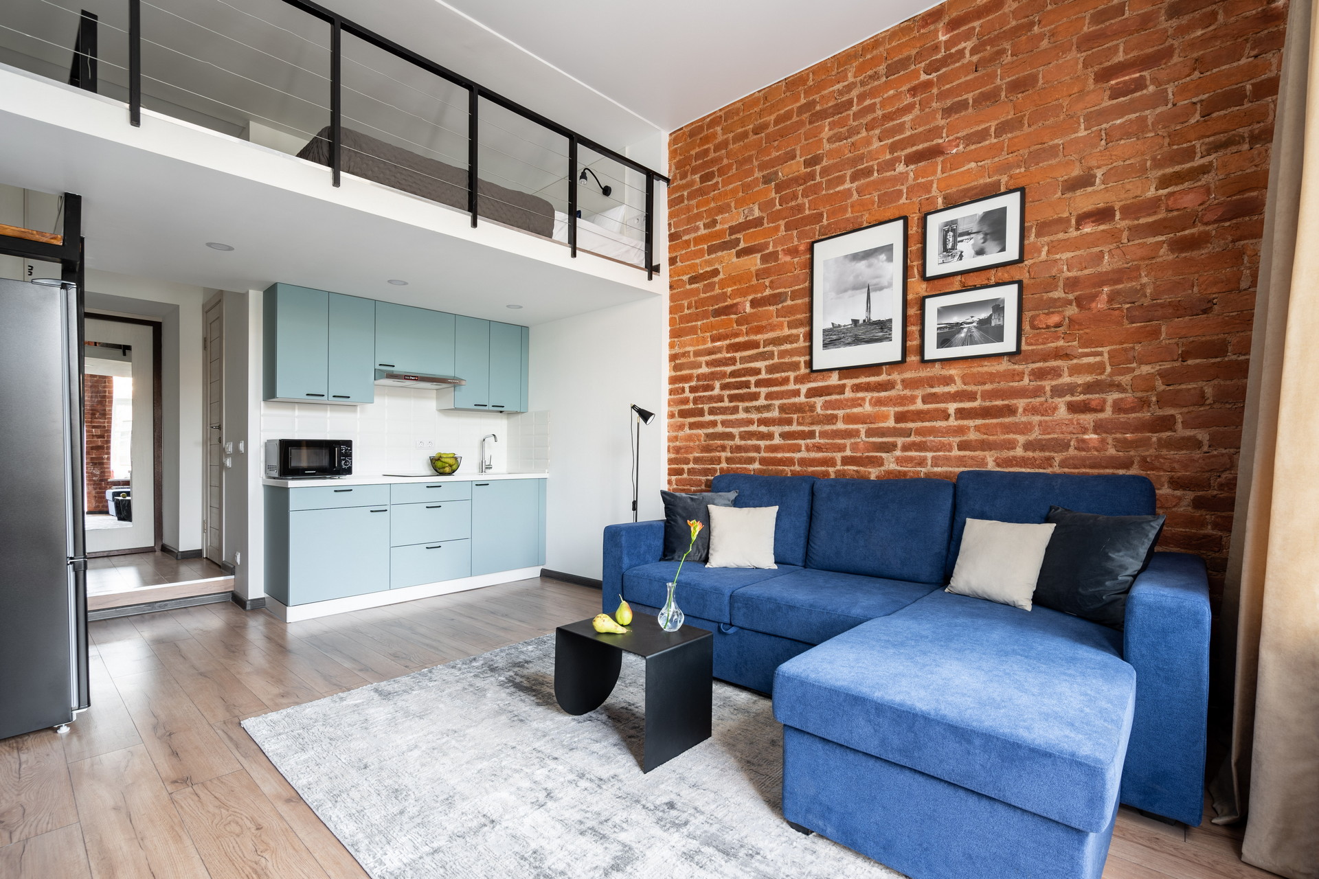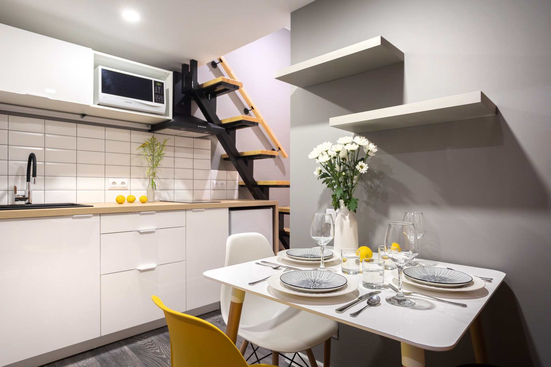 В номере: вешалка, диван раскладной, зеркало, кухонная мебель, матрас, стол, стулья, гладильная доска, микроволновая печь, набор посуды, плита индукционная, сплит-система, стиральная машина, сушилка для белья, телевизор ЖК, утюг, холодильник, чайный набор посуды, электрочайник