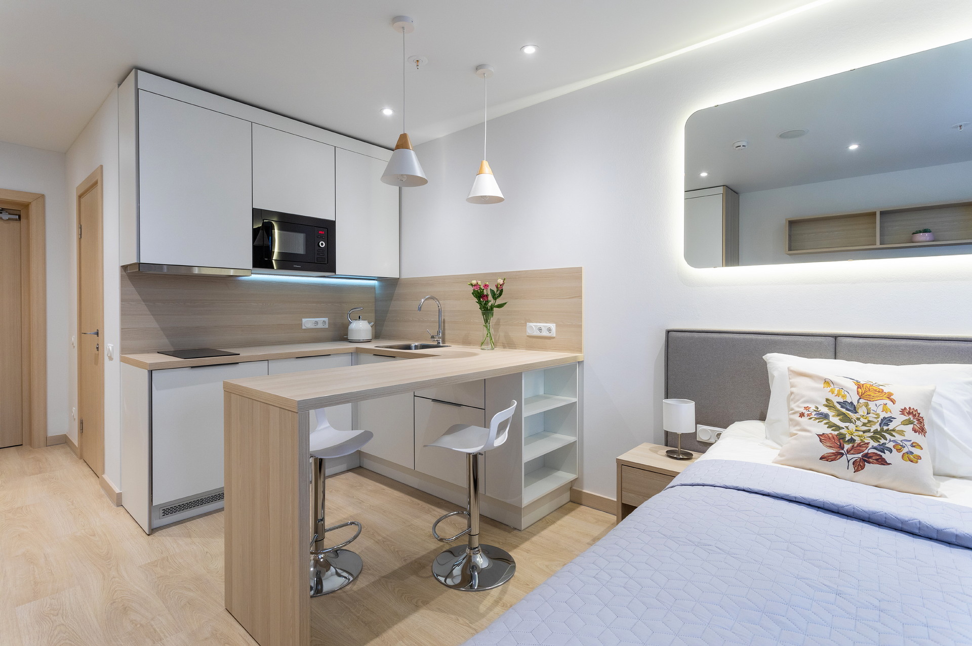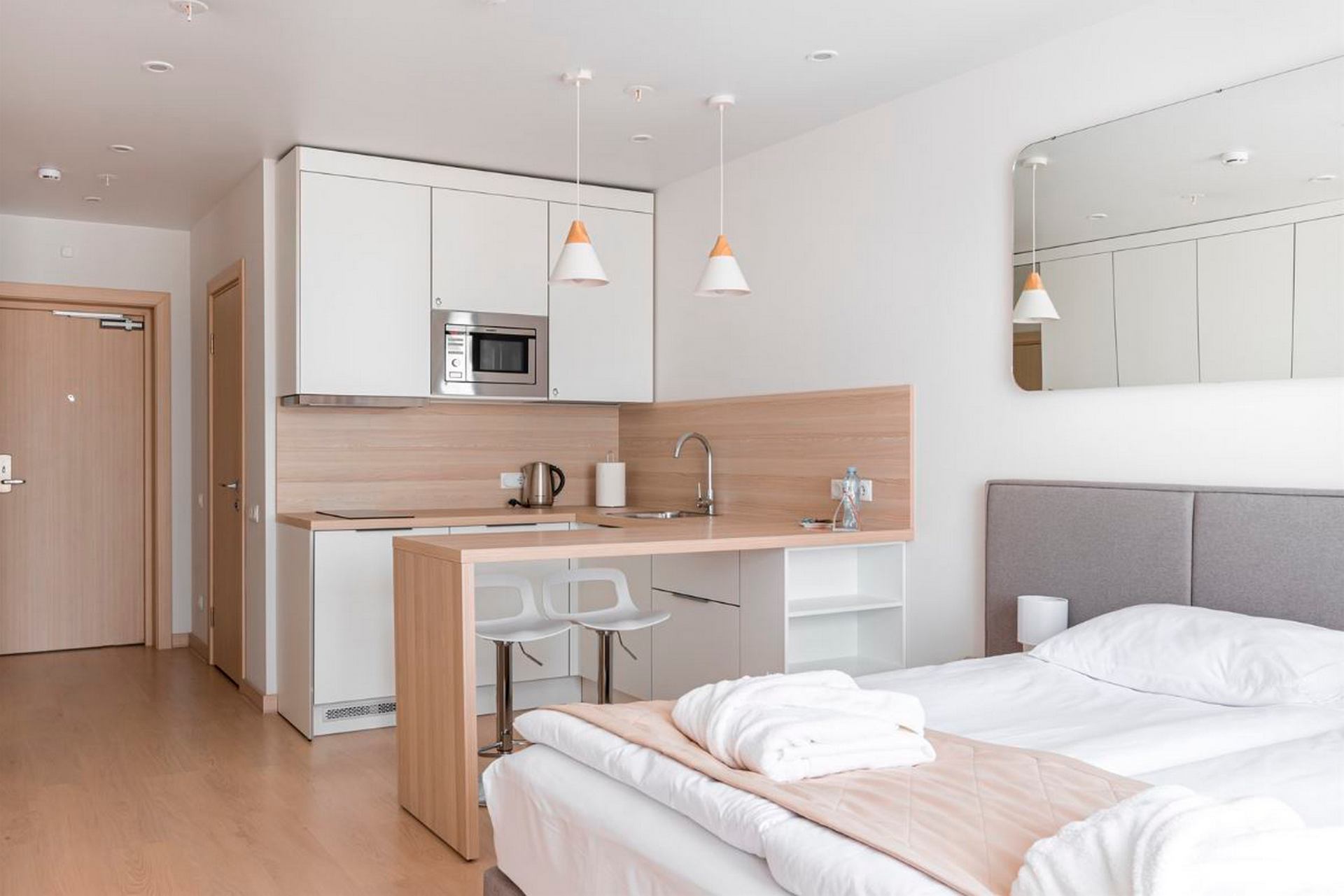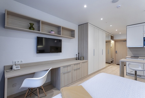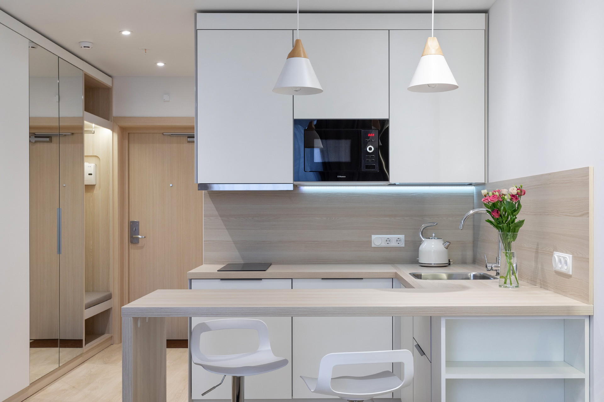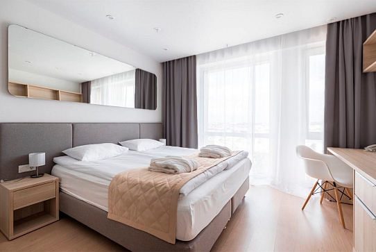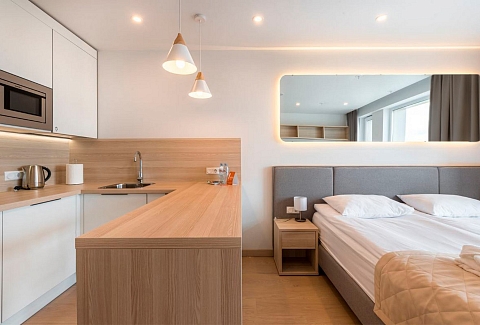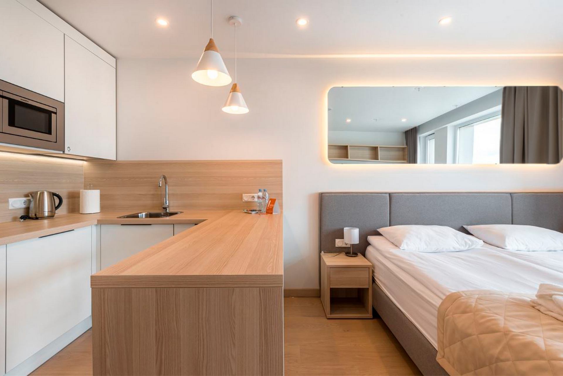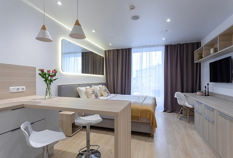 Есть вся необходимая мебель и техника для приготовления еды и комфортного размещения, телевизор, интернет Wi-Fi, полностью оборудованная кухонная зона, санузел с современной сантехникой и душевой, стиральная машина, гладильные принадлежности.Эргономичный дизайн позволяет комфортно разместиться 2 гостям.Преимуществом многофункционального ЖК является собственная инфраструктура способная удовлетворить потребности гостя в зависимости от целей пребывания, от изысканных ресторанов до конференц-залов и фитнес центра.