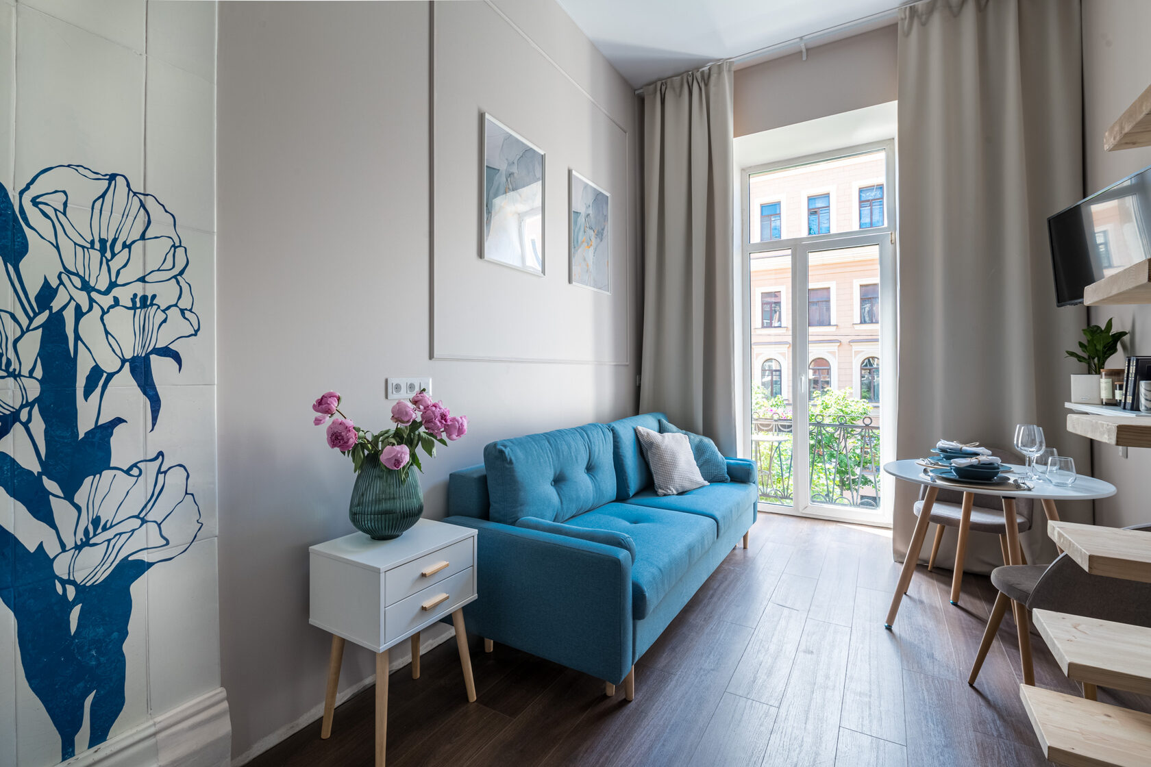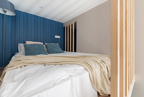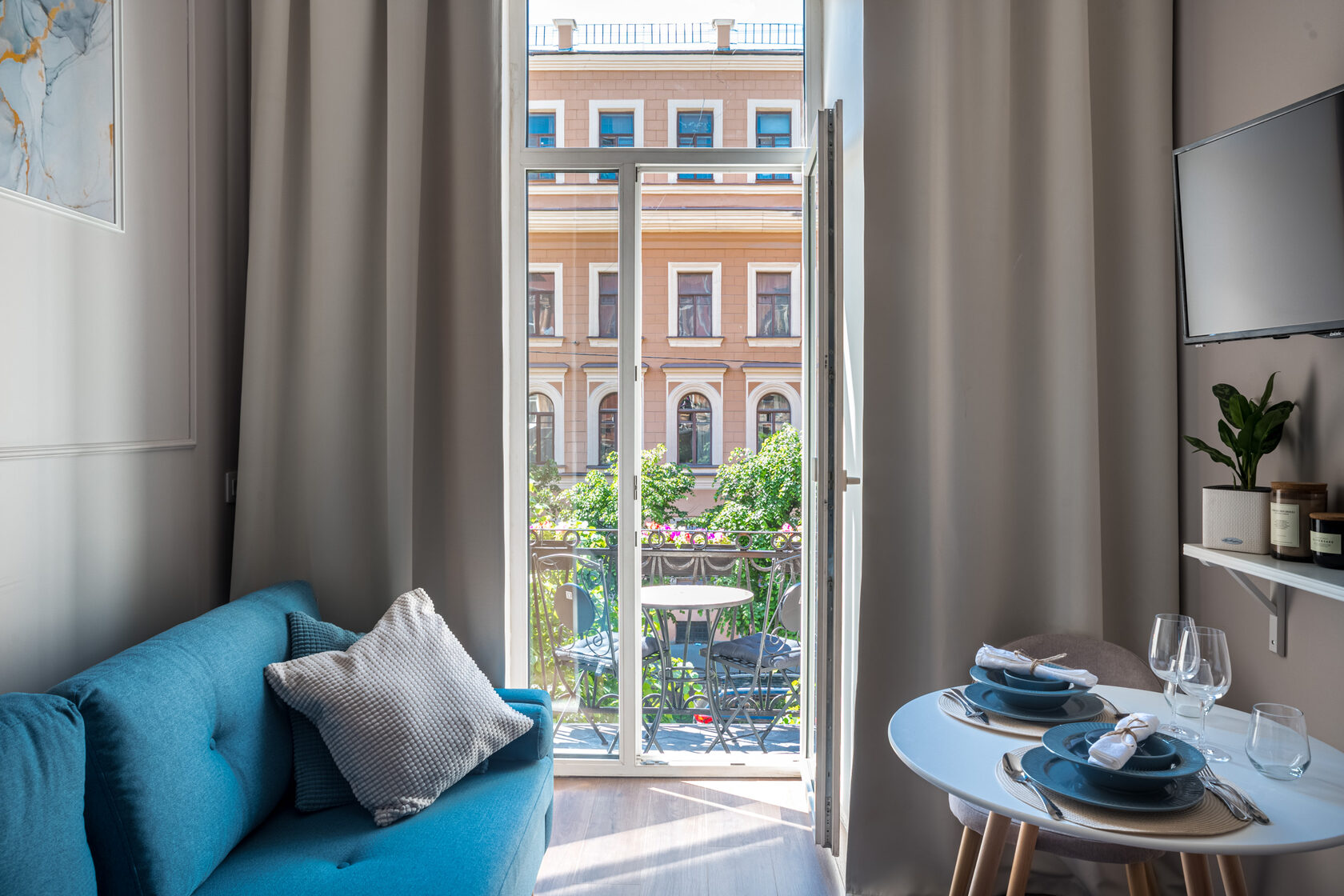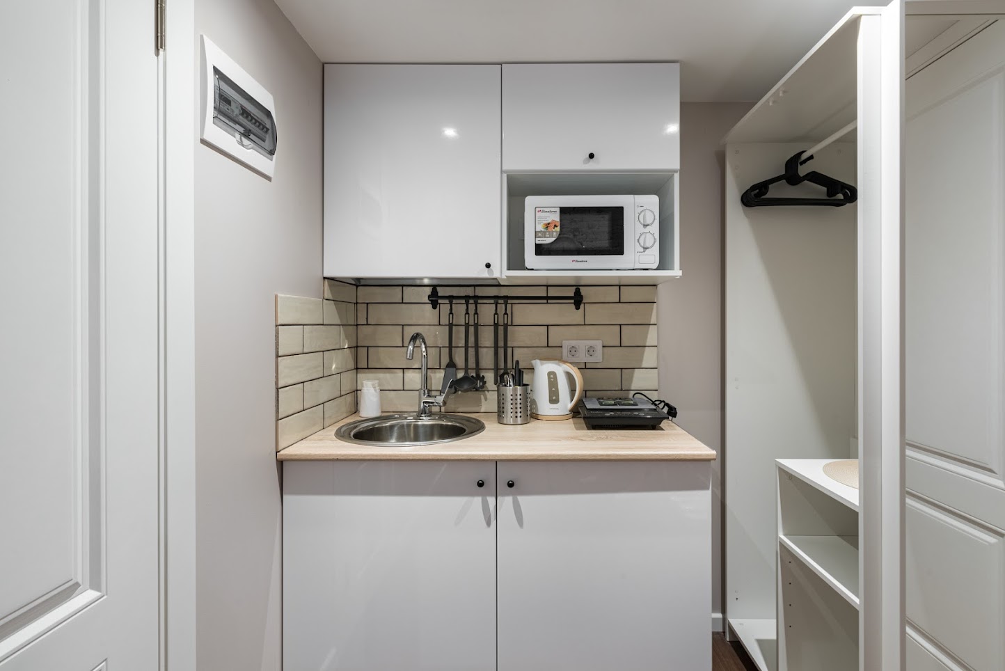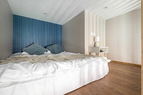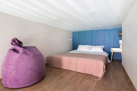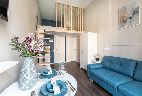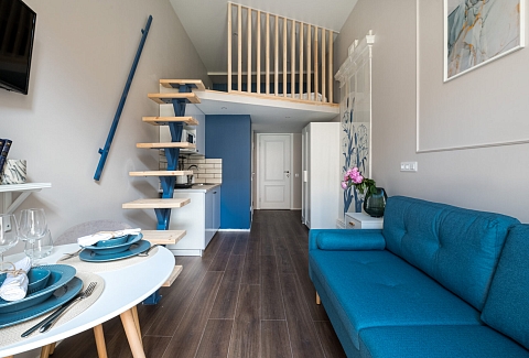 В номере: вешалка, диван, зеркало, кровать двуспальная, прикроватные тумбочки, стол, стулья, шкаф, микроволновая печь, мини-холодильник, набор посуды, плита электрическая, телевизор, электрочайник
