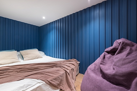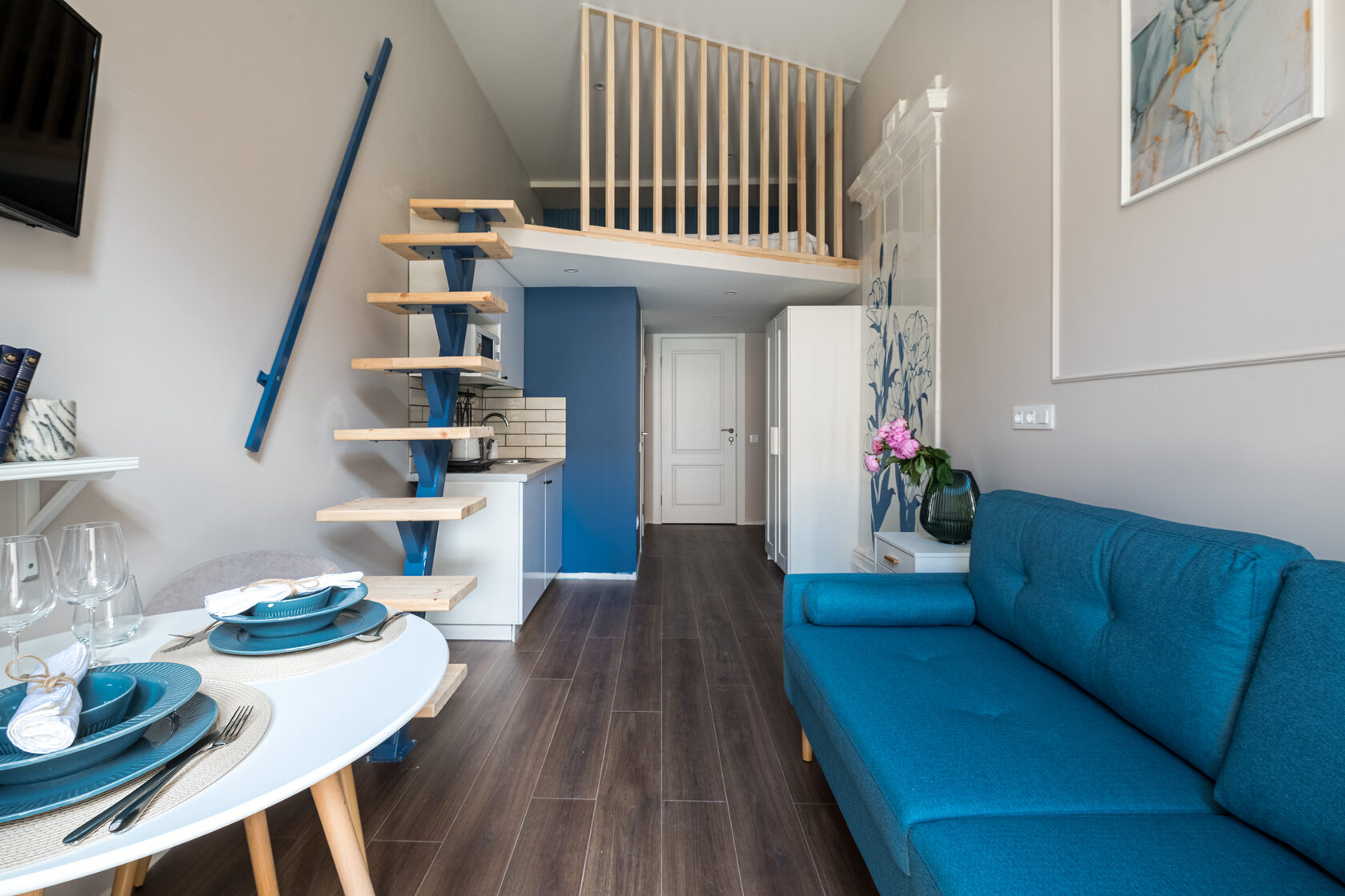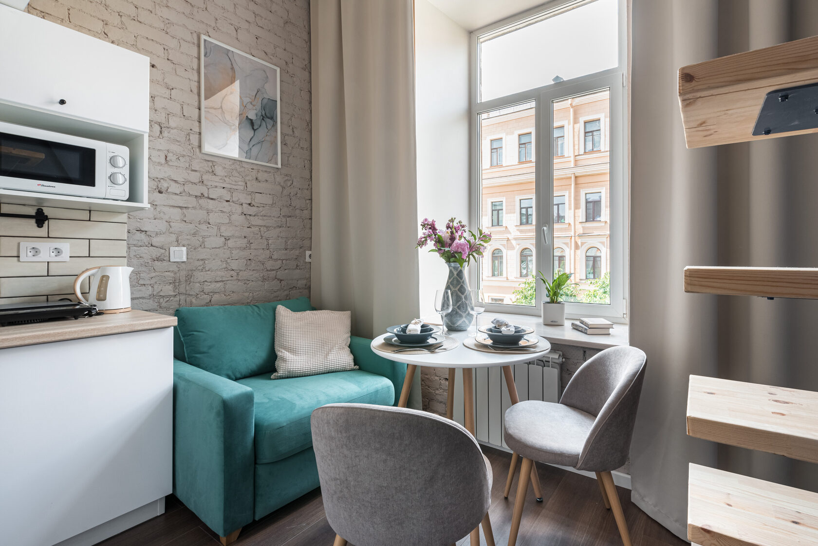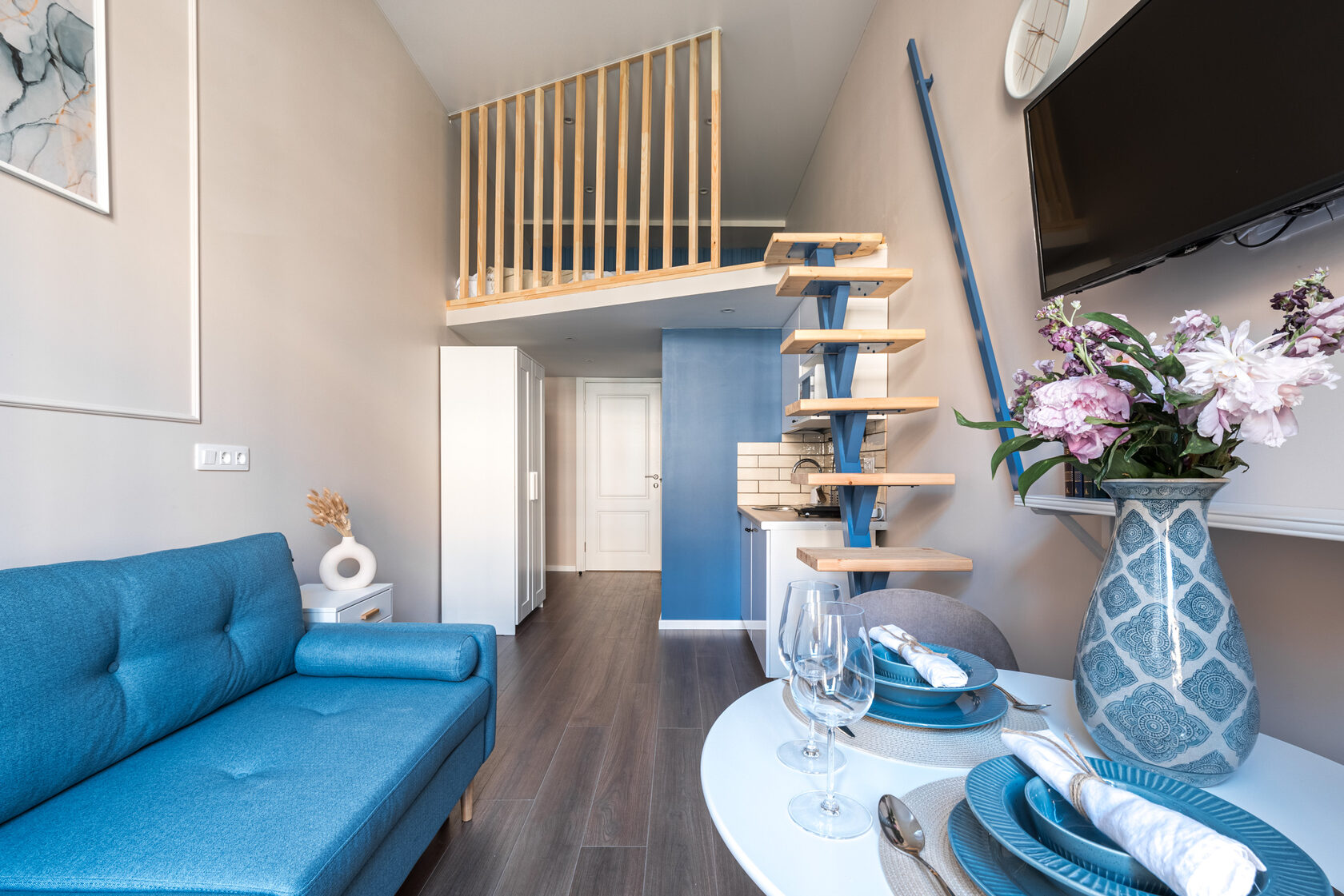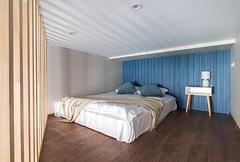 В номере: вешалка, диван, зеркало, кровать двуспальная, прикроватные тумбочки, стол, стулья, шкаф, микроволновая печь, мини-холодильник, набор посуды, плита электрическая, телевизор, электрочайник