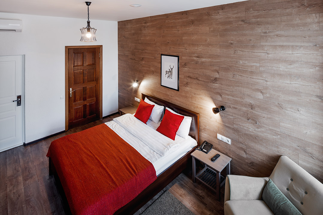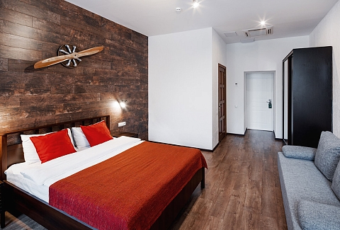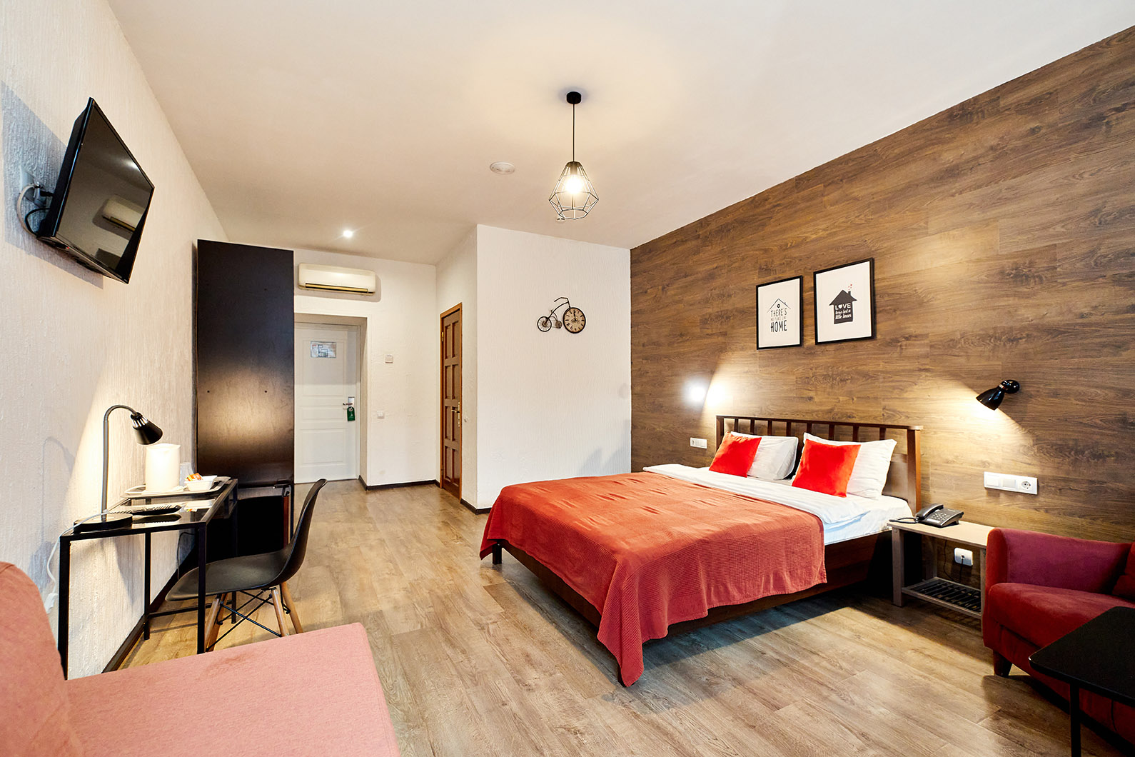 В номере: диван, зеркало, кровать двуспальная, прикроватные тумбочки, стол, стулья, шкаф, гладильная доска, кондиционер, мини-холодильник, сейф, телевизор, чайный набор посуды, электрочайник