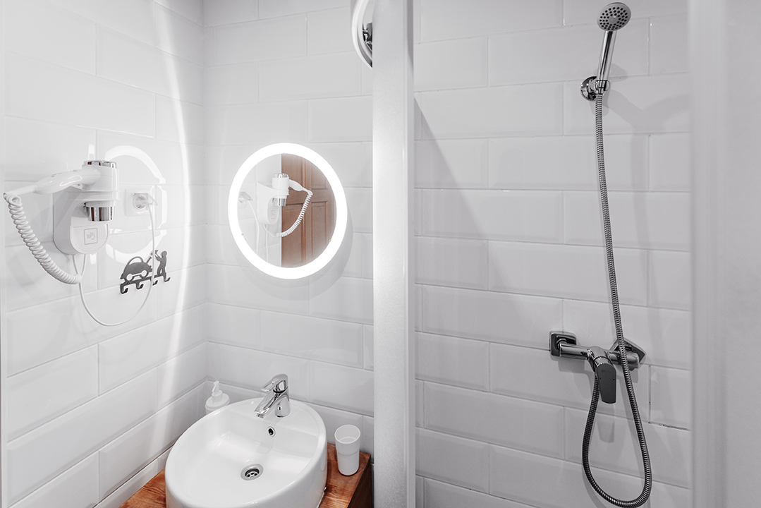 Санузел: с душевой кабиной, тапочки, туалетные принадлежности, фен