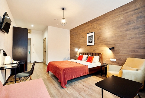 В номере: диван, кресло, кровать двуспальная, прикроватные тумбочки, стол, стул, шкаф, гладильная доска, компьютер, мини-холодильник, сейф, телевизор, чайный набор посуды, электрочайник