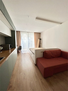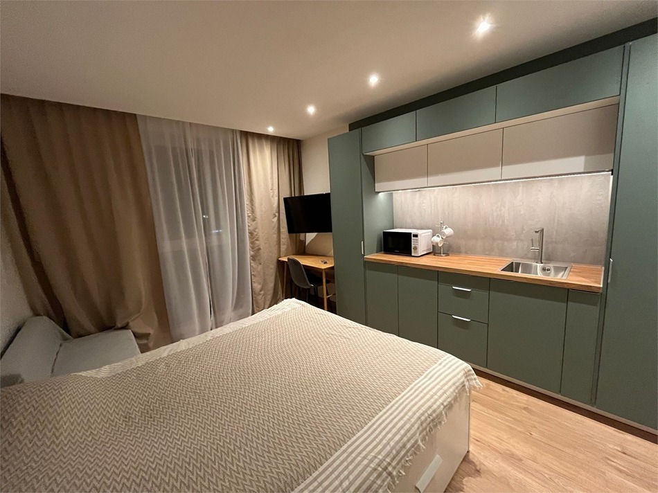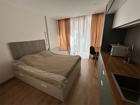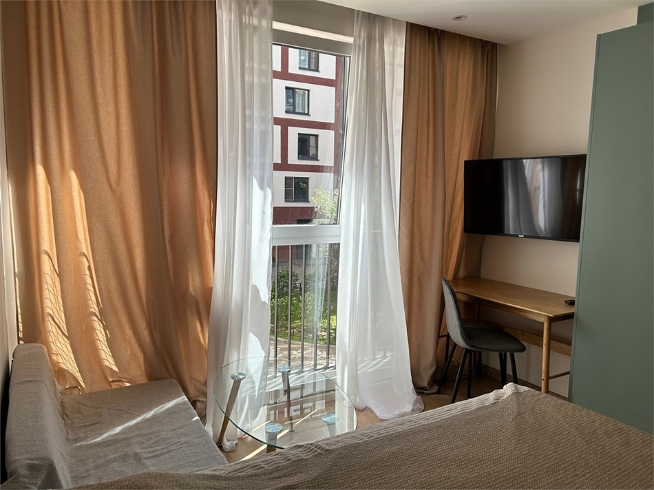 В номере: вешалка, диван раскладной, зеркало, кровать двуспальная, стол, стулья, шкаф, гладильная доска, микроволновая печь, набор посуды, плита электрическая, стиральная машина, сушилка для белья, телевизор, утюг, холодильник, электрочайник