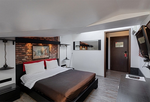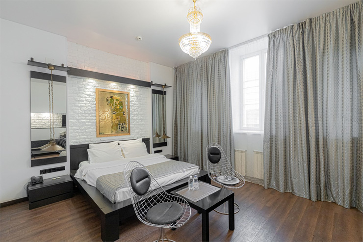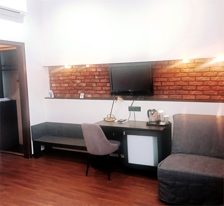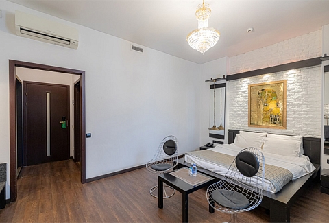 В номере: вешалка, зеркало, кресло-кровать, кровать двуспальная, прикроватные тумбочки, стол, стулья, шкаф, кондиционер, мини-холодильник, сейф, телевизор, телефон, чайная станция, чайный набор посуды