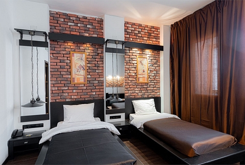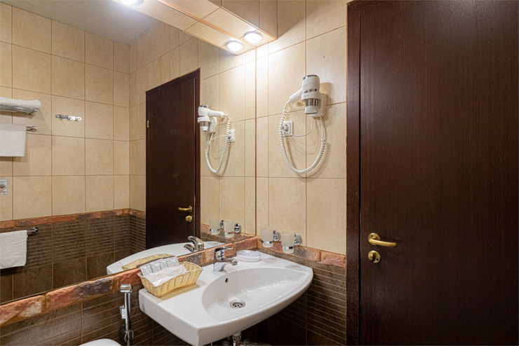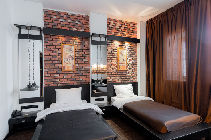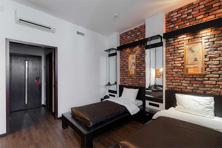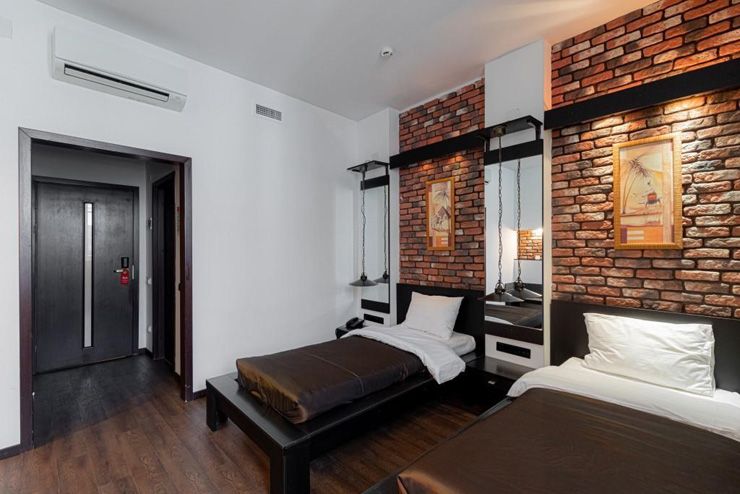 В номере: вешалка, зеркало, кресло-кровать, кровати односпальные, прикроватные тумбочки, стол, стулья, шкаф, кондиционер, мини-холодильник, сейф, телевизор, телефон, чайная станция, чайный набор посуды