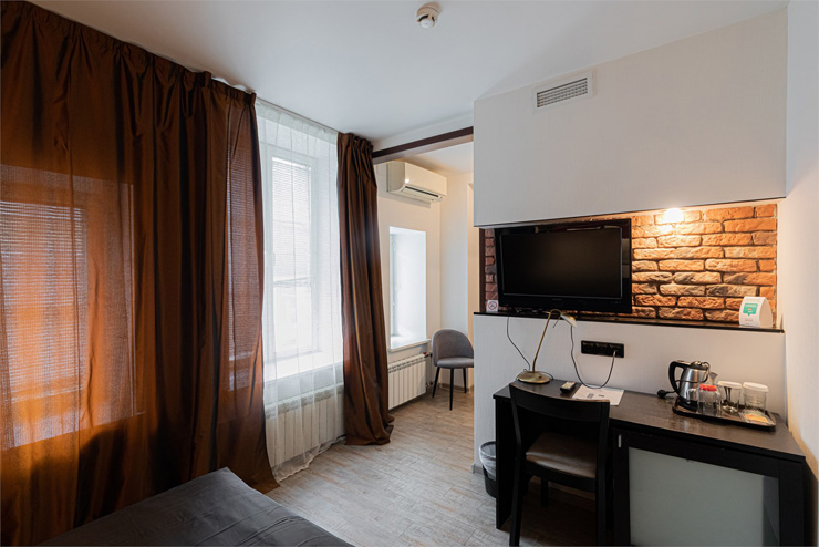 В номере: вешалка, зеркало, кровати односпальные, прикроватная тумбочка, стол, стулья, шкаф, кондиционер, мини-холодильник, сейф, телевизор, телефон, чайная станция, чайный набор посуды
