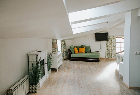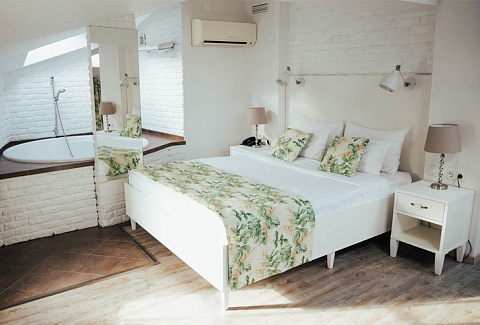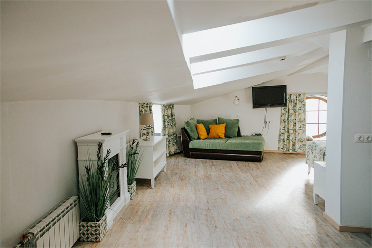 В номере: вешалка, диван, диван раскладной, зеркало, кровать двуспальная, прикроватные тумбочки, стол, стулья, шкаф, камин, кондиционер, кофемашина, мини-холодильник, сейф, телевизор, телефон, чайная станция, чайный набор посуды