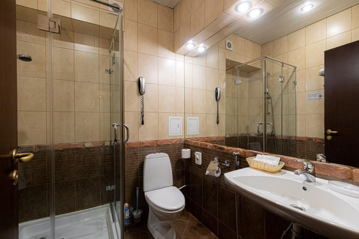 Санузел: с душем, тапочки, теплый пол, туалетные принадлежности, фен