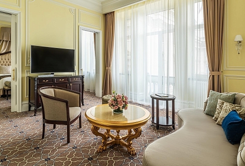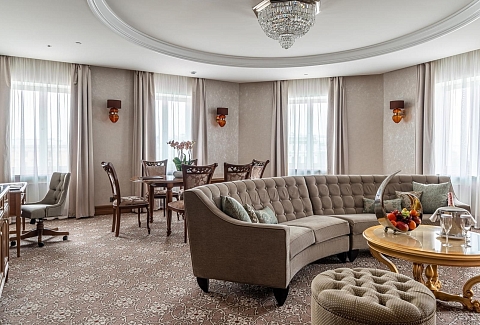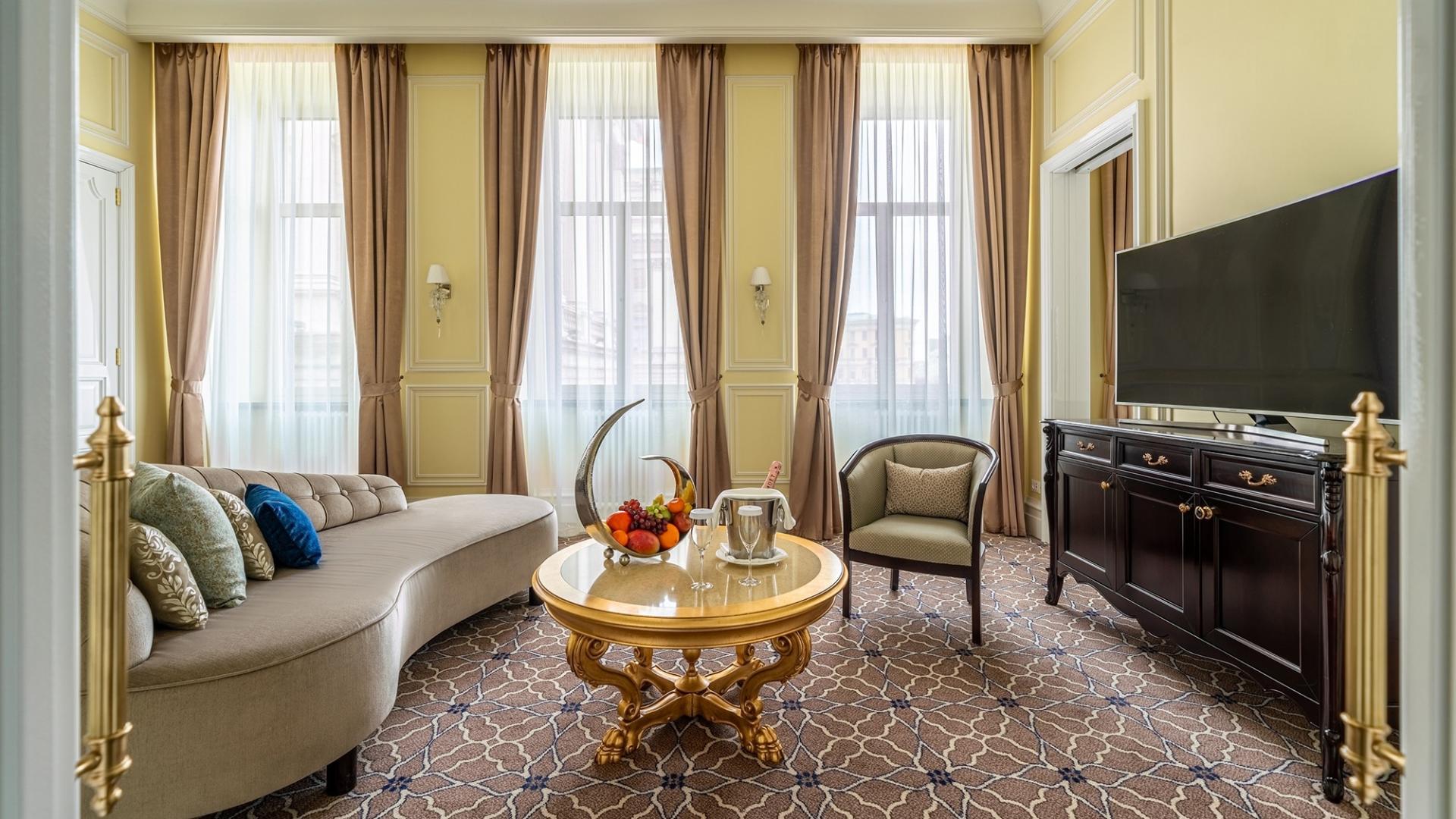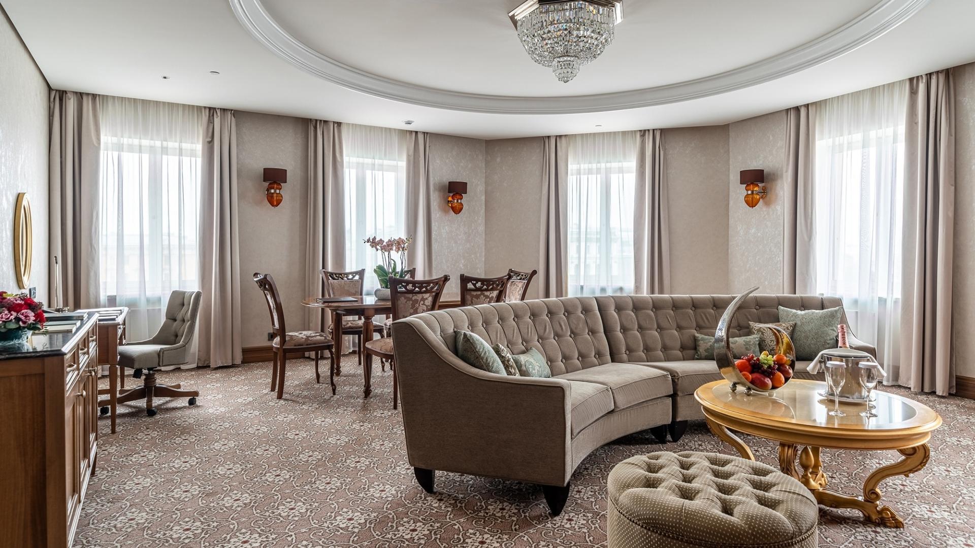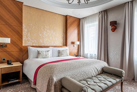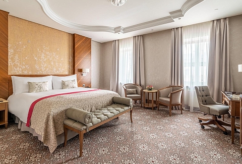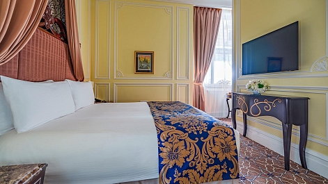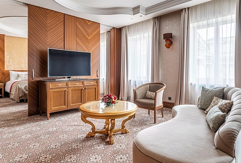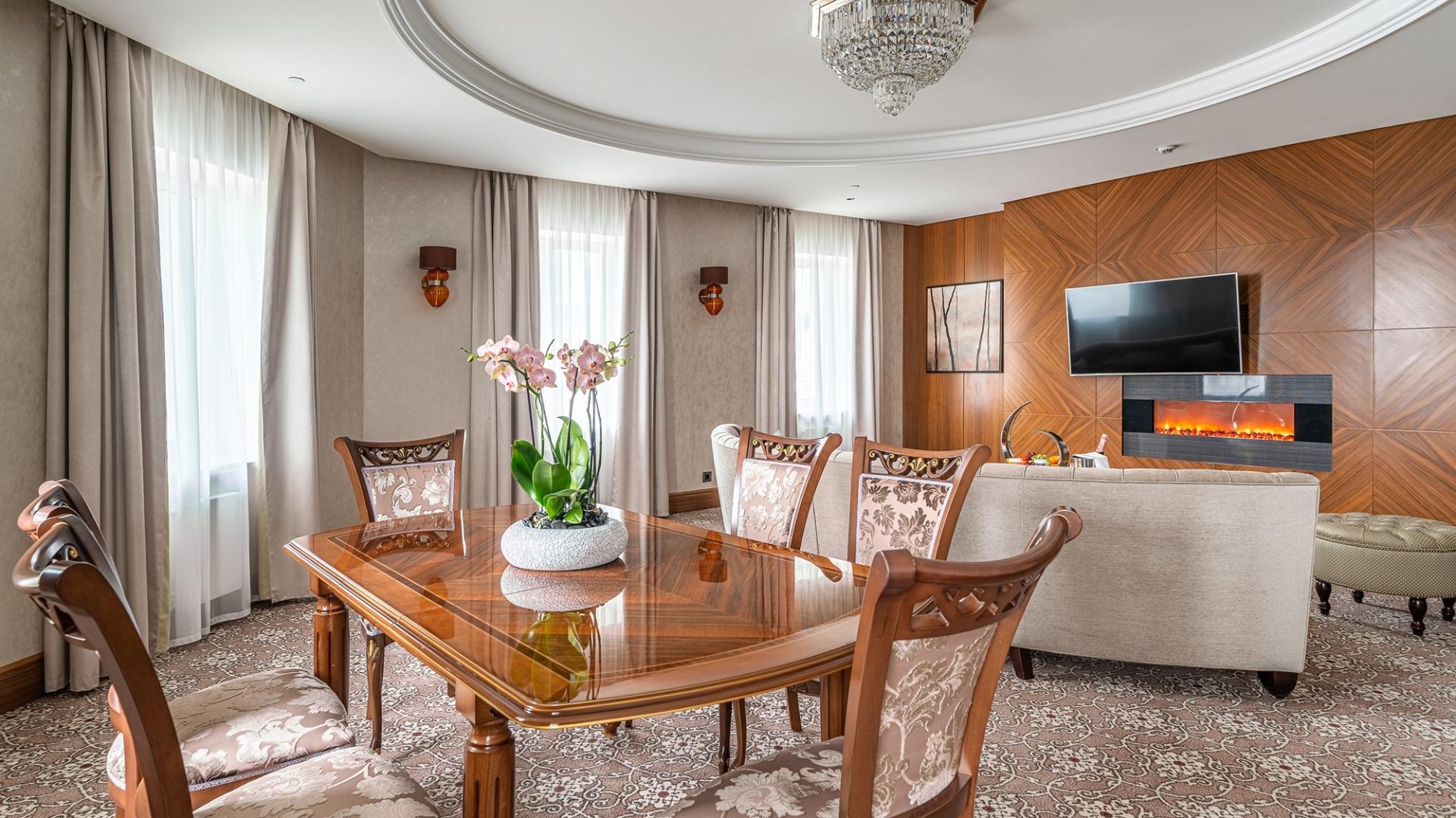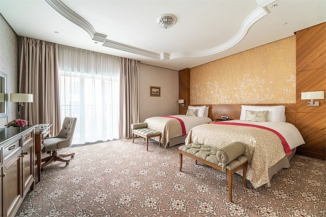 В номере: вешалка, диван, зеркало, кровать двуспальная, прикроватные тумбочки, стол, стулья, шкаф, кофемашина, мини-холодильник, телевизор