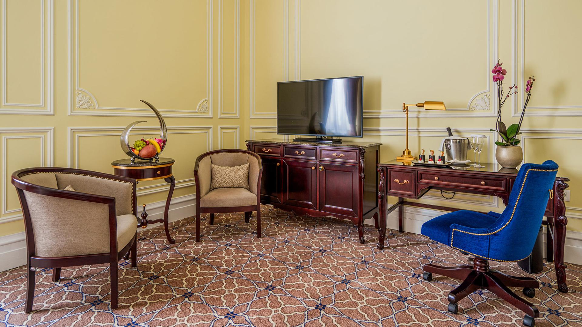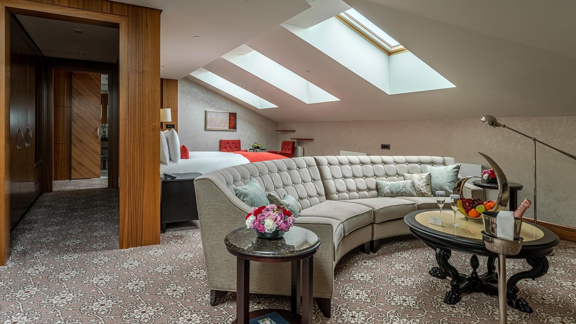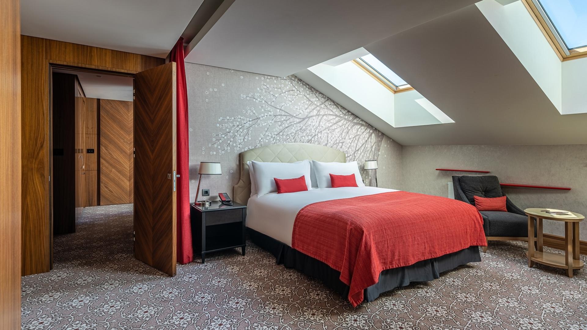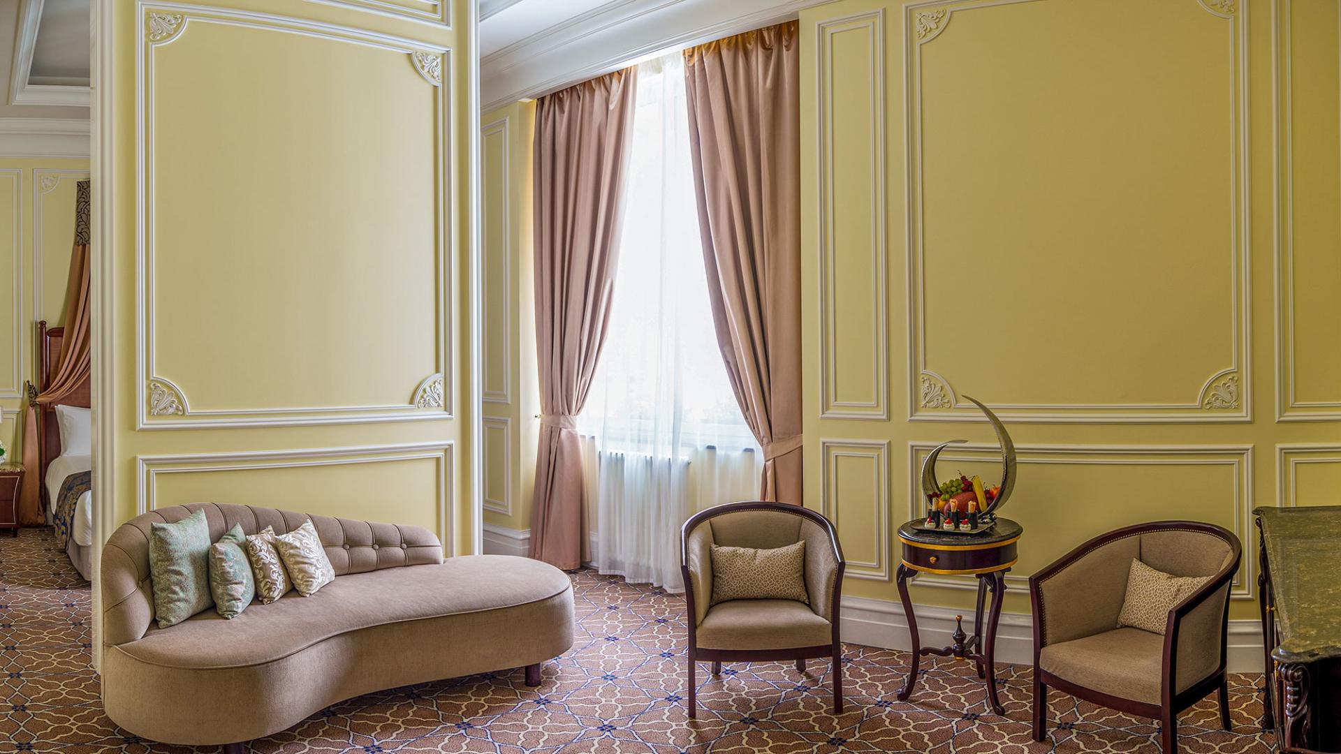 В номере: вешалка, диван, зеркало, кровать двуспальная, прикроватные тумбочки, стол, стулья, шкаф, кофемашина, мини-холодильник, телевизор