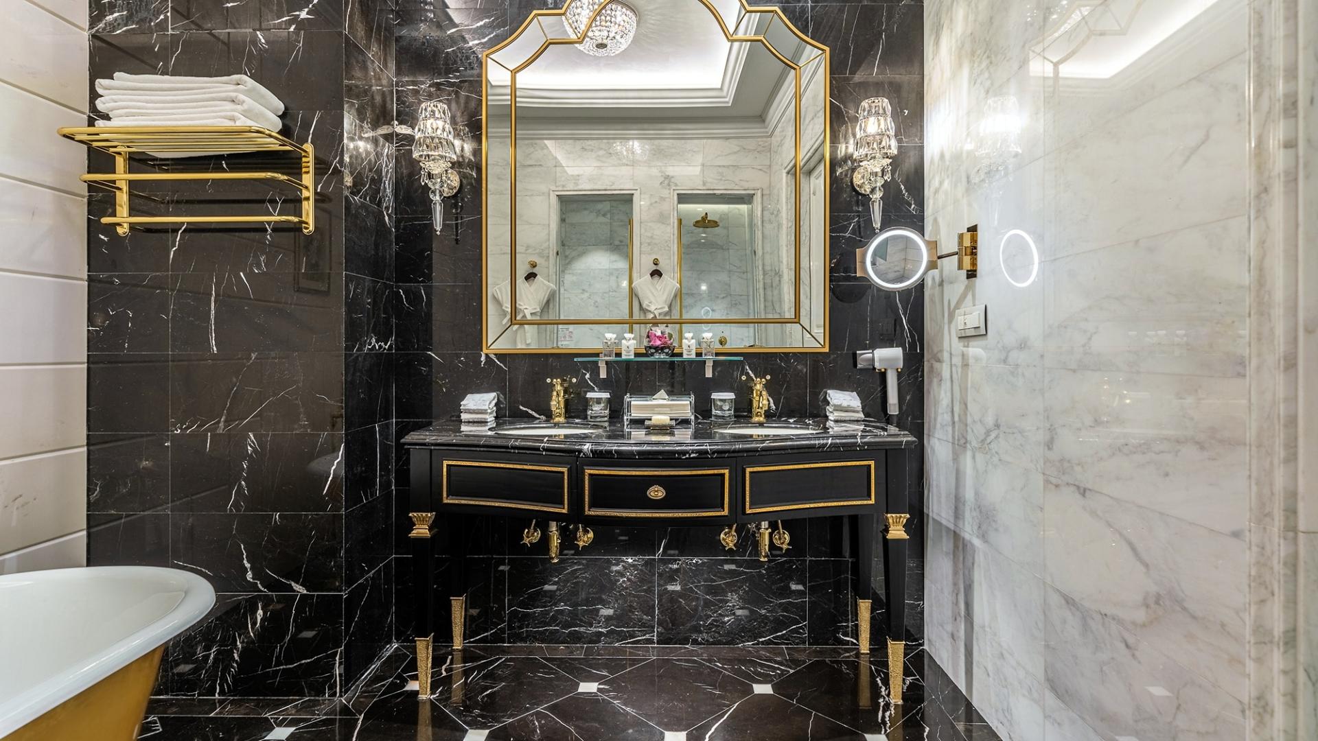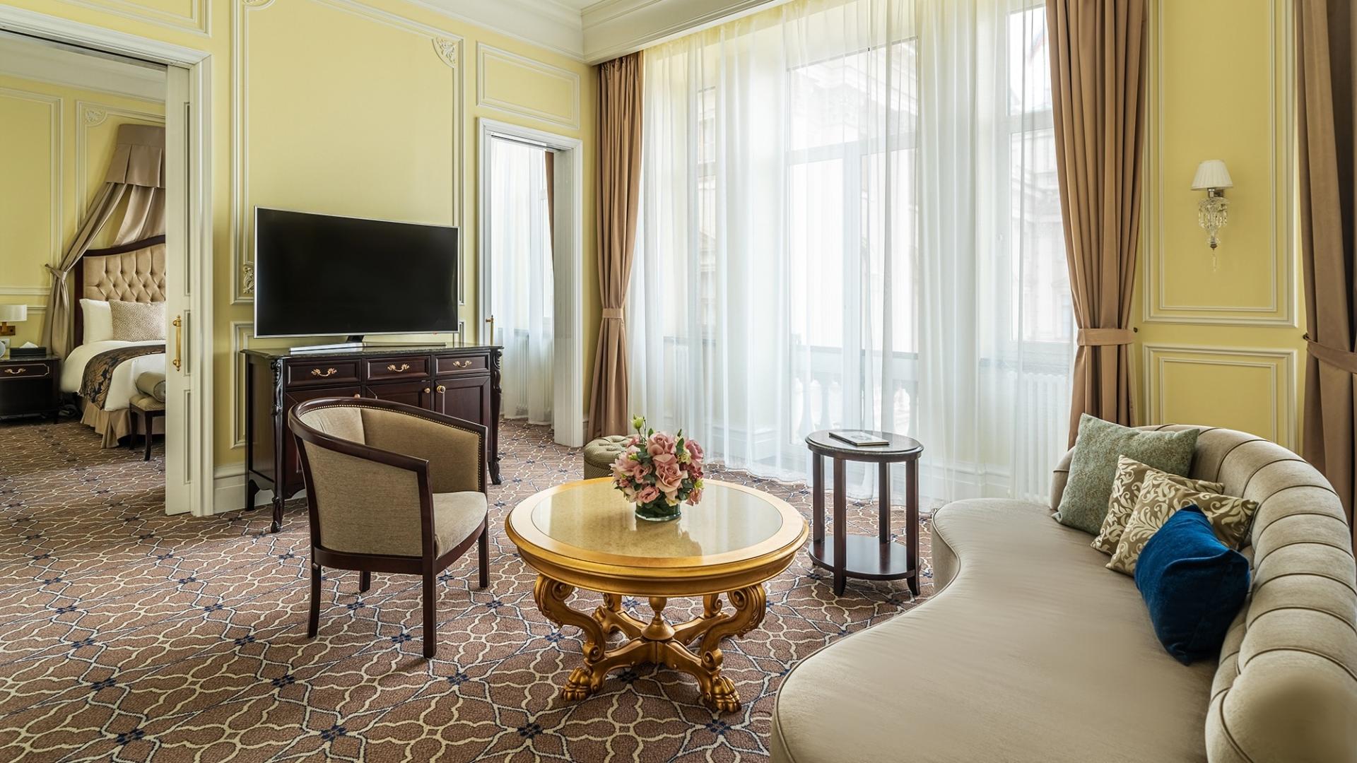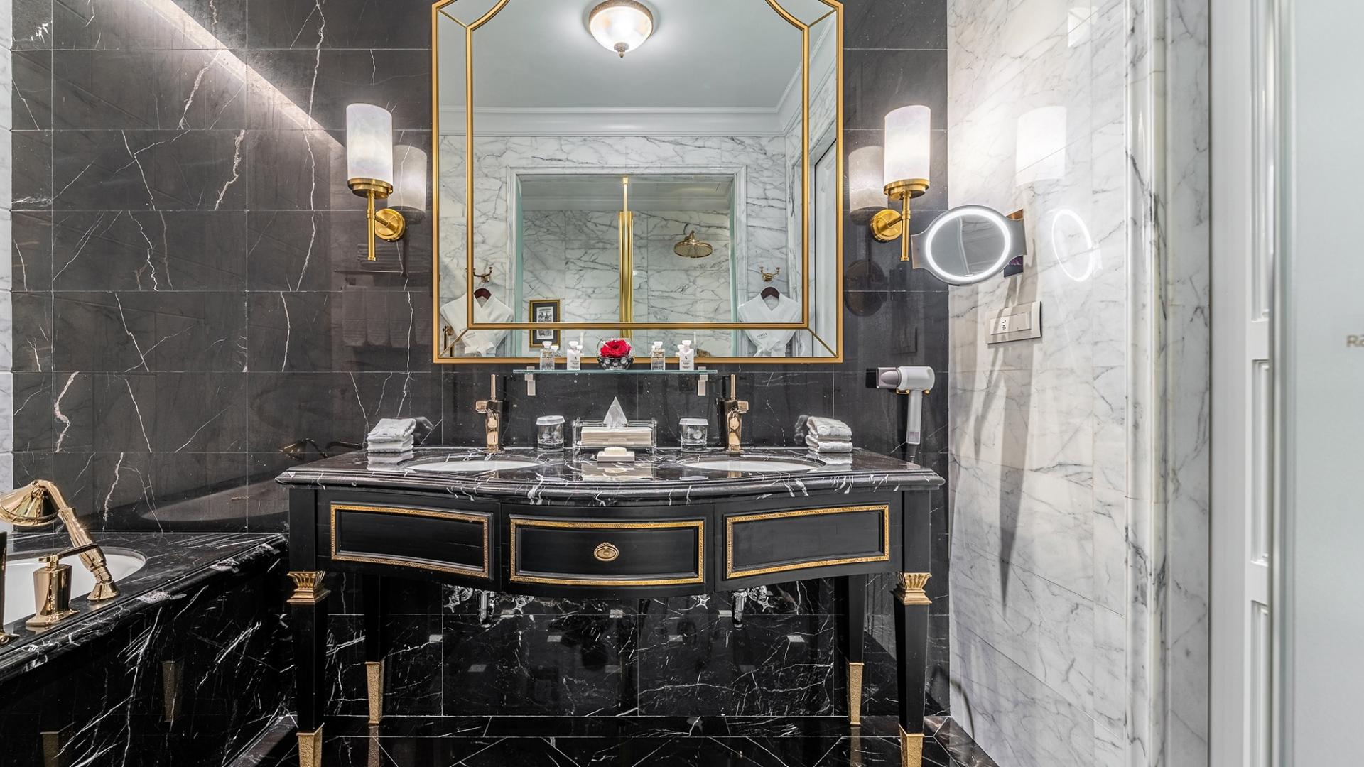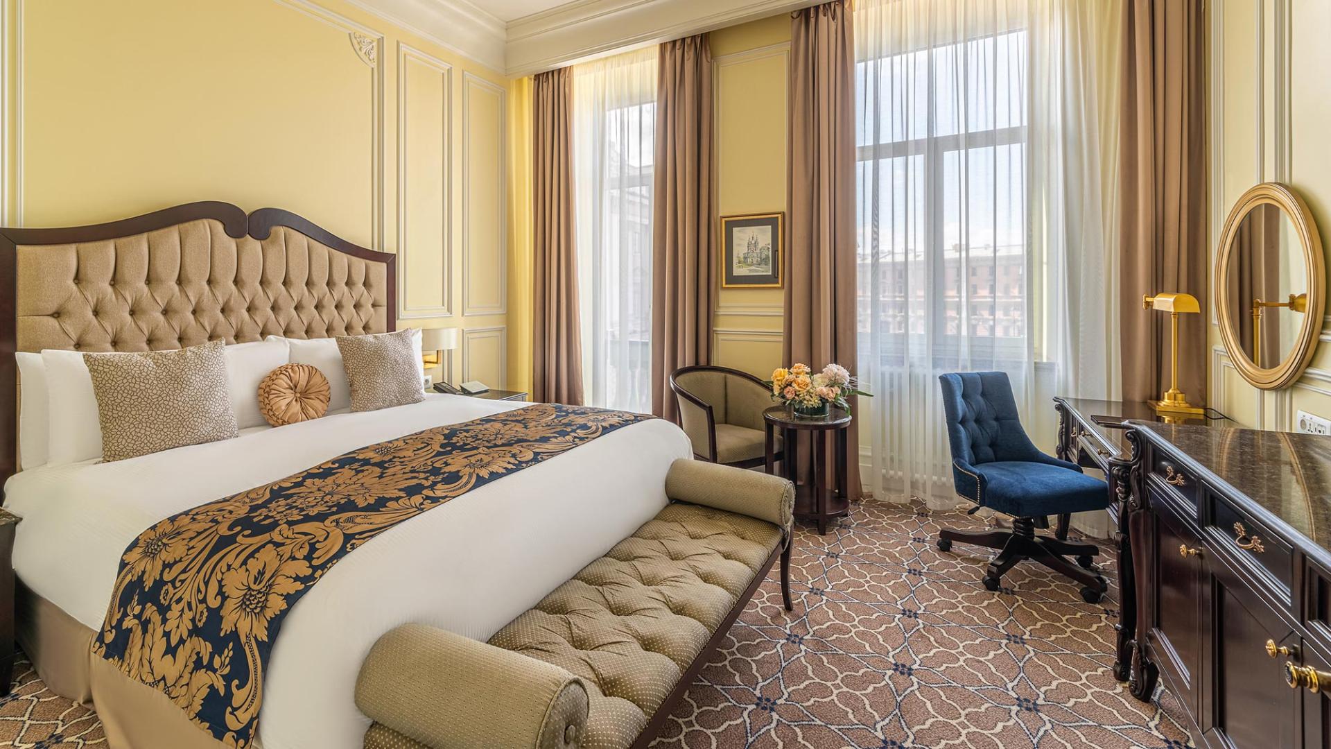 В номере: вешалка, диван, зеркало, кровать двуспальная, прикроватные тумбочки, стол, стулья, шкаф, кофемашина, мини-холодильник, телевизор