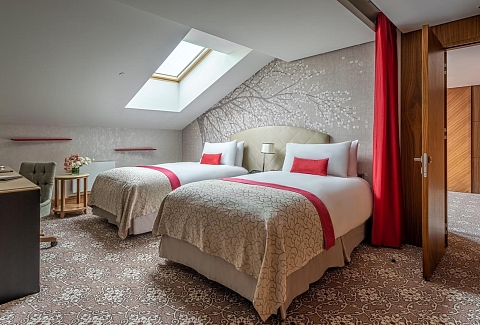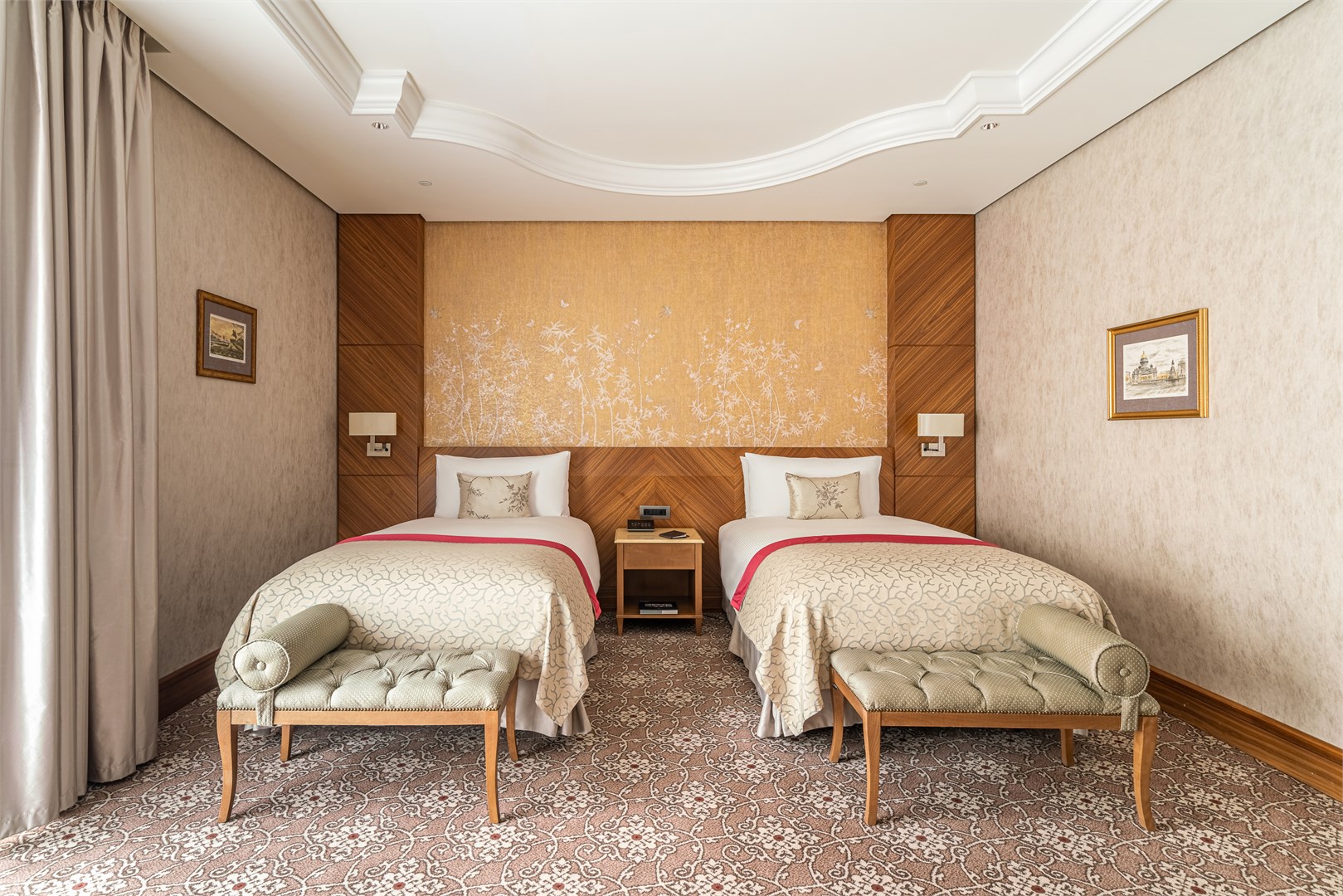 В номере: вешалка, зеркало, кровати односпальные, прикроватные тумбочки, стол, стулья, шкаф, кофемашина, мини-холодильник, телевизор