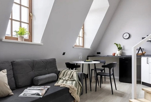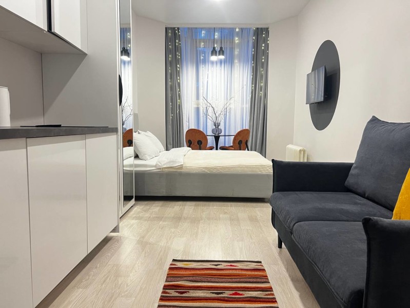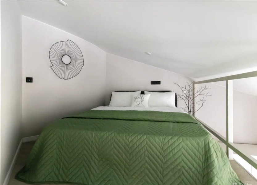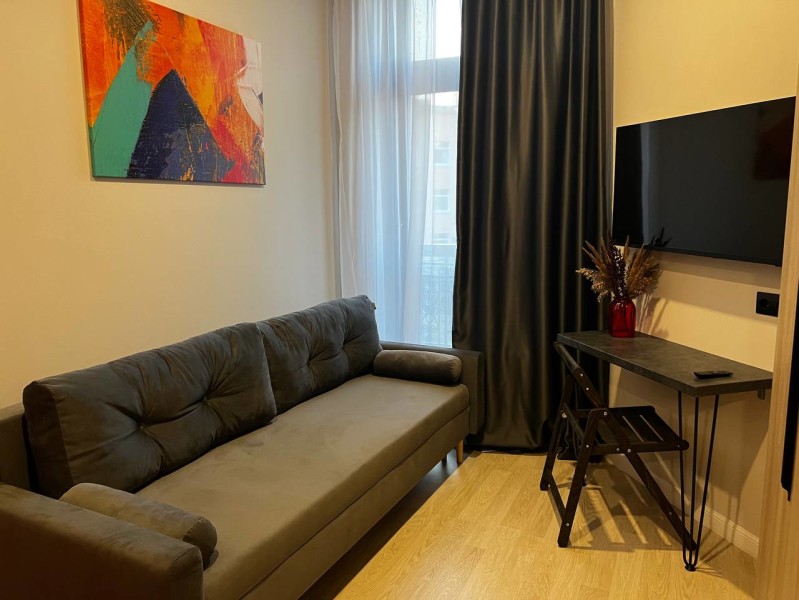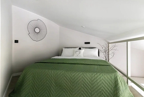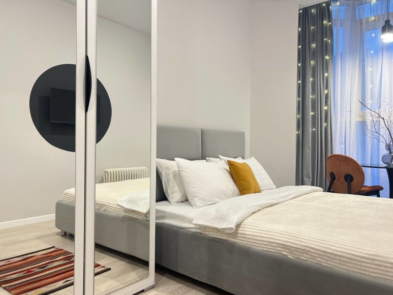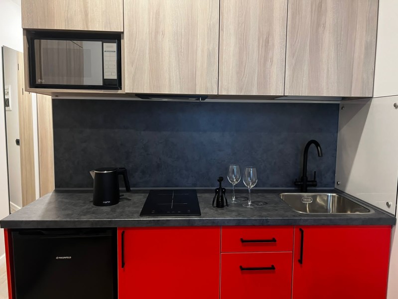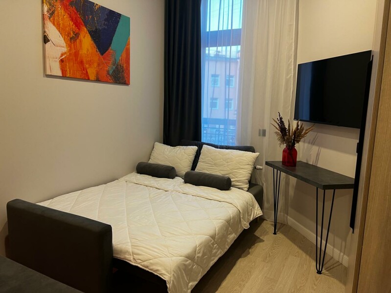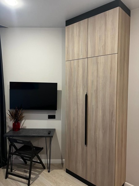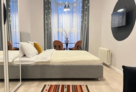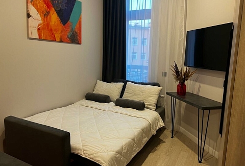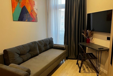 В номере: вешалка, диван раскладной, зеркало, кровать двуспальная, стол, стулья, шкаф, микроволновая печь, мини-холодильник, набор посуды, плита электрическая, стиральная машина, телевизор, утюг, электрочайник