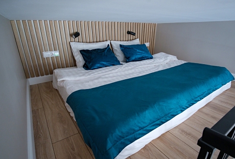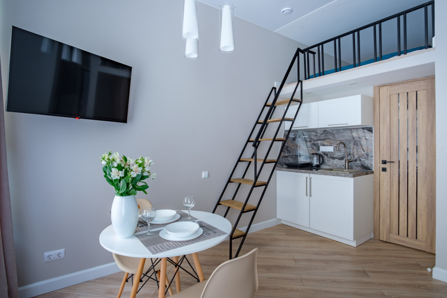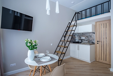 В номере: вешалка, диван раскладной, зеркало, матрас, стол, стулья, шкаф, гладильная доска, микроволновая печь, мини-холодильник, набор посуды, плита электрическая, стиральная машина, сушилка для белья, телевизор, утюг, холодильник, электрочайник