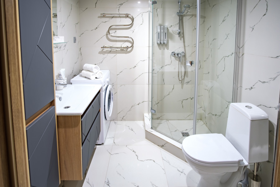 Санузел: с душем, тапочки, туалетные принадлежности, фен