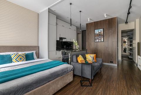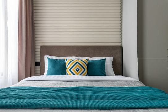 В номере: диван, кровать двуспальная, стол, стулья, шкаф, гладильная доска, духовой шкаф, микроволновая печь, набор посуды, плита электрическая, посудомоечная машина, стиральная машина, телевизор, утюг, холодильник, электрочайник