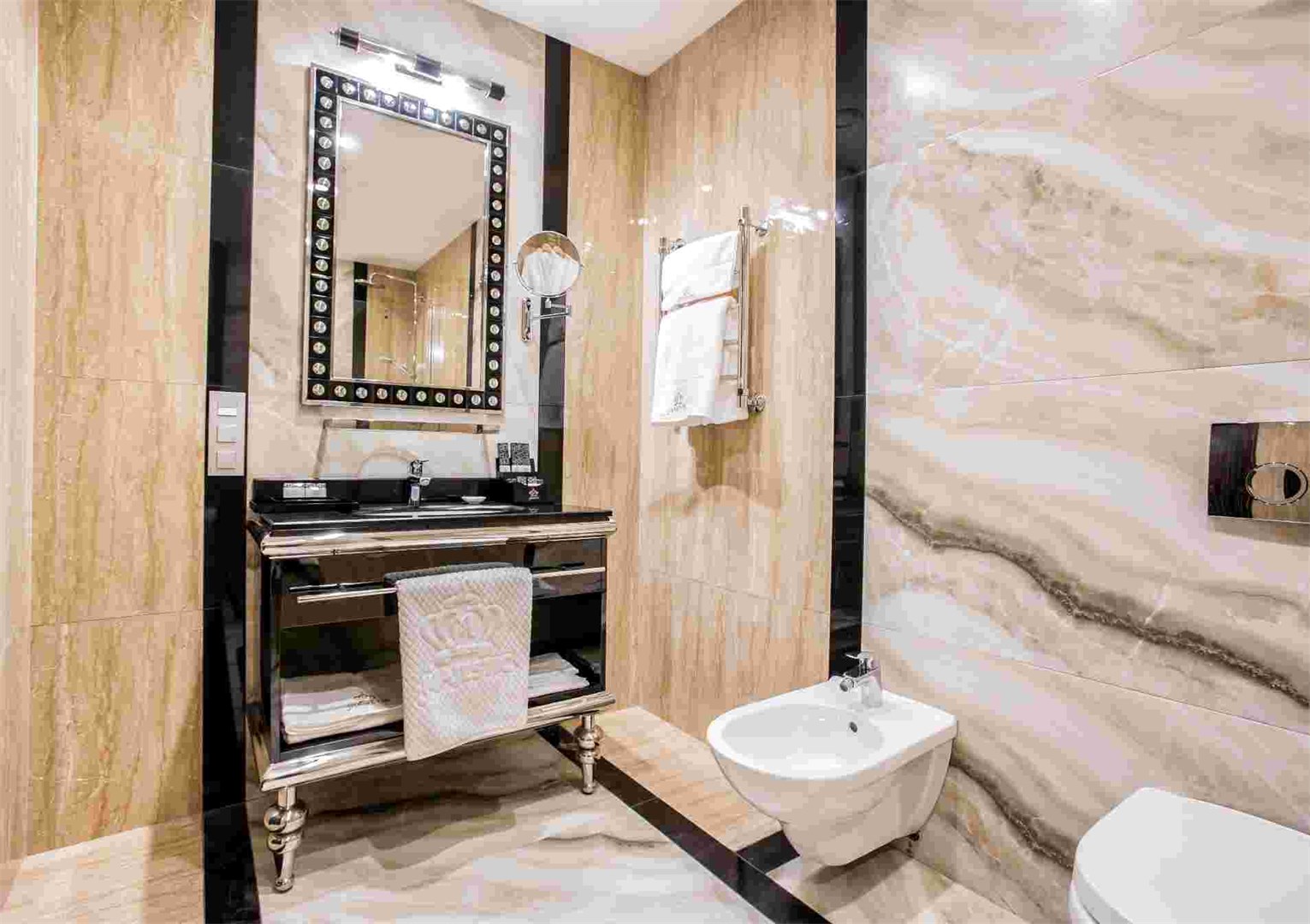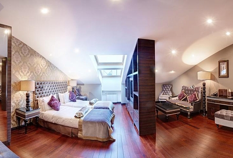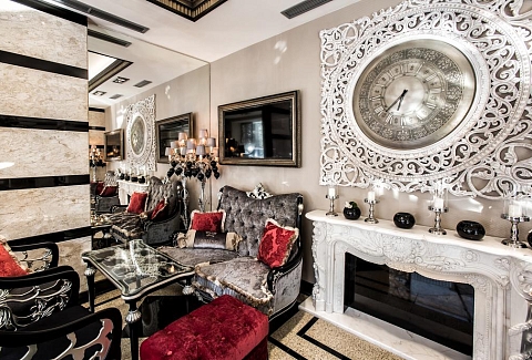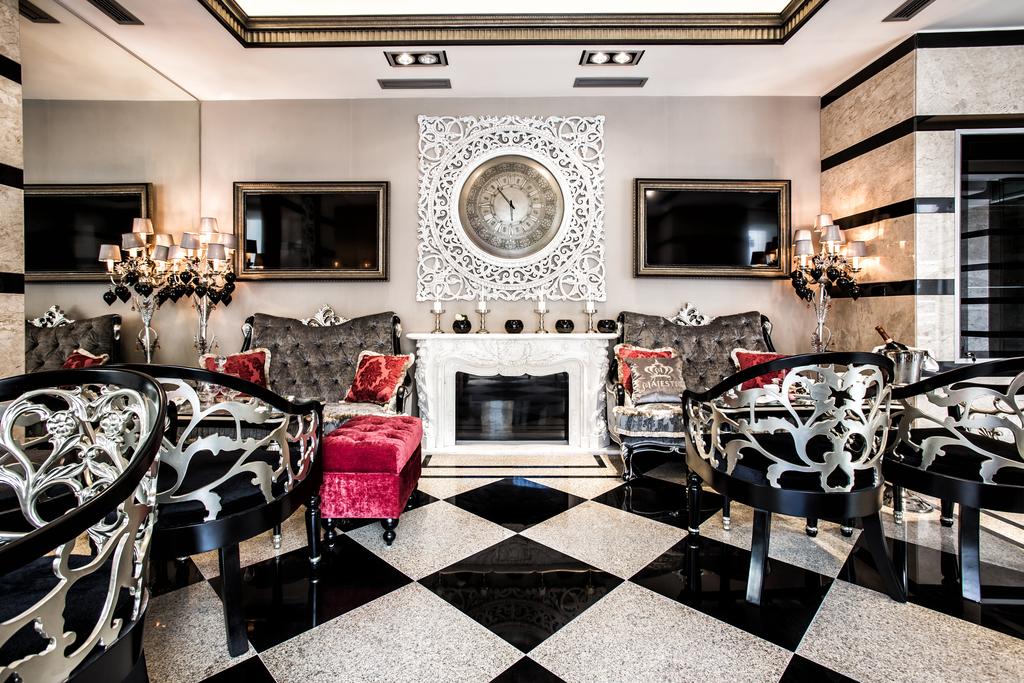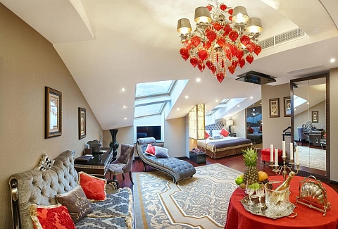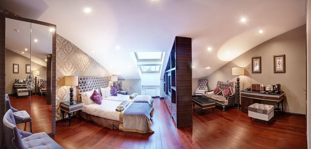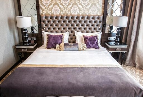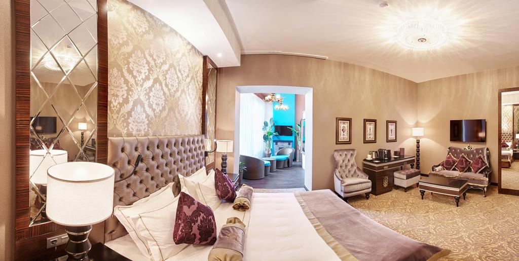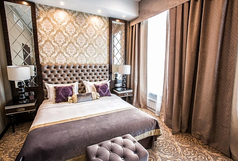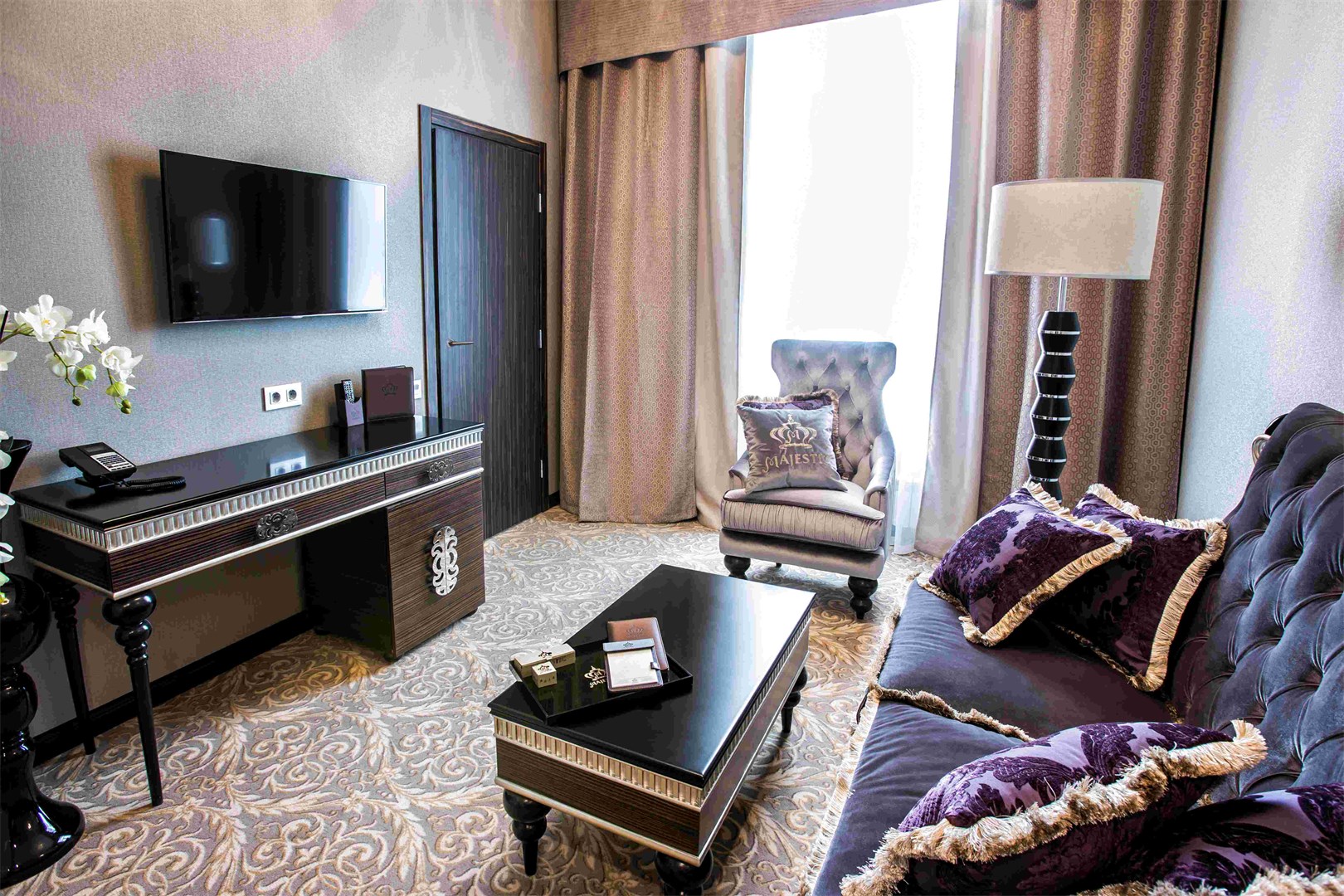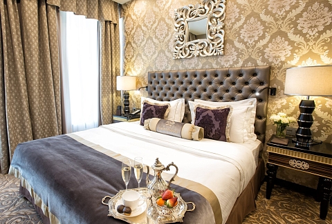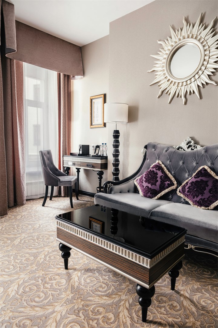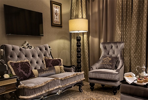В номере: диван, зеркало, кровать двуспальная, набор мягкой мебели, прикроватные тумбочки, стол, стул, шкаф, кофемашина, мини-холодильник, сейф, система общего кондиционирования, телевизор ЖК, телефон, чайная станция