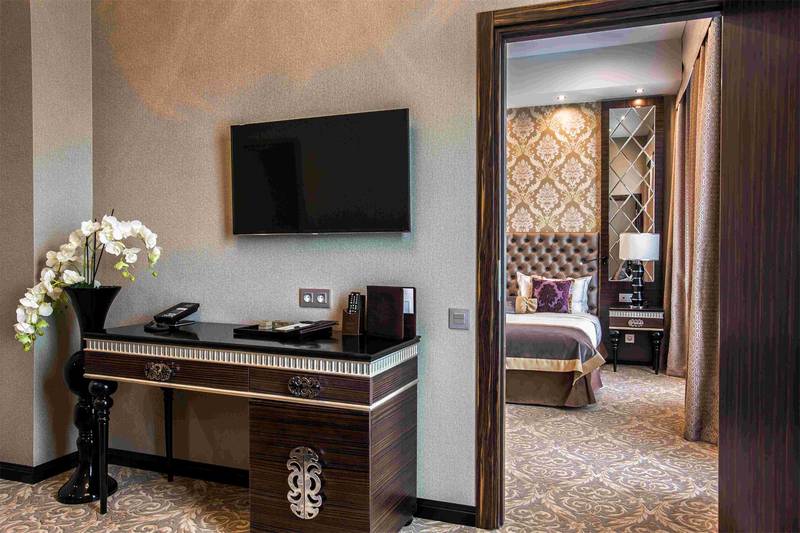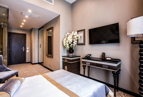 В номере: зеркало, кровать двуспальная, набор мягкой мебели, прикроватные тумбочки, стол, стул, шкаф, кофемашина, мини-холодильник, сейф, система общего кондиционирования, телевизор ЖК, телефон, чайная станция